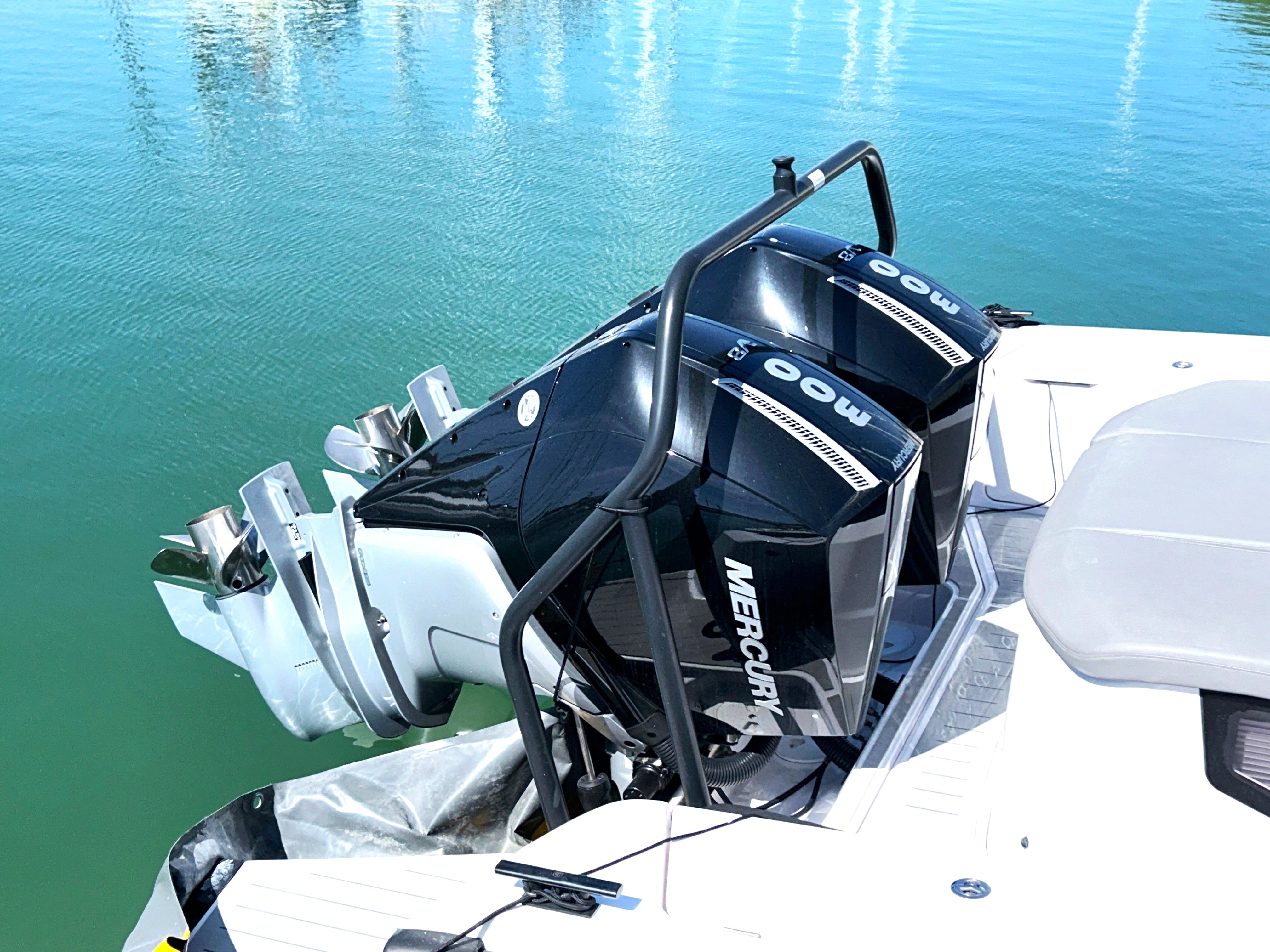 Twin Black Mercury 800 HP V8 outboard engines 2025 with standard 2 plus additional 3 year optional warranty subject to confirmation by Holes Bay Marine Poole.