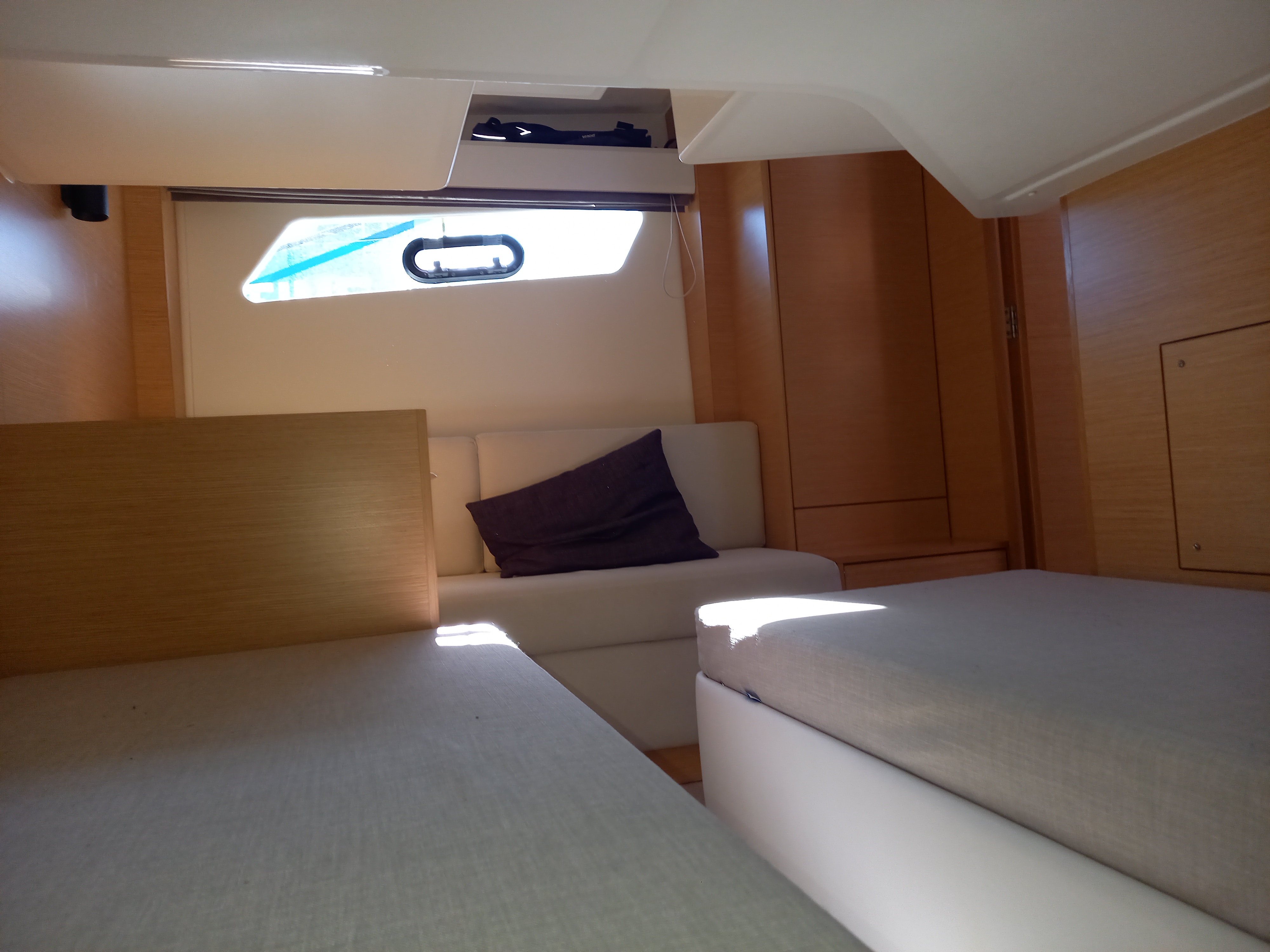 Aft cabin with twin berths, overhead reading light and port side linear seating and storage cupboards with opening portlights