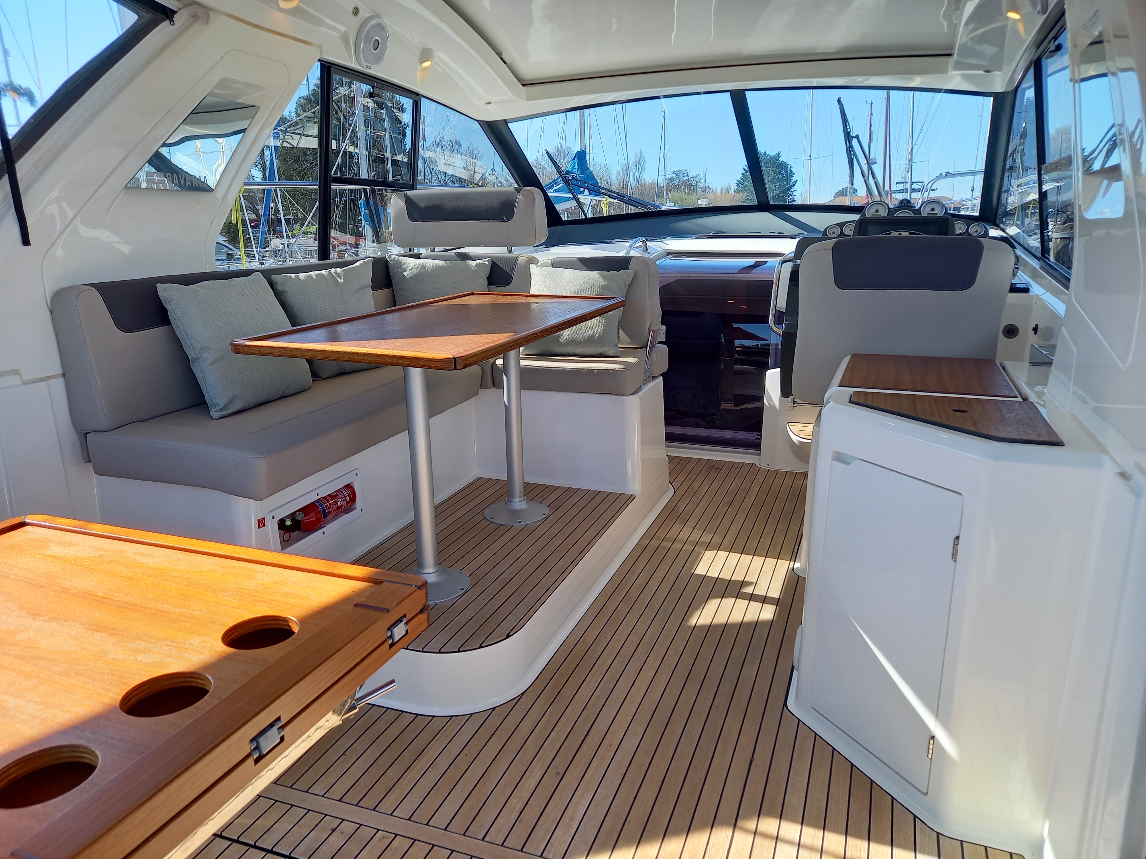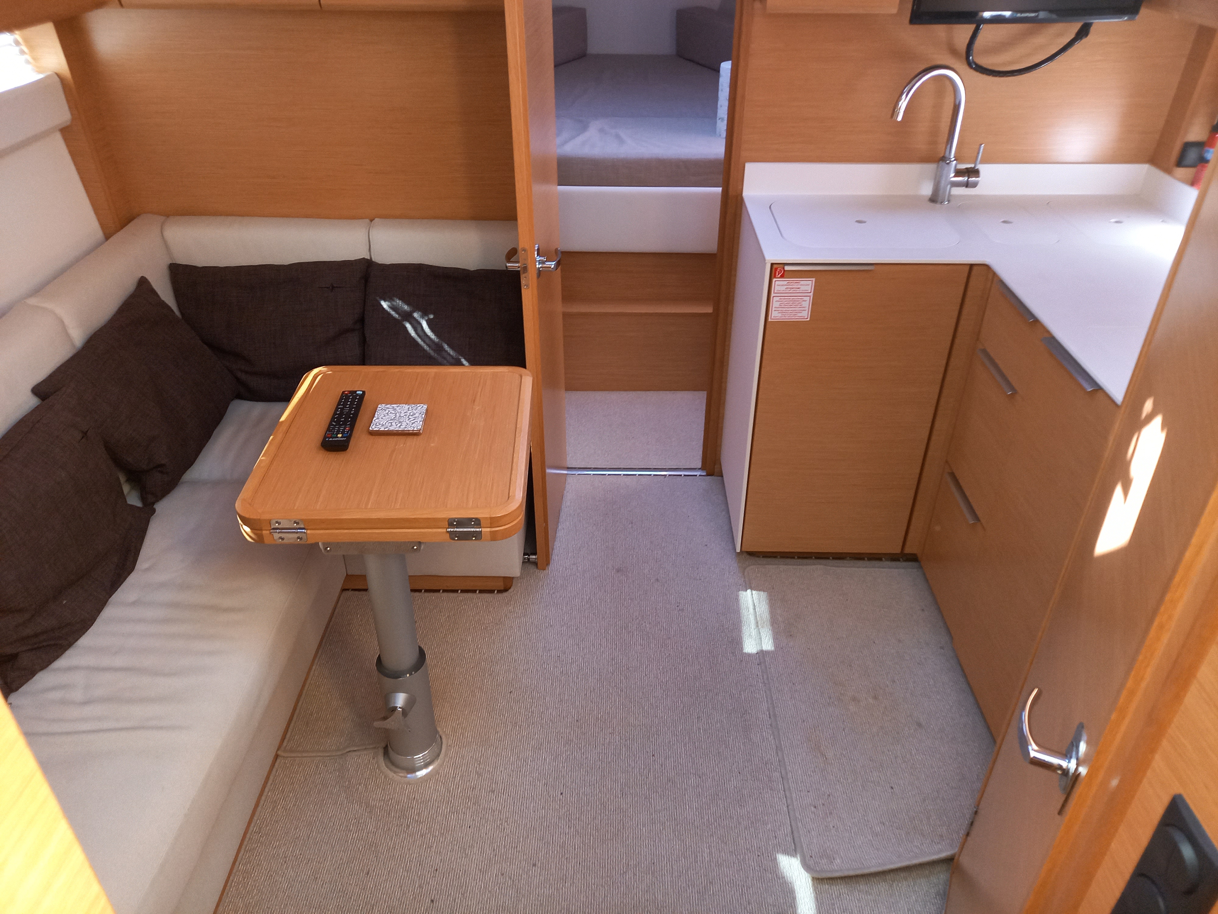 Saloon with L-shaped seating with storage, Drop down table with overhead hatch and through-hull windows c/w blinds on all hatches and windows and overhead storage cupboards