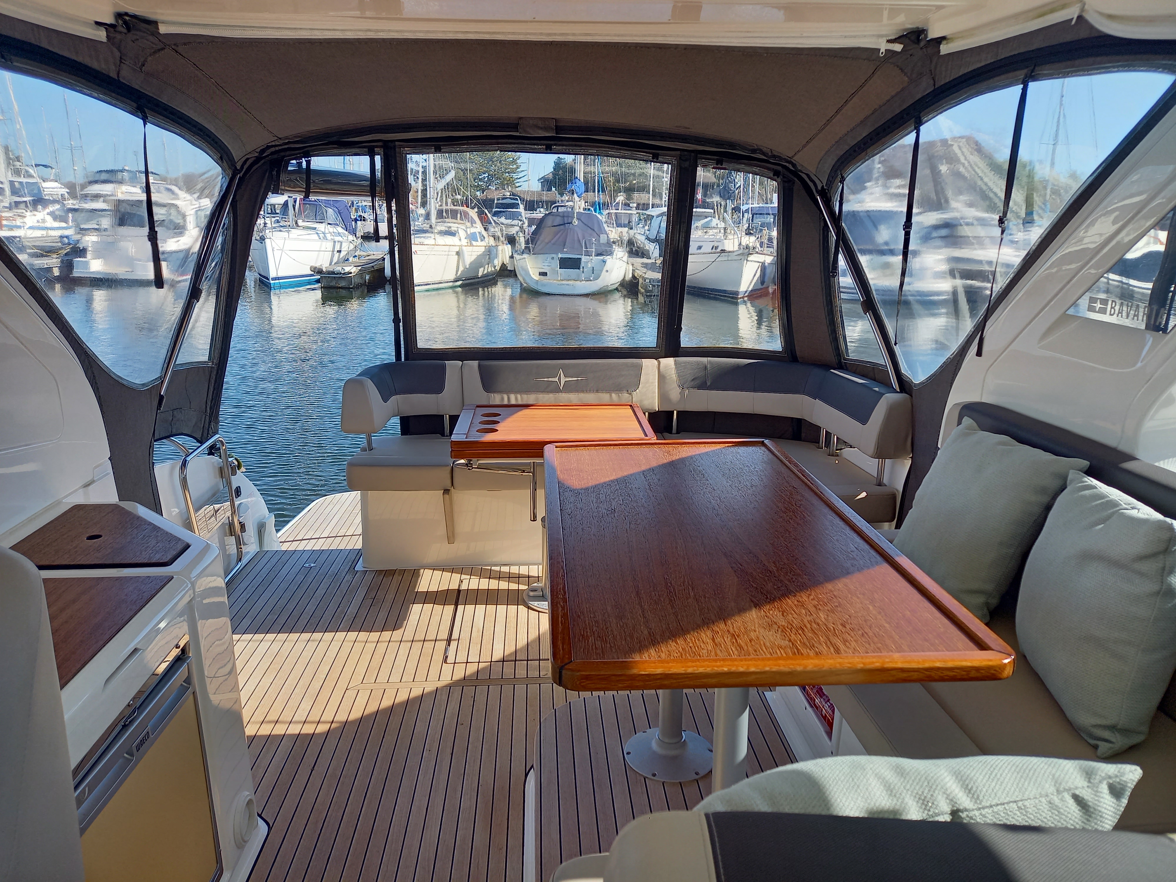 This well equipped 2015 Bavaria Sport 360HT offers a spacious layout including space to sleep four in a light wood interior, large heads with shower and electric toilet and galley which includes a twin burner hob, microwave, 12/24v fridge and overhead storage. Other extras include chart plotter, AIS, VHF, fusion sound system and Webasto heating. Powered by twin Volvo Penta D3-220hp diesels, she comes with joystick control and side power bow thruster and sits on twin outdrives and duo props making her easy to manoeuvre.