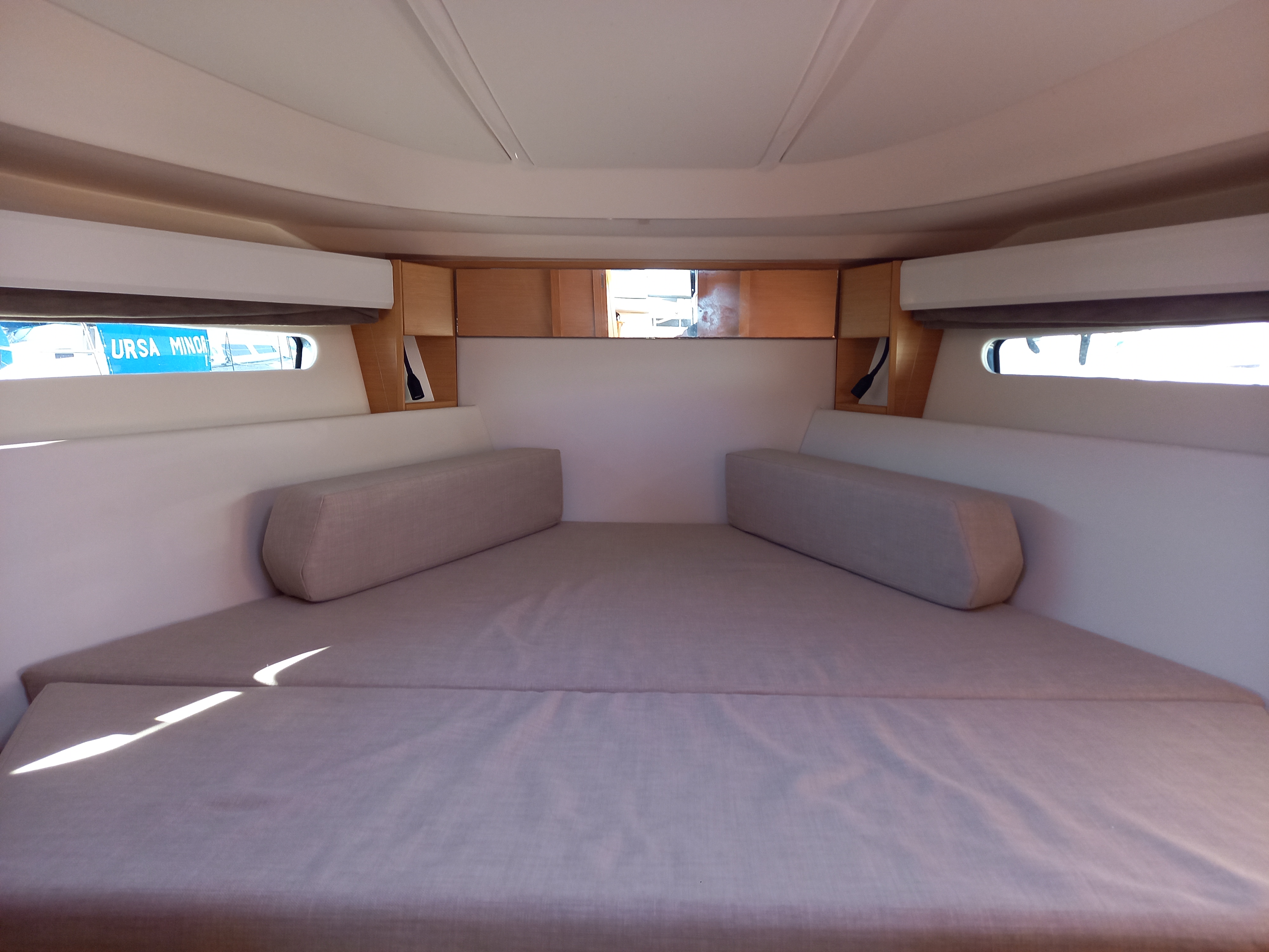 Master cabin forward with centreline double berth with reading lights, wardrobe and cupboard c/w opening deck hatch and port lights. Blinds to all hatches and windows and 240v AC outlets