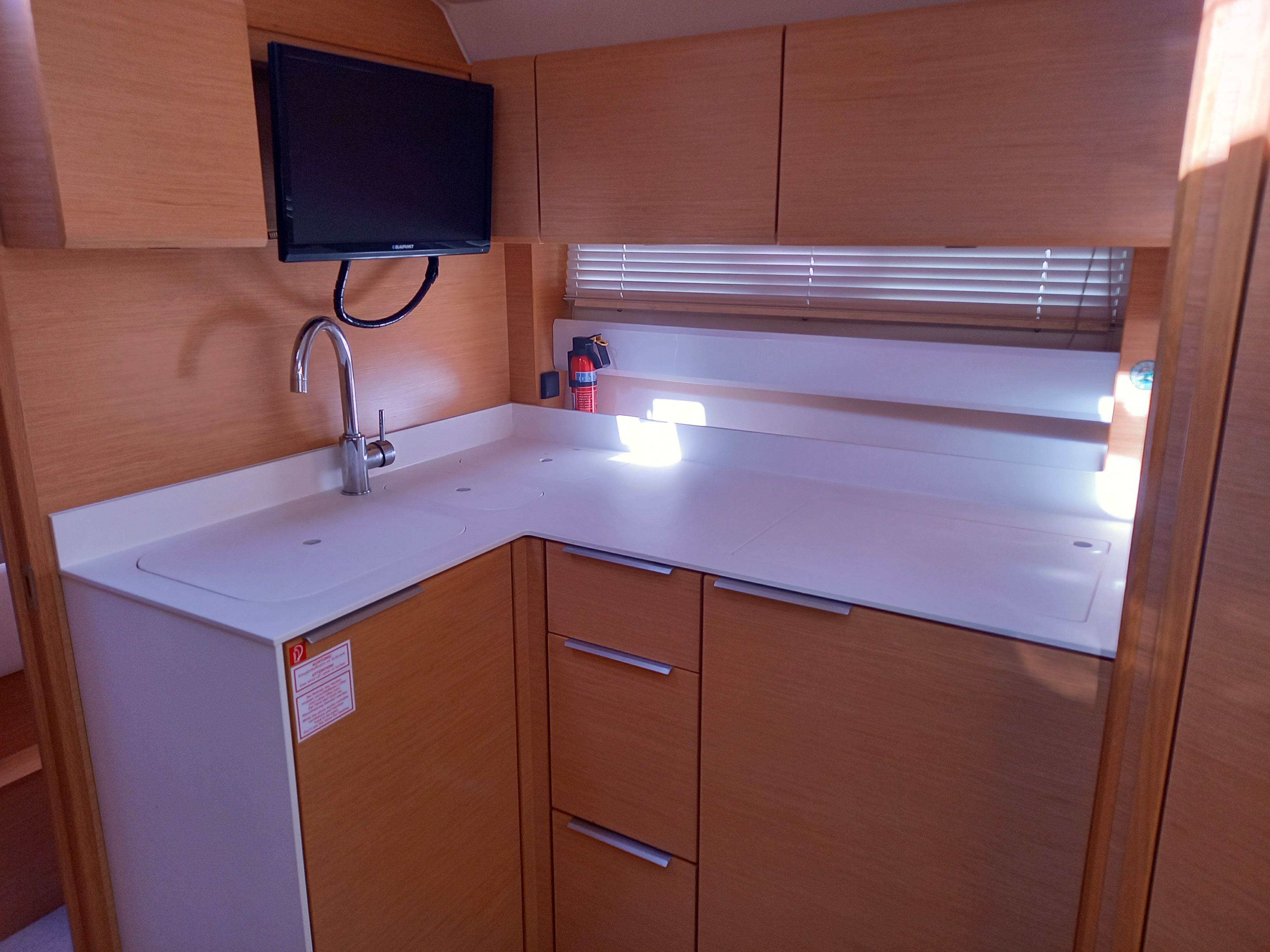 Galley with twin burner gas hob and Waeco fridge with freezer compartment, microwave, overhead storage and twin stainless steel sink and storage cupboards and drawers