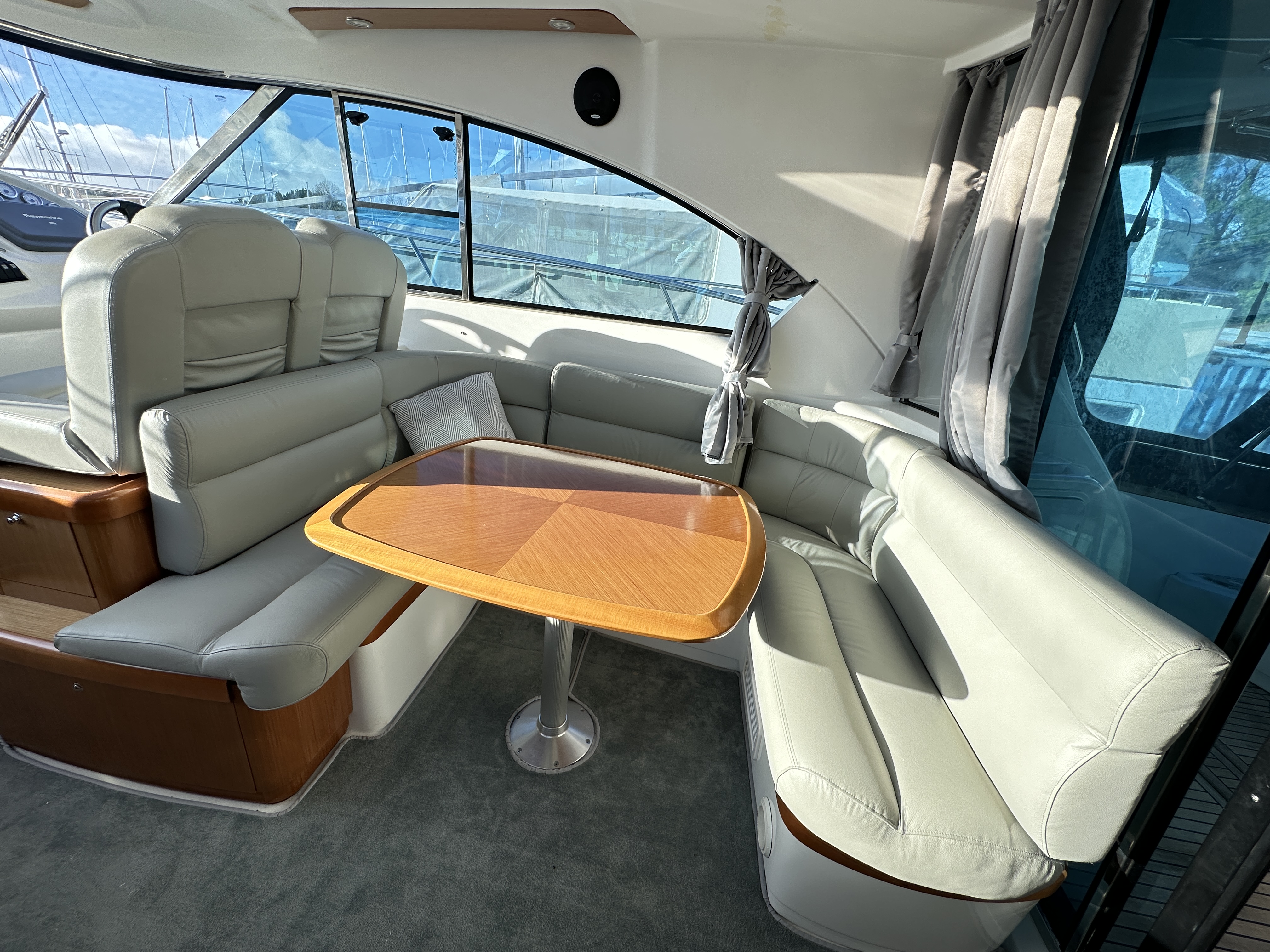 U-shaped seating and table to starboard.