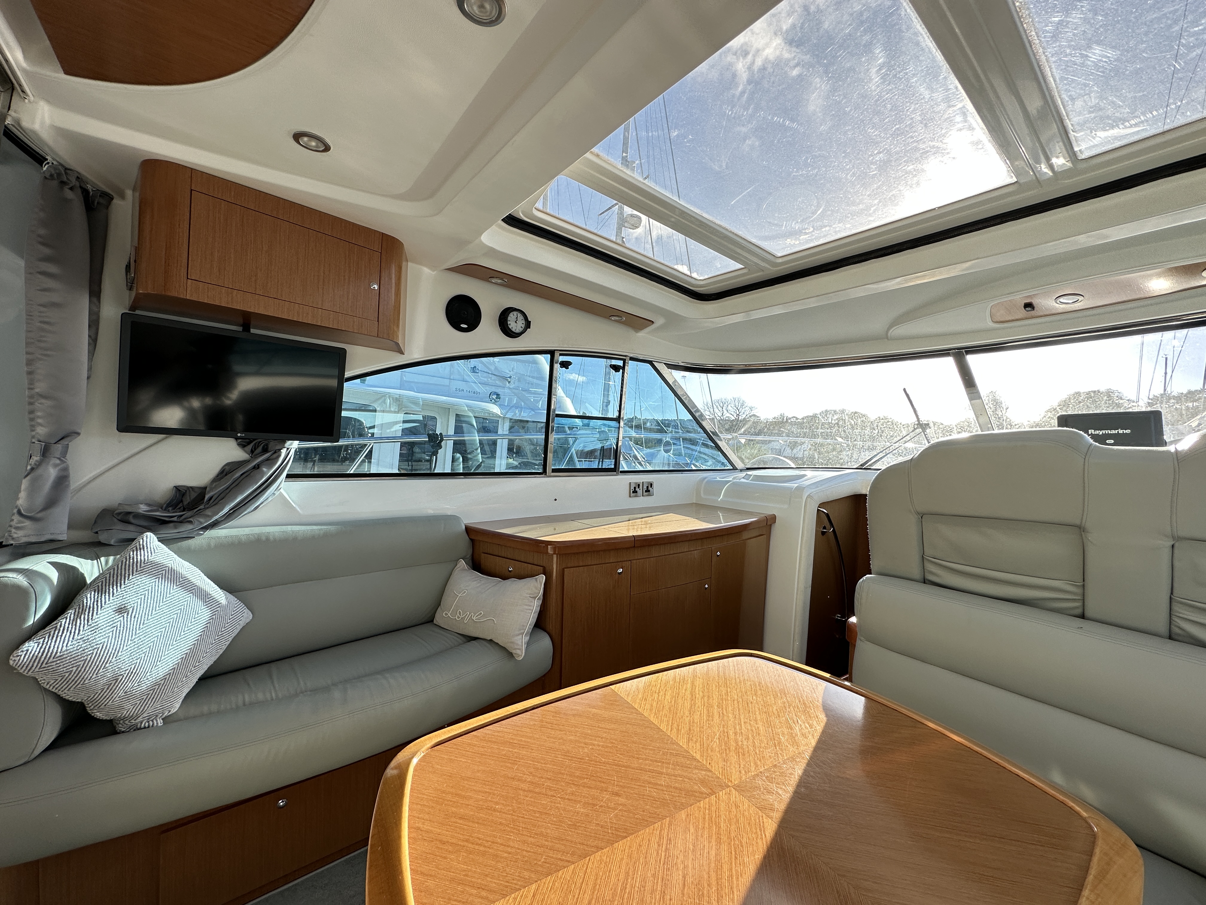 electric sunroof, double helm seat with a u shaped seating arrangement for dinning. The Galley is also in this
