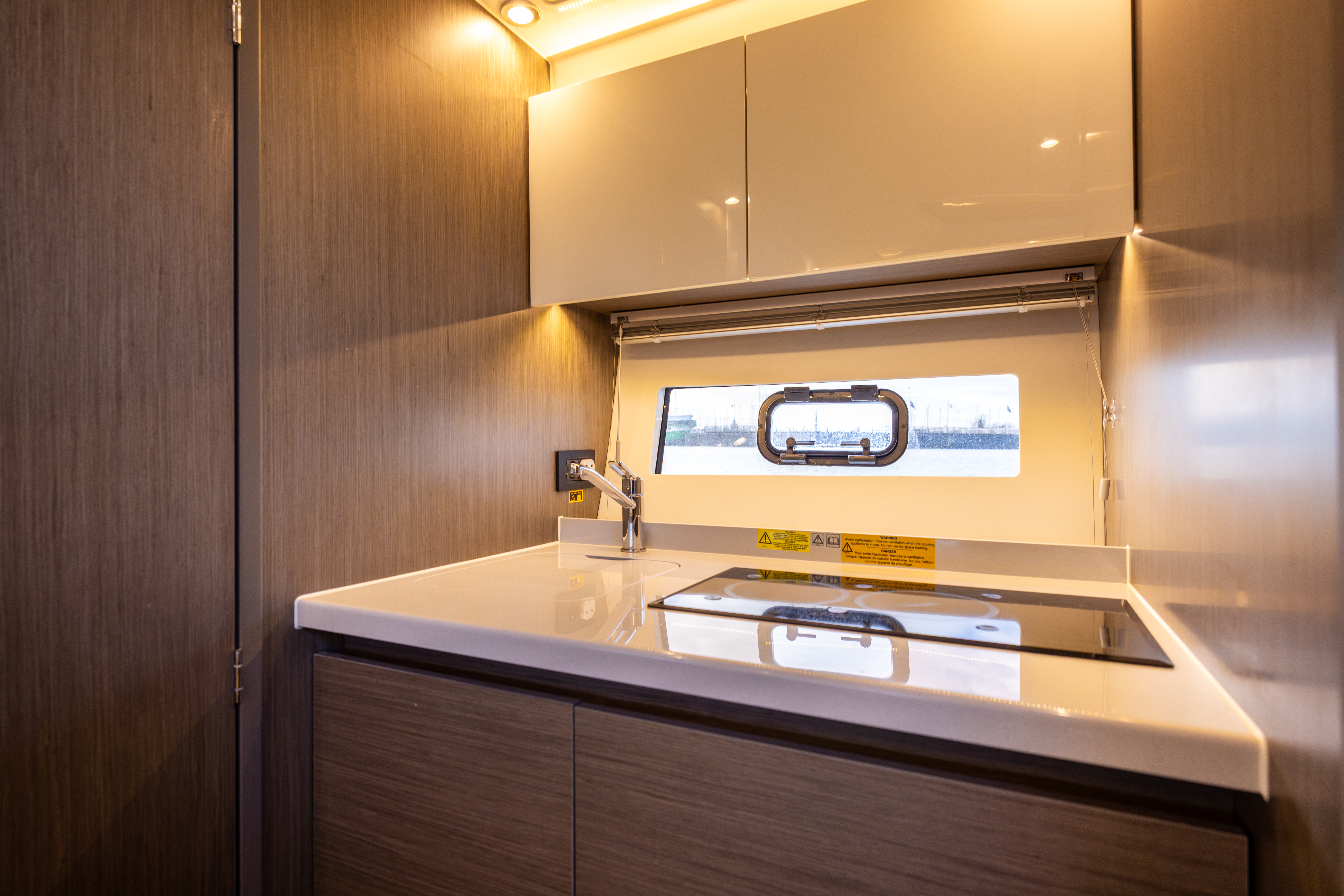 Galley starboard with 2-burner ceramic glass hob, microwave, front opening fridge and stainless sink with mixer tap