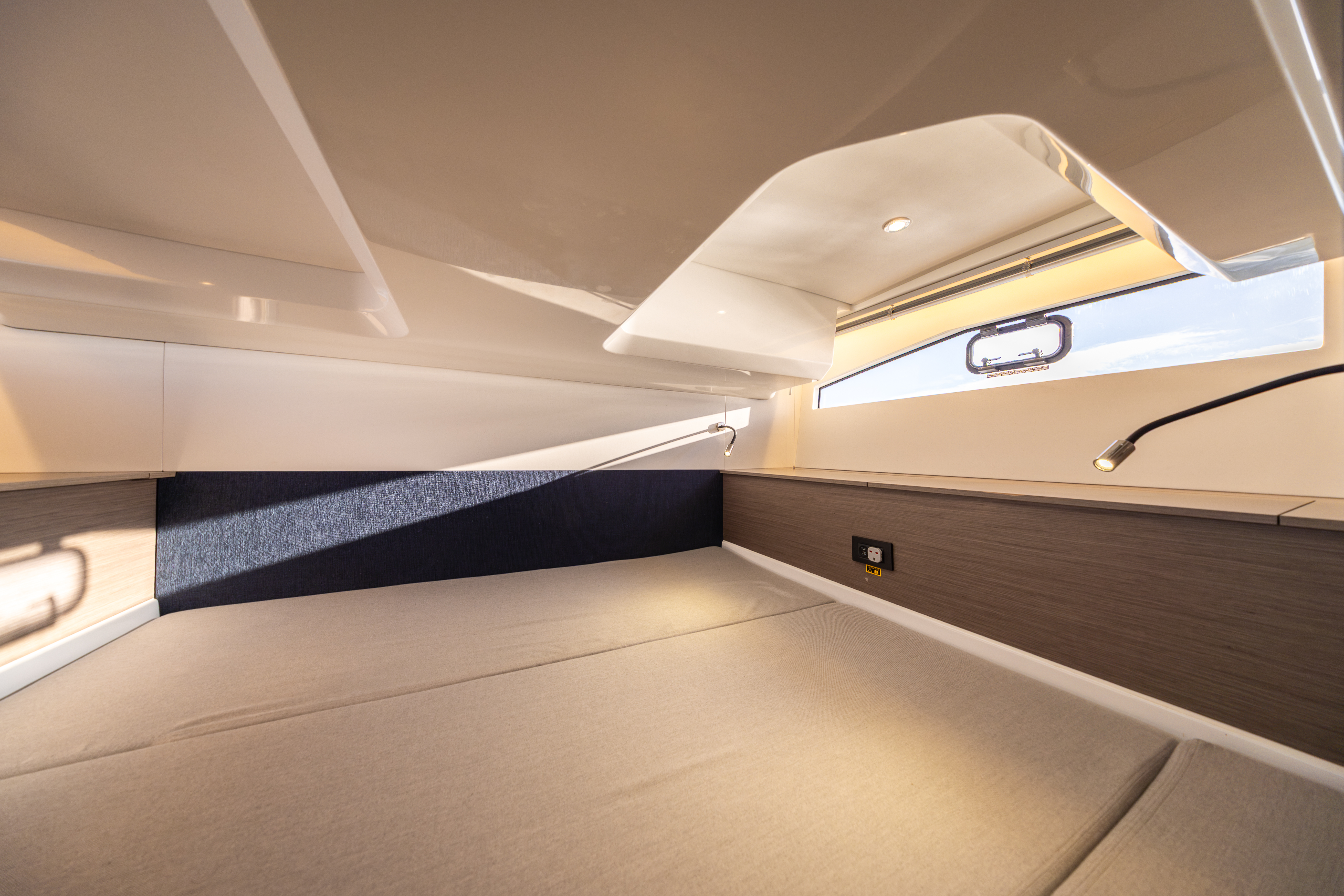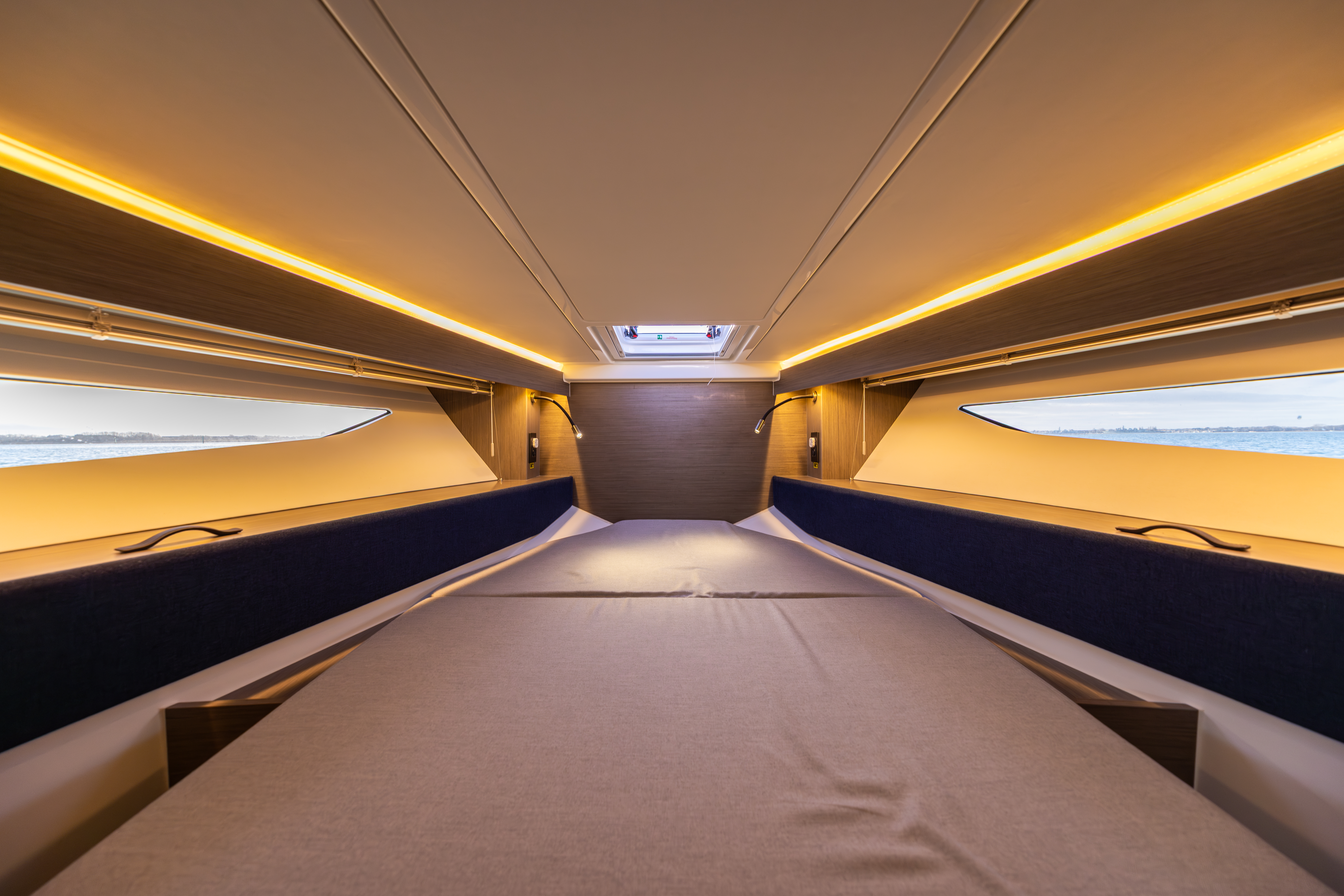 Two hull windows with opening portlights to port and starboard