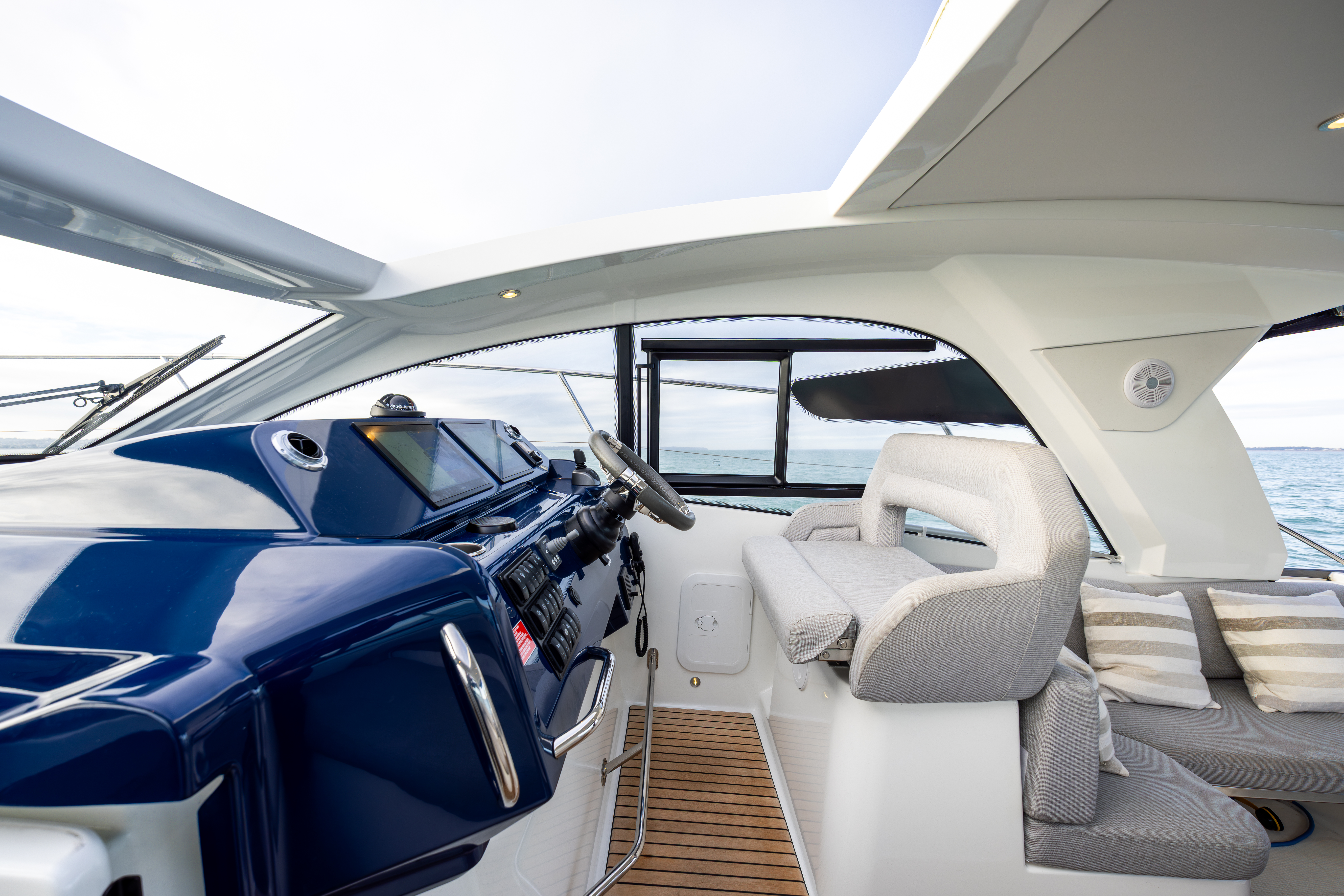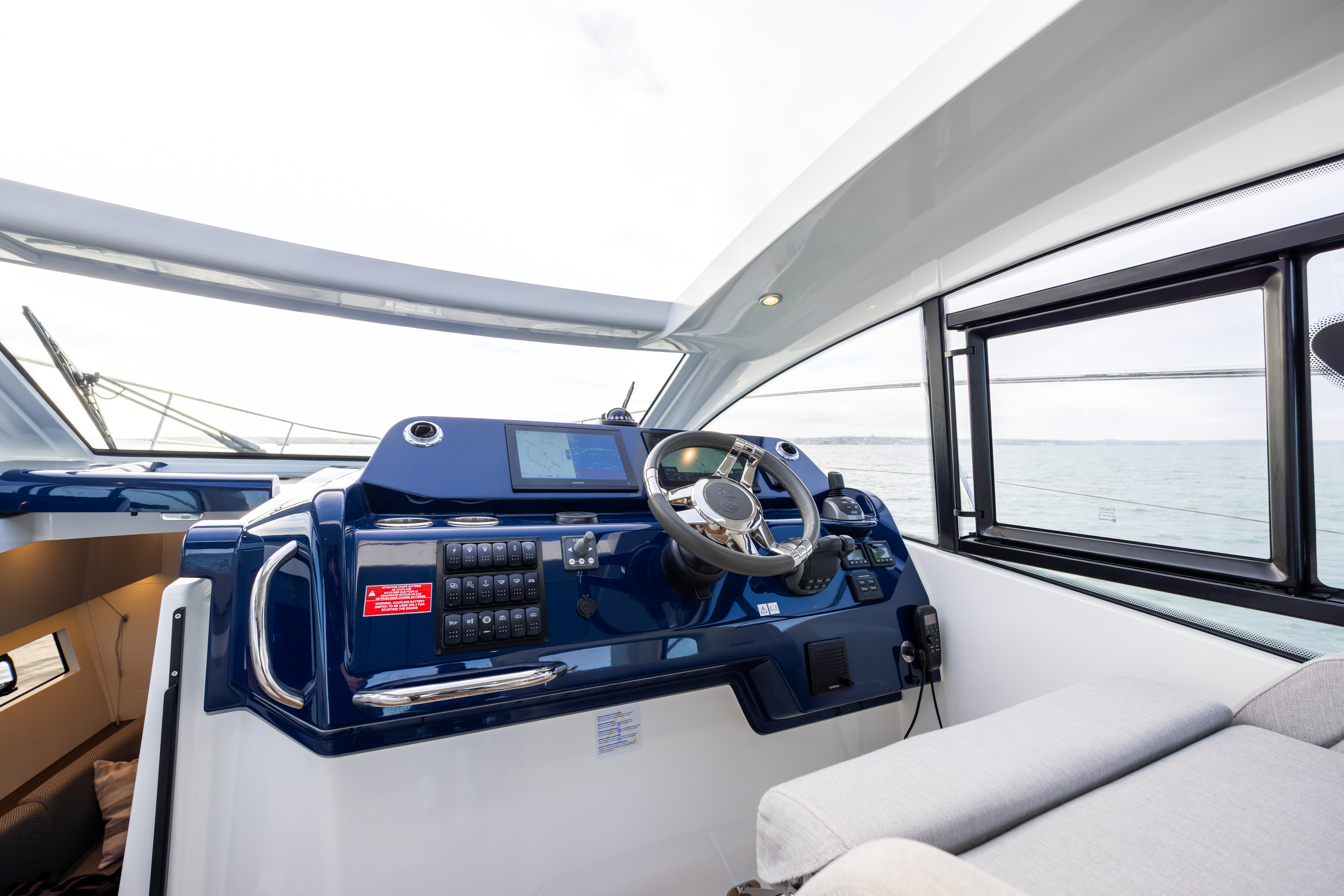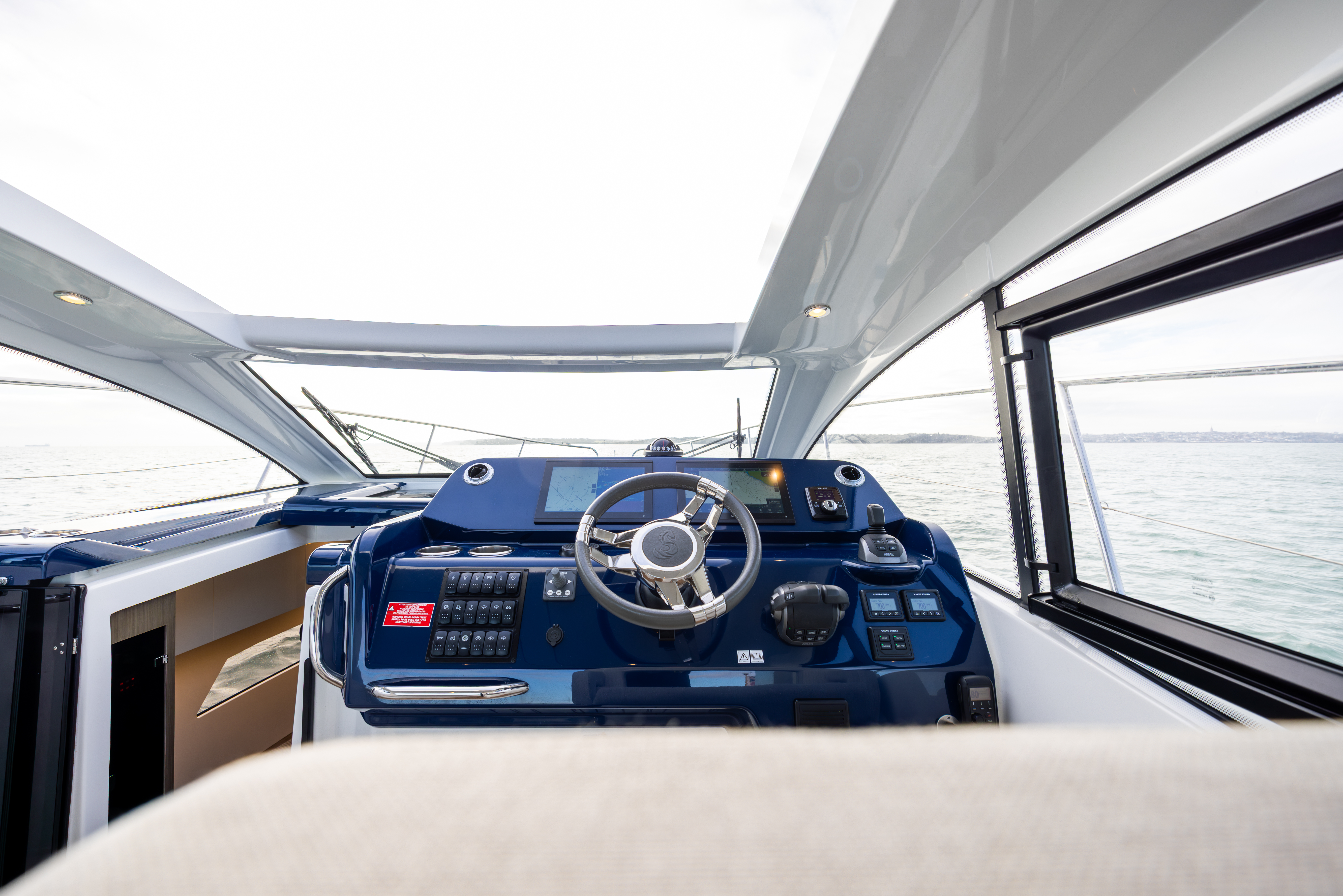 Helm to starboard of cockpit with sports steering wheel, engine throttles, joystick, Zipwake, bowthruster