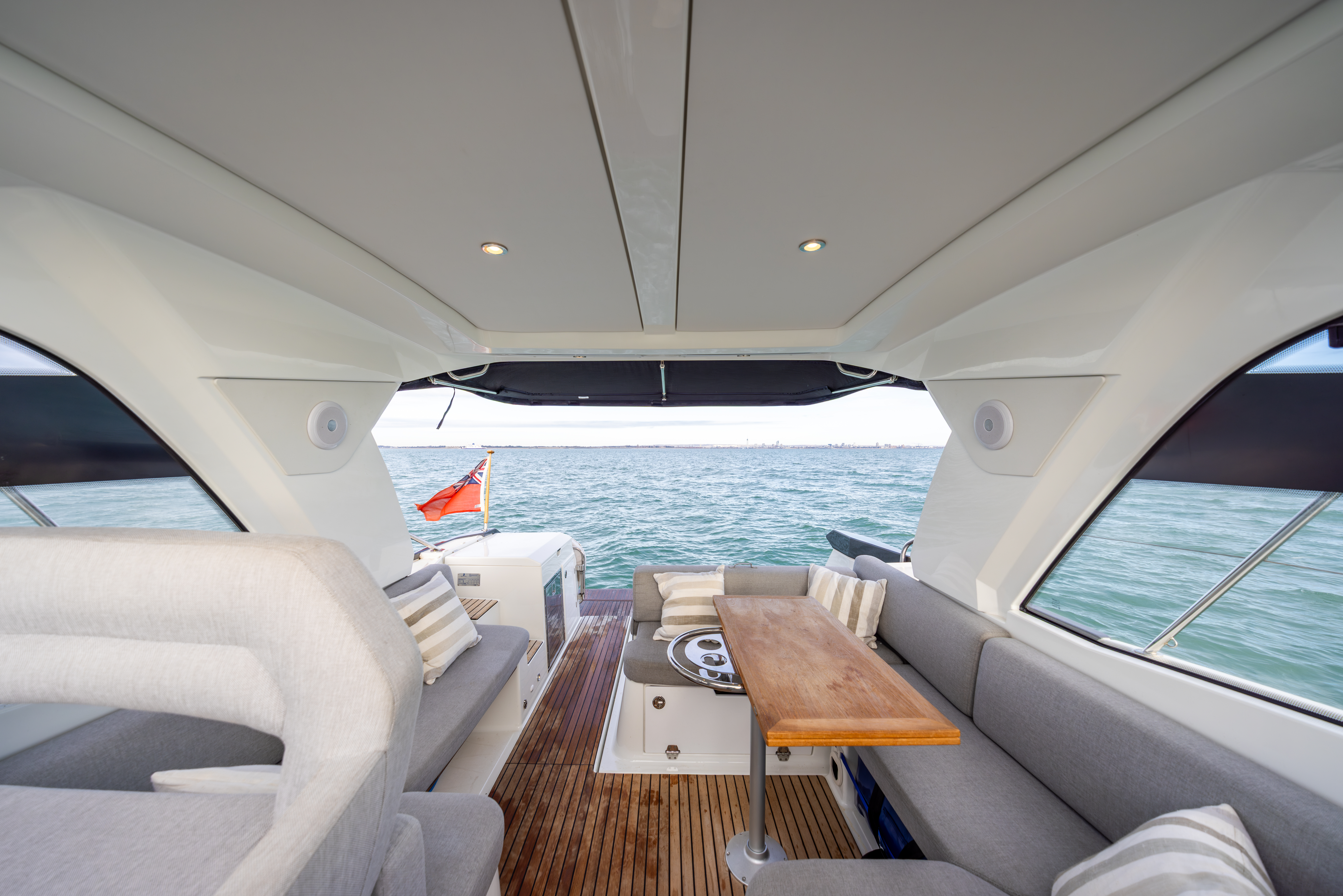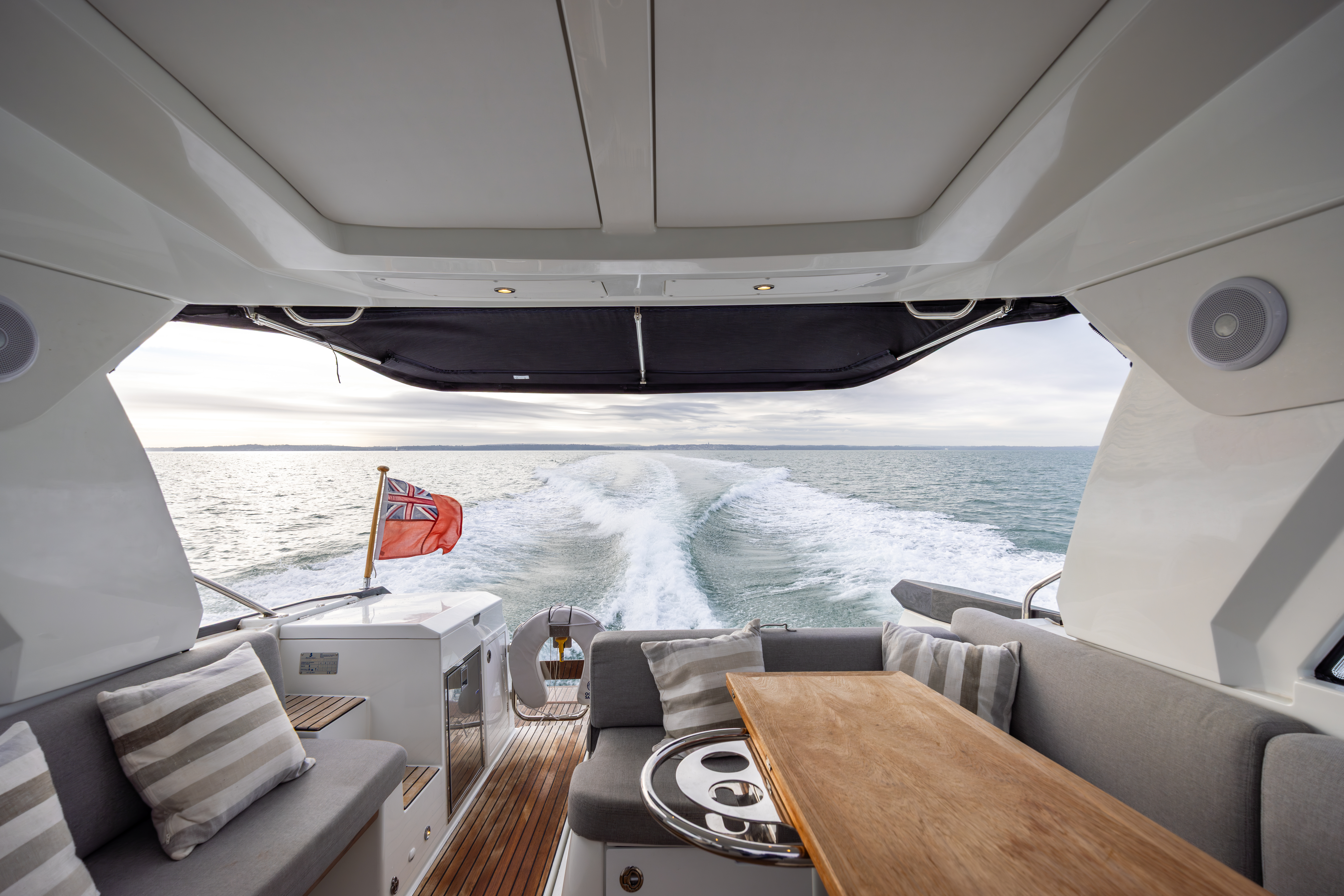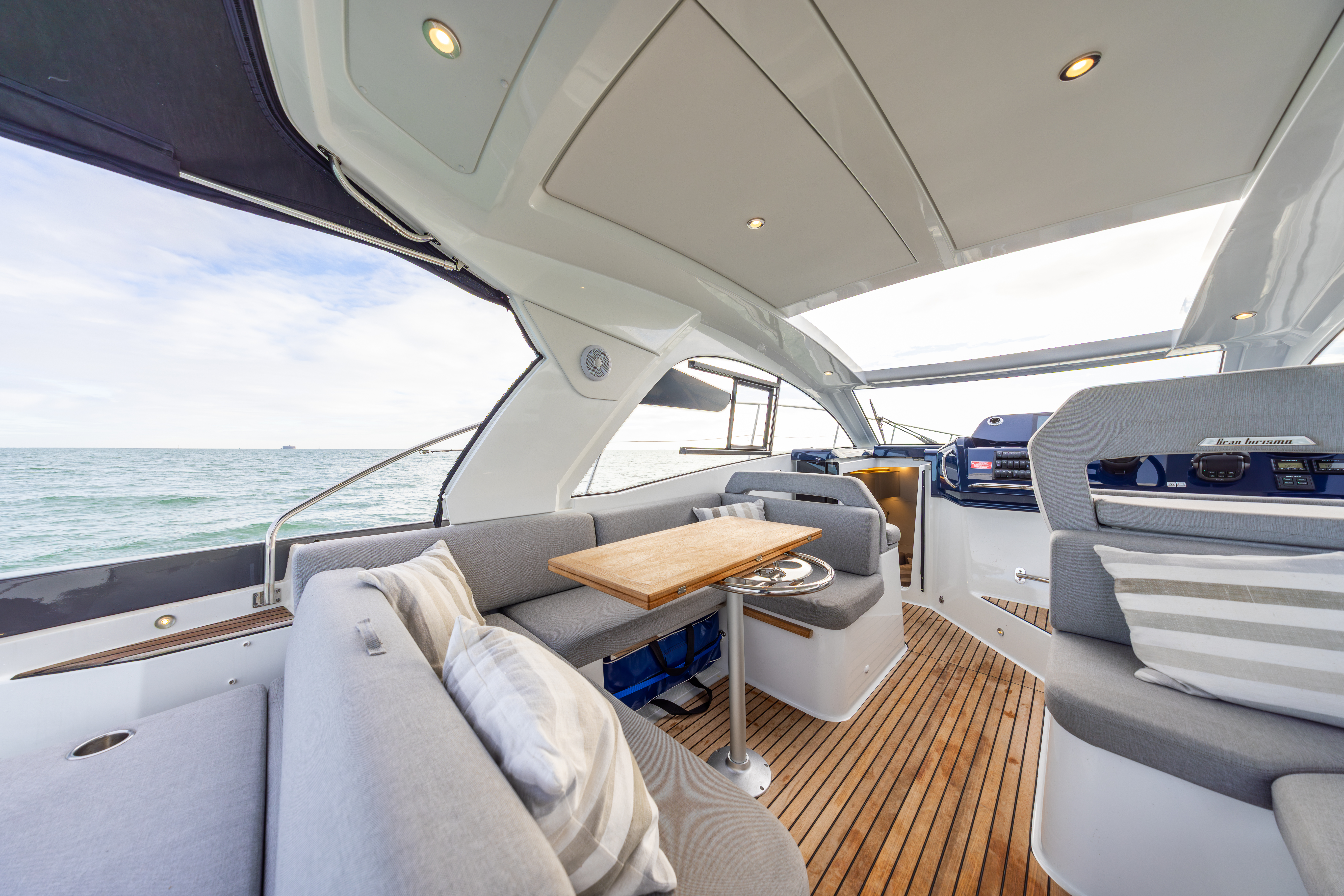U-shaped cockpit seating aft around folding teak table