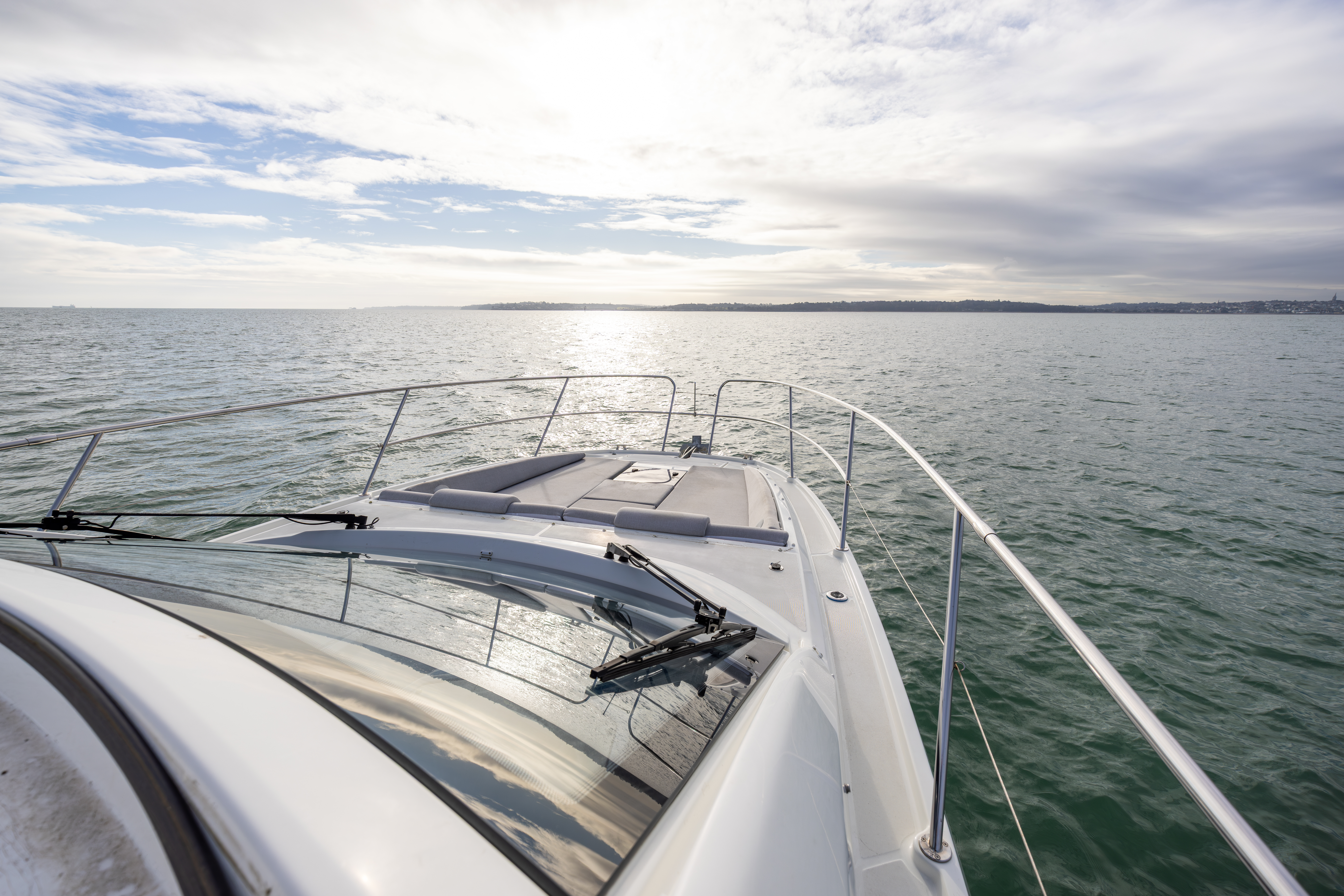 One-piece glass windscreen with twin electric wipers.