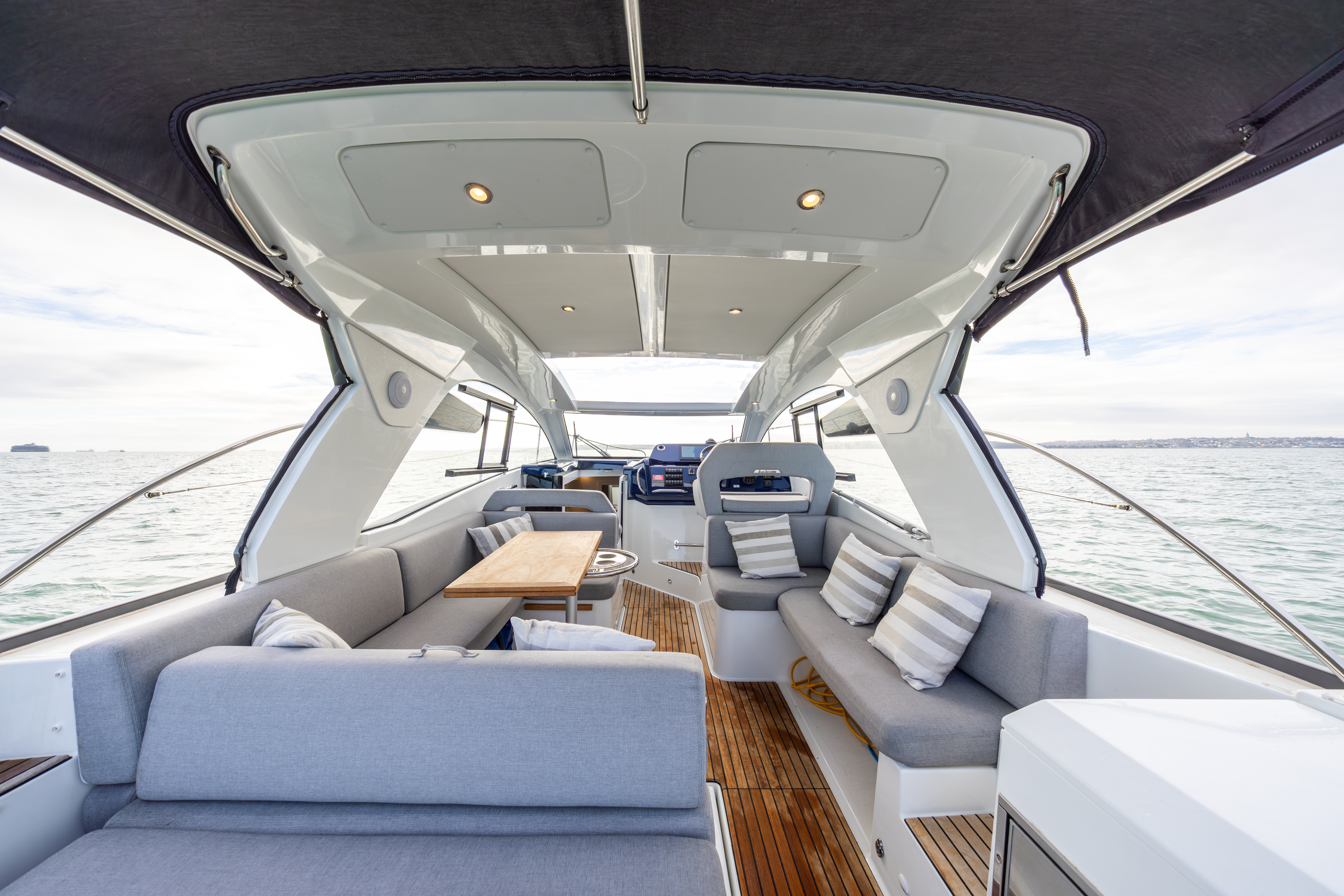 Foredeck sunbathing pack with awning, built in speakers and cover to cushions