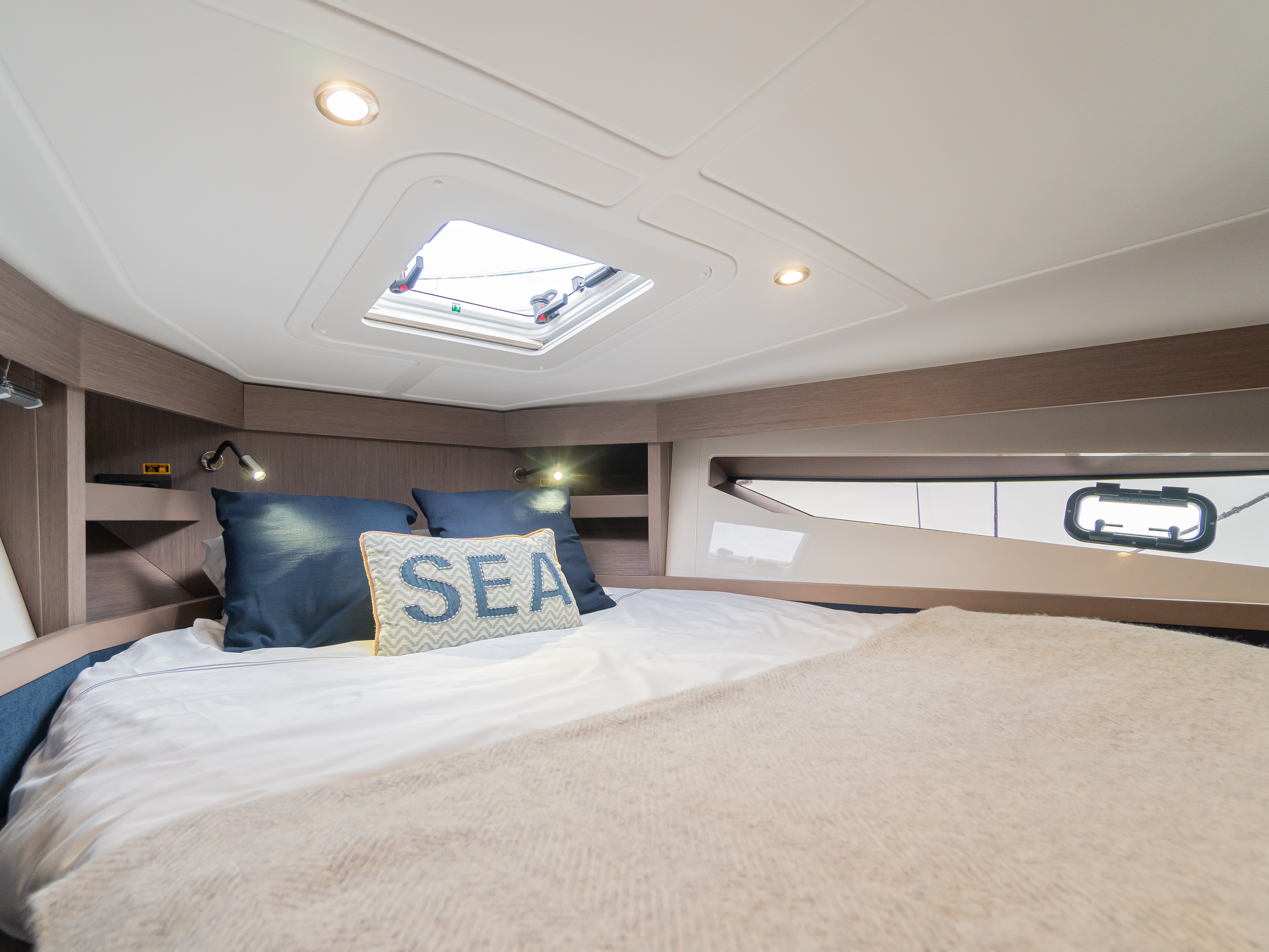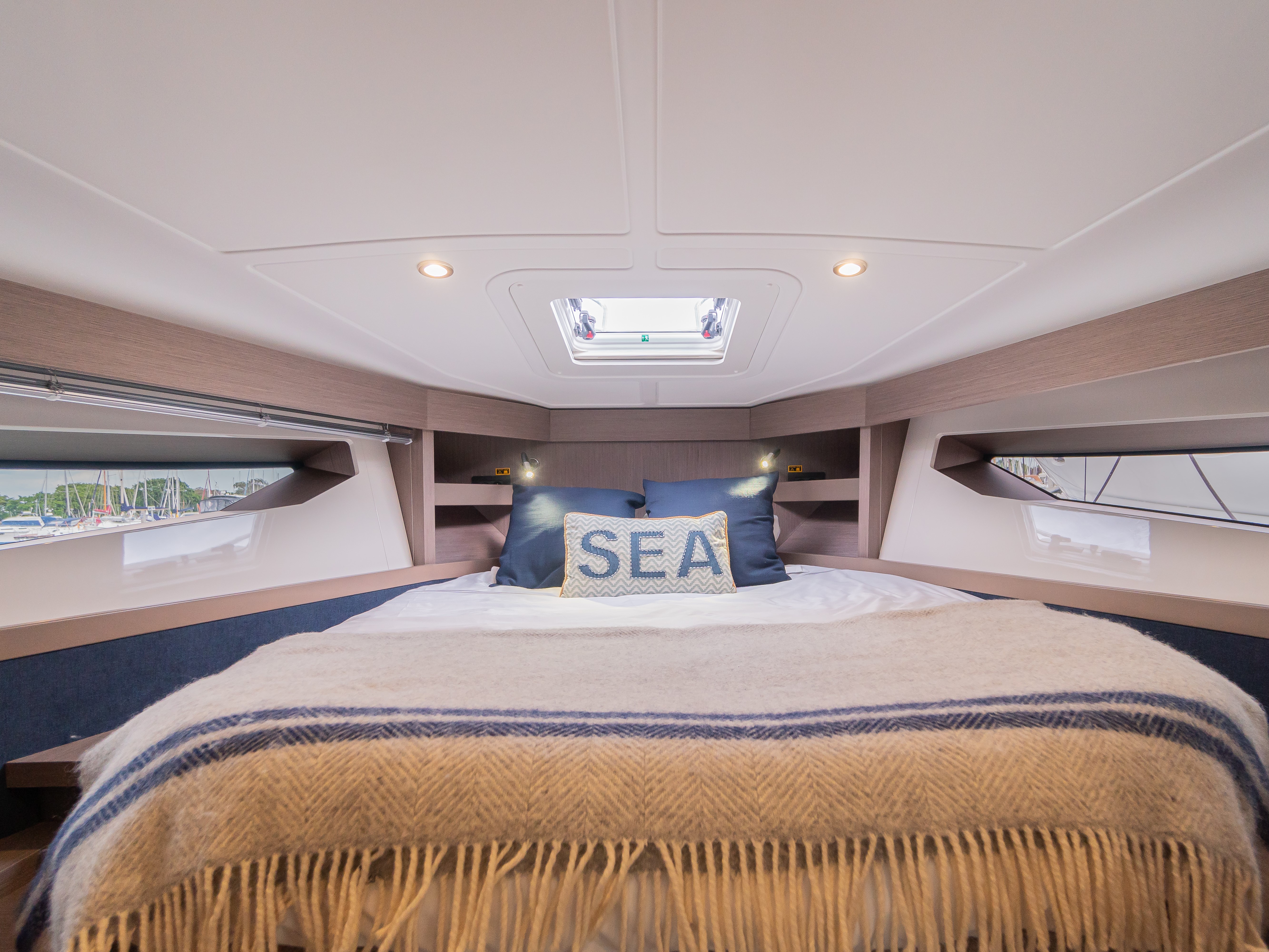 Double island berth with marine mattress and padded headboard (1.4m x 2m, 4'7" x 6'7")