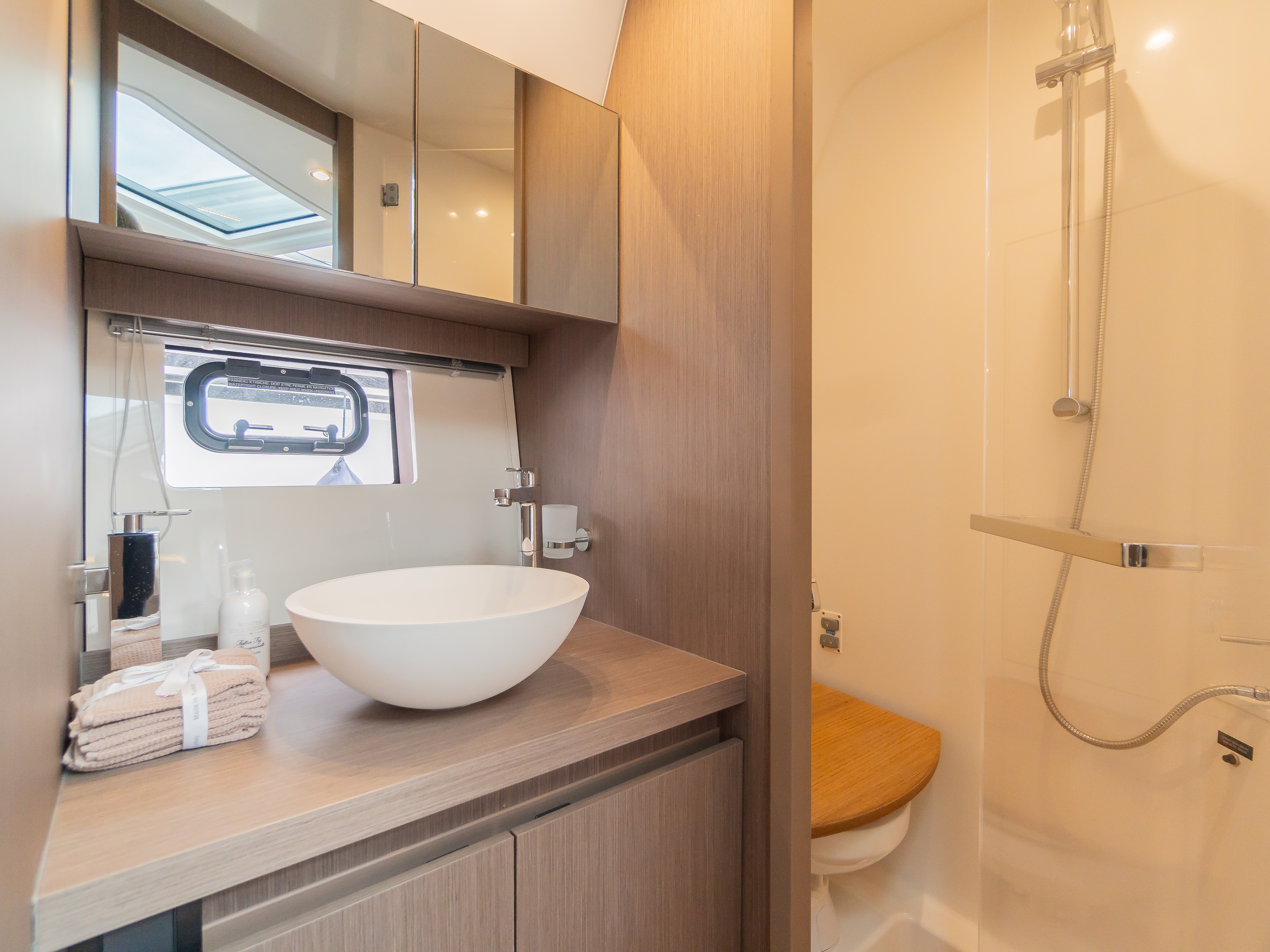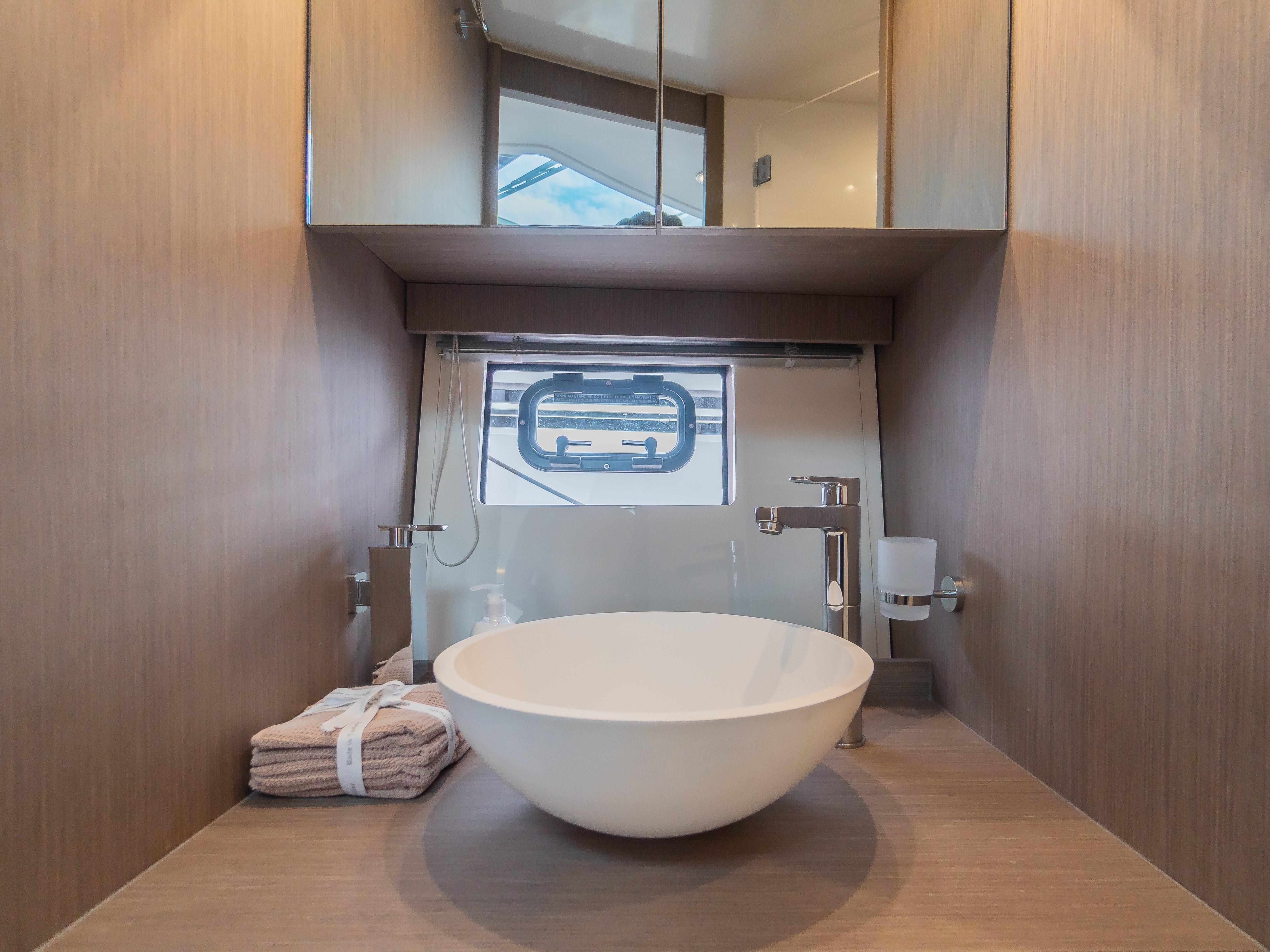 Basin with mixer tap, mirror, storage cupboards and opening porthole