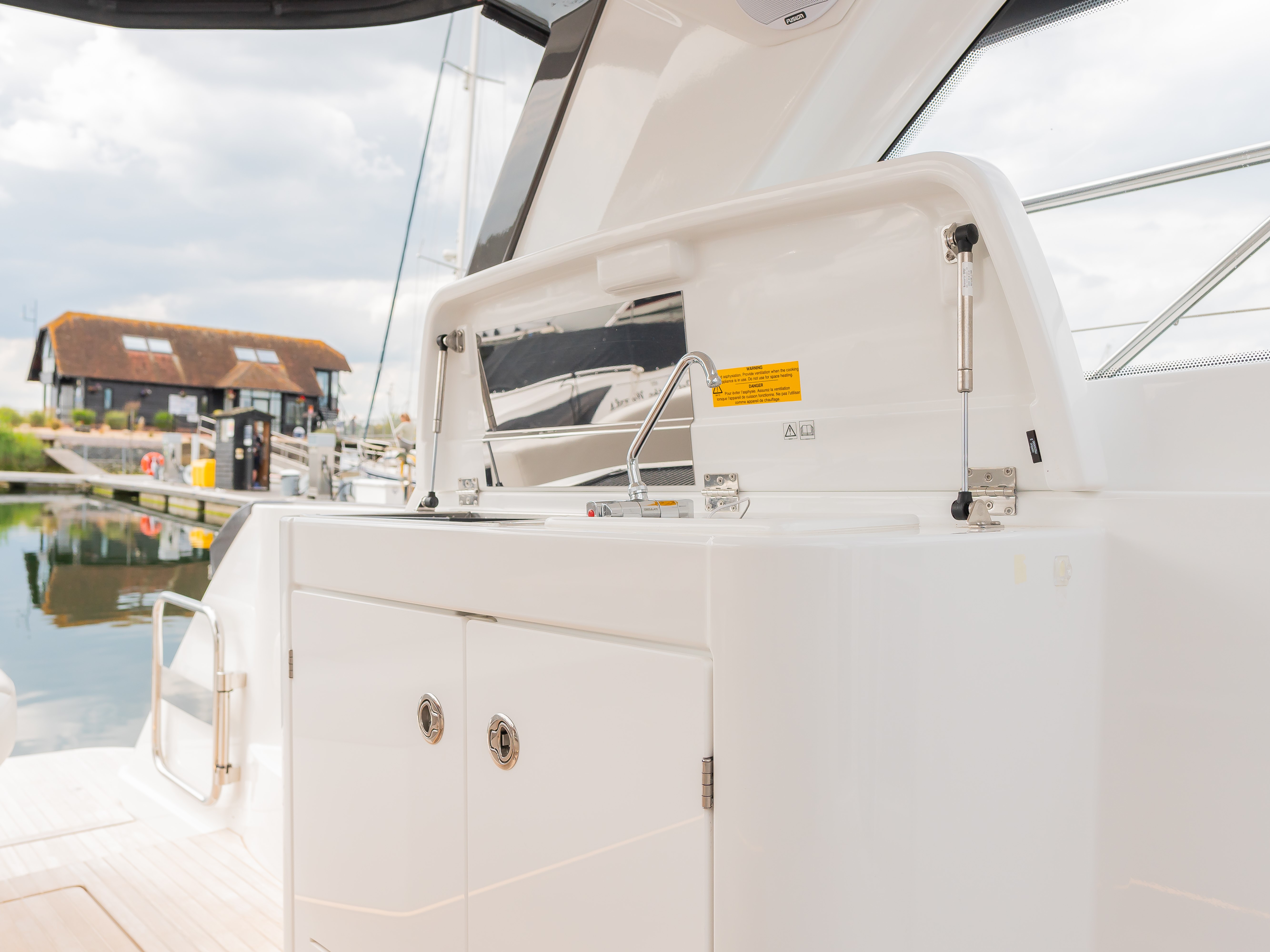Designated life raft storage, additional storage under seating and double access cover to engine room