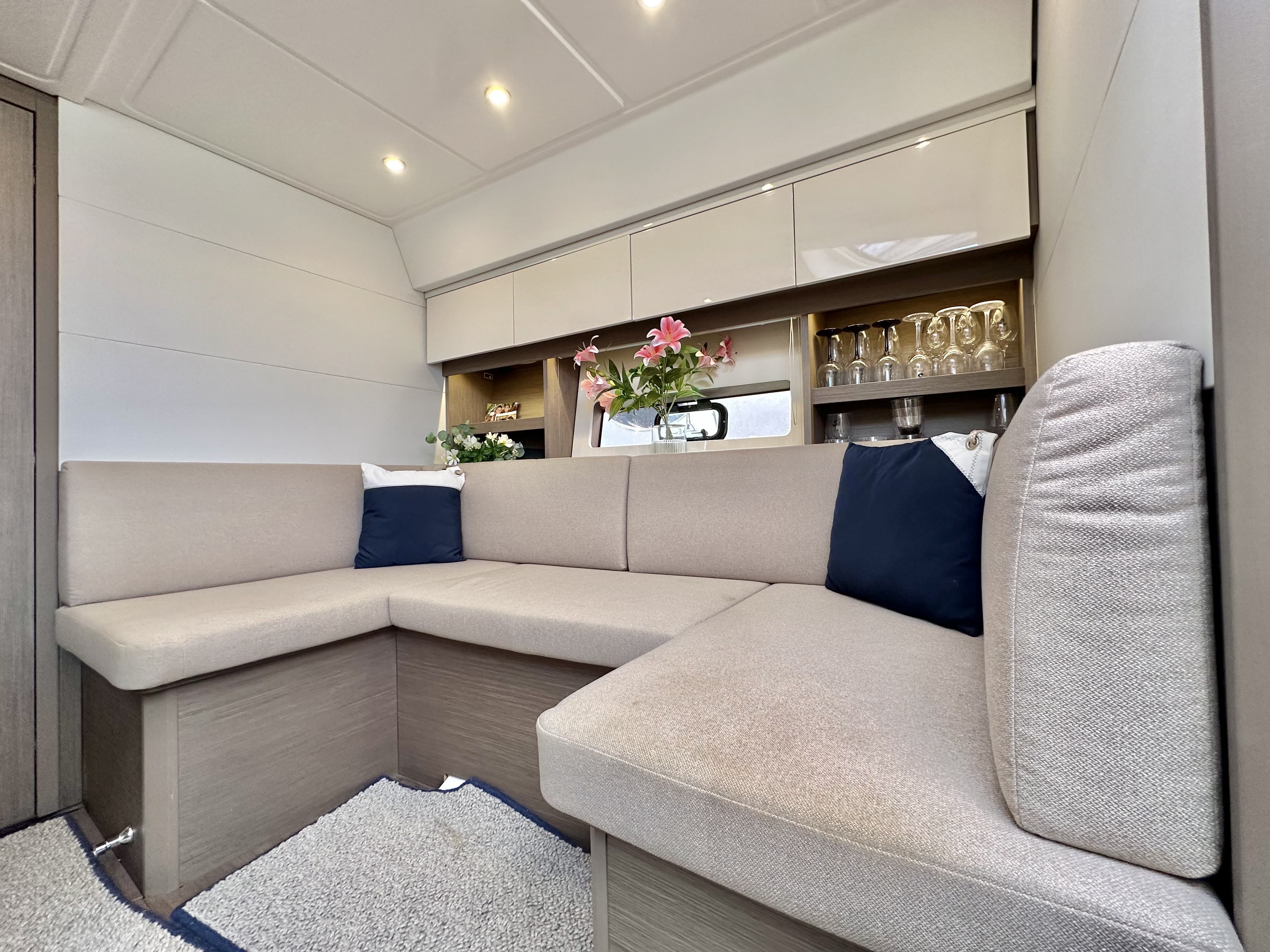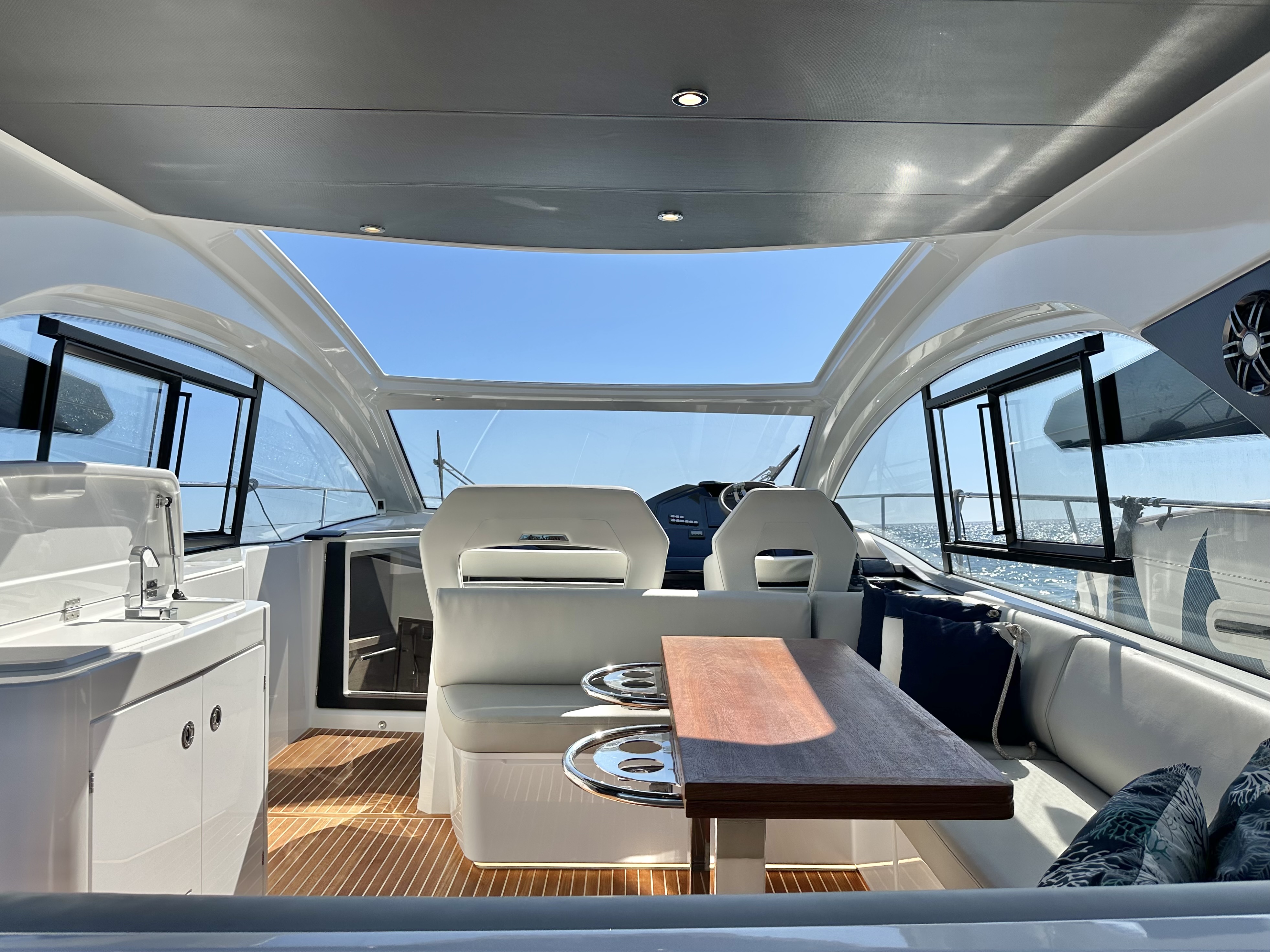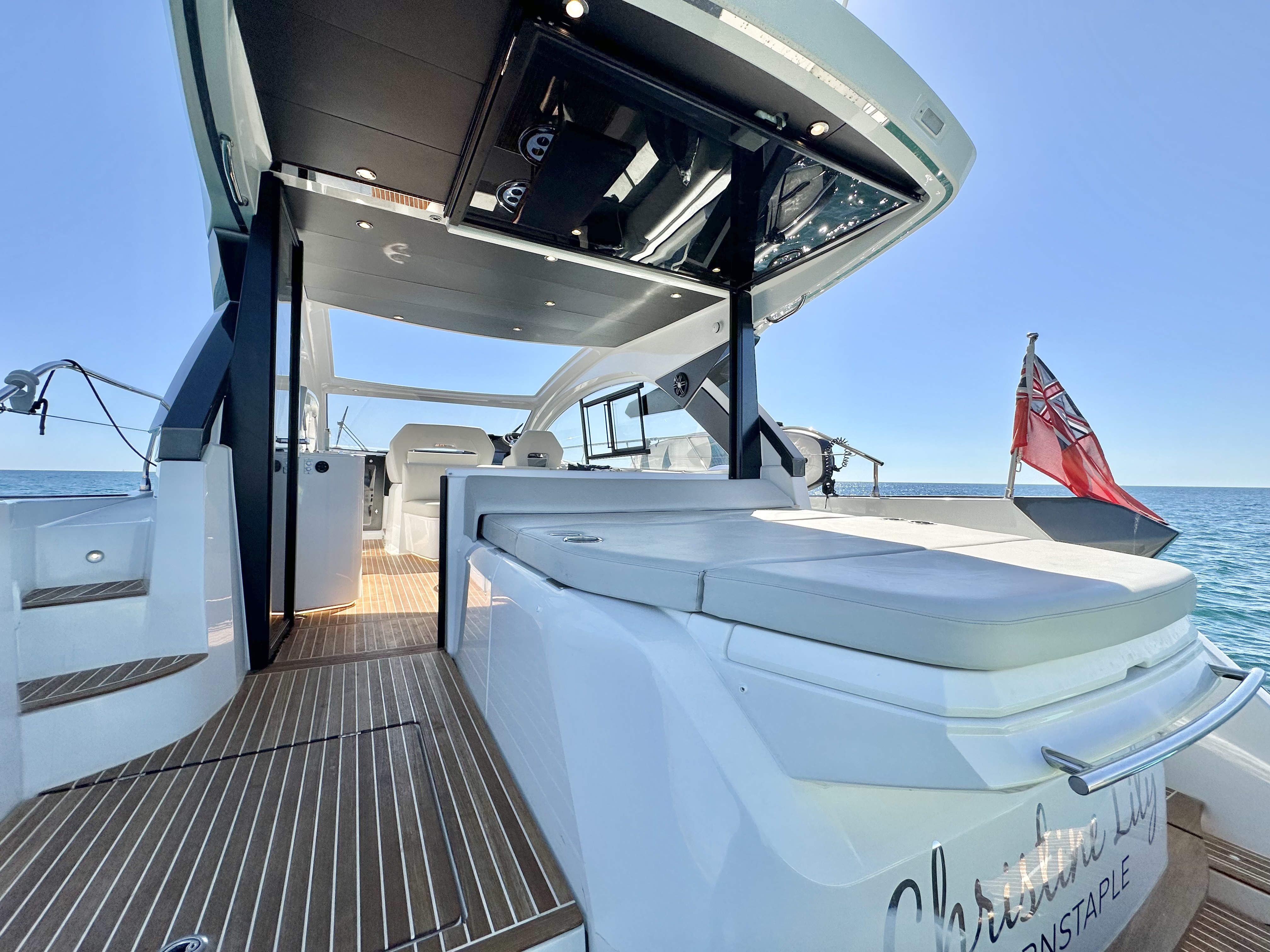 She offers comfortable accommodation for 4 in 2 spacious cabins. A large cockpit area which can be opened or fully enclosed as desired courtesy of her opening hard top, side windows and opening window / door astern. Large sunbathing areas fore and aft make for great entertaining.