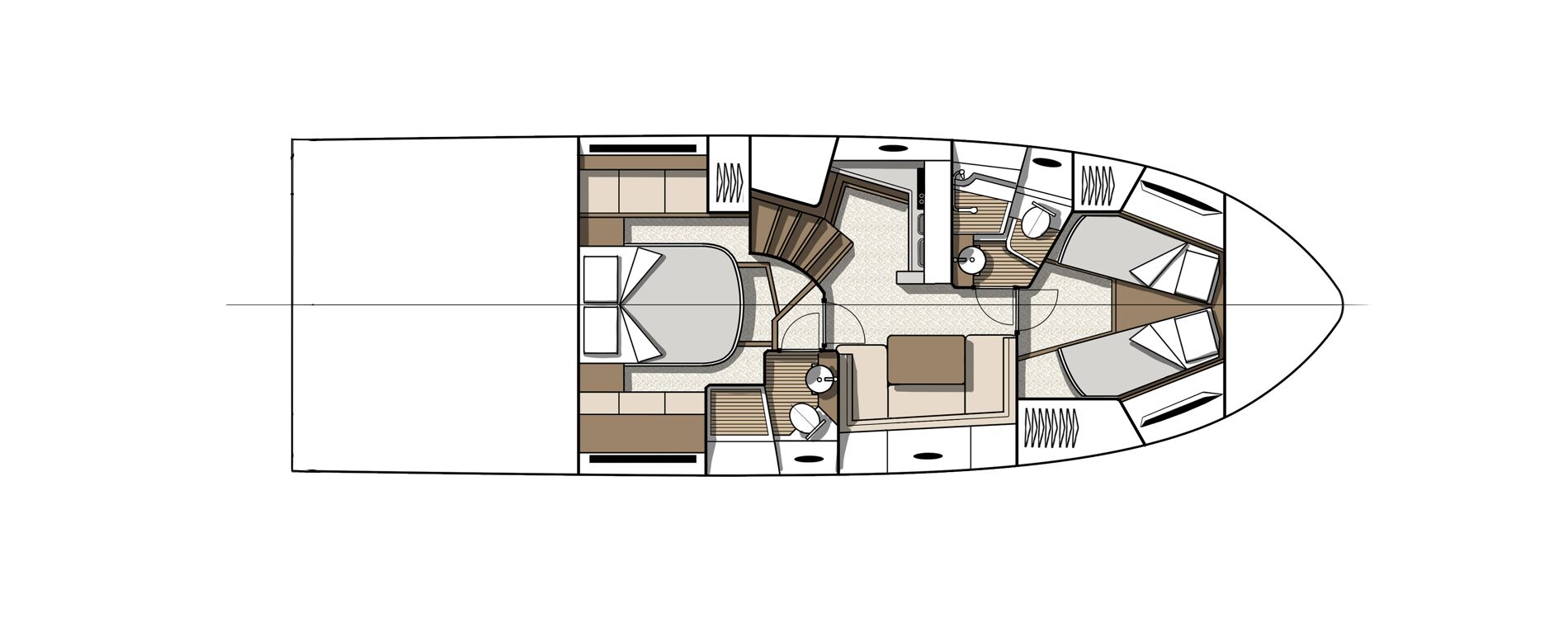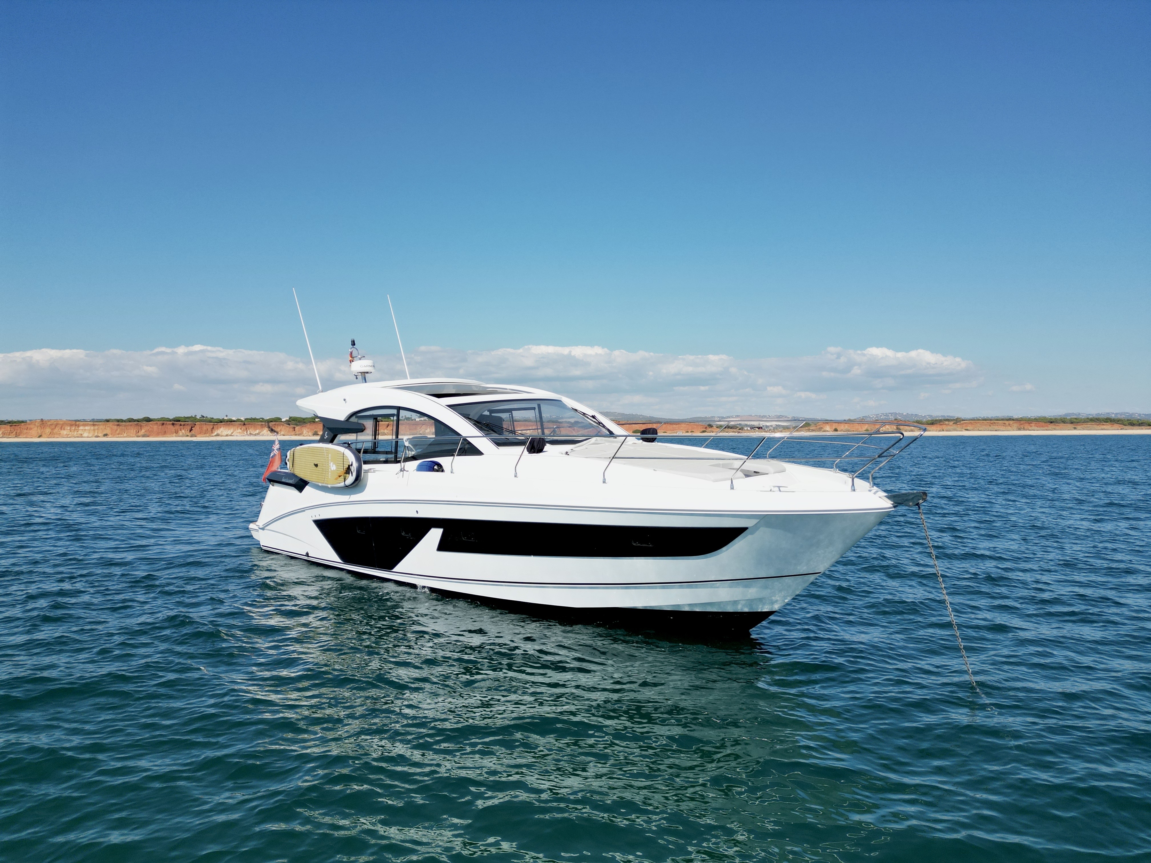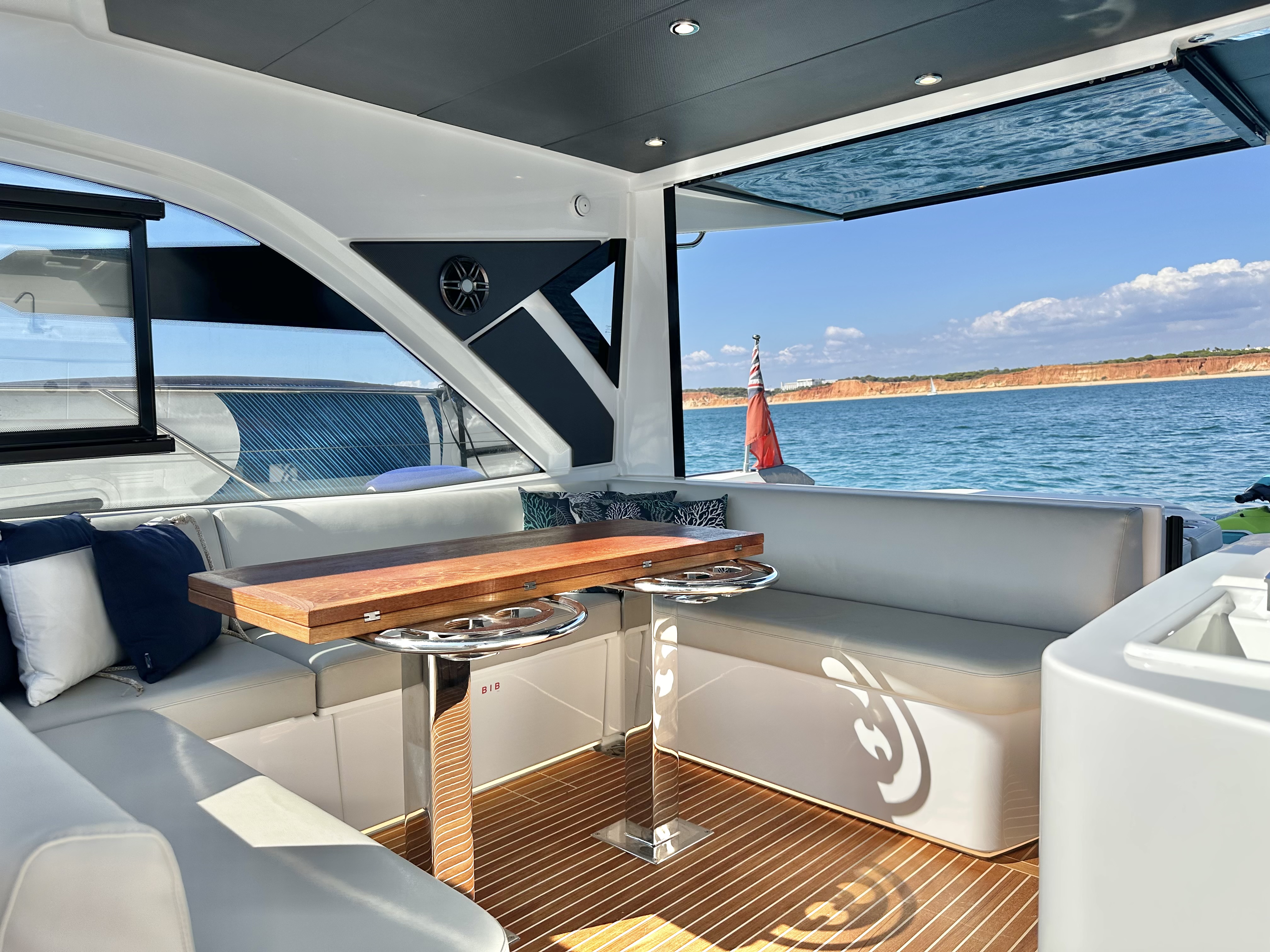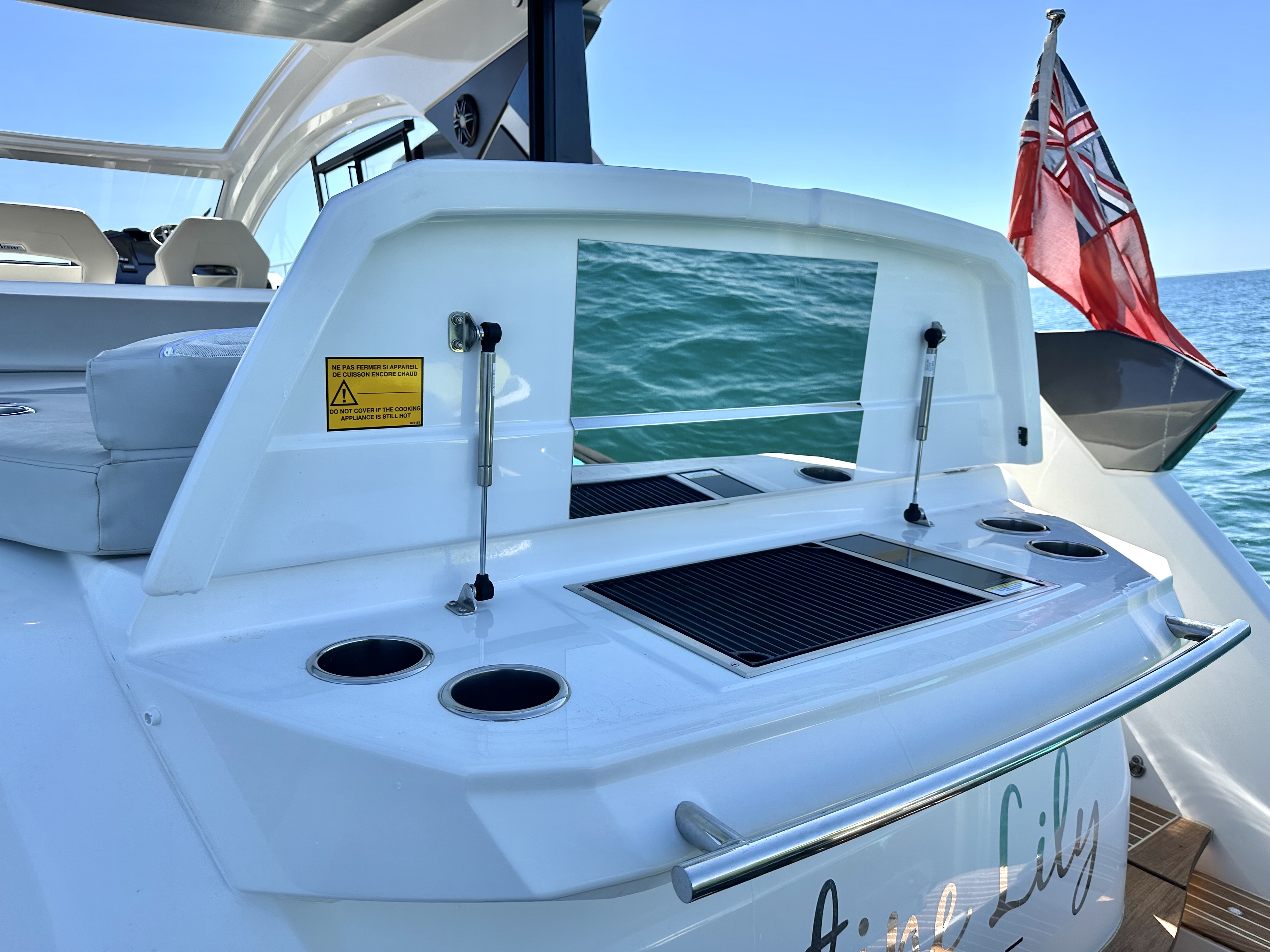 She offers comfortable accommodation for 4 in 2 spacious cabins. A large cockpit area which can be opened or fully enclosed as desired courtesy of her opening hard top, side windows and opening window / door astern. Large sunbathing areas fore and aft make for great entertaining.