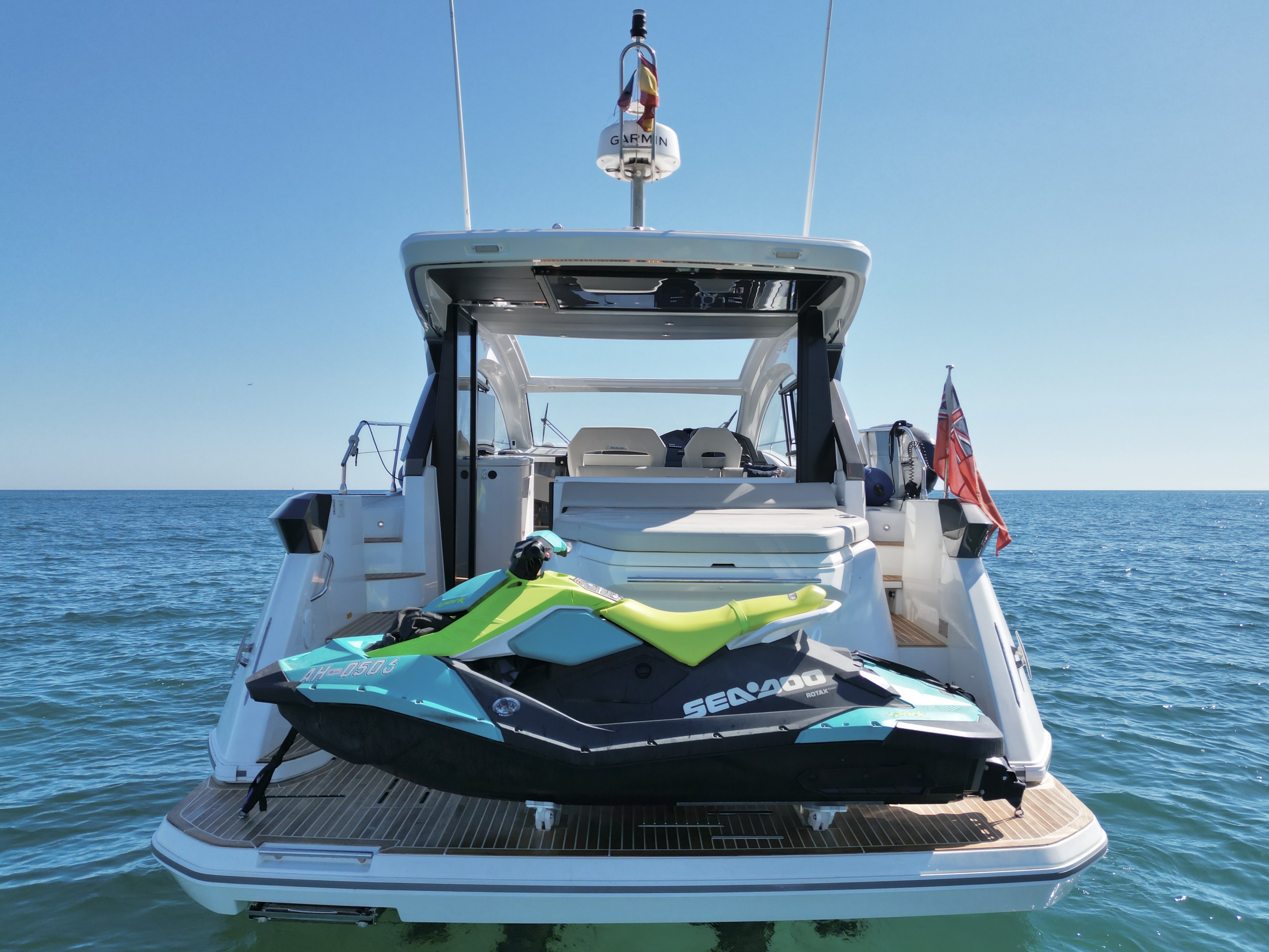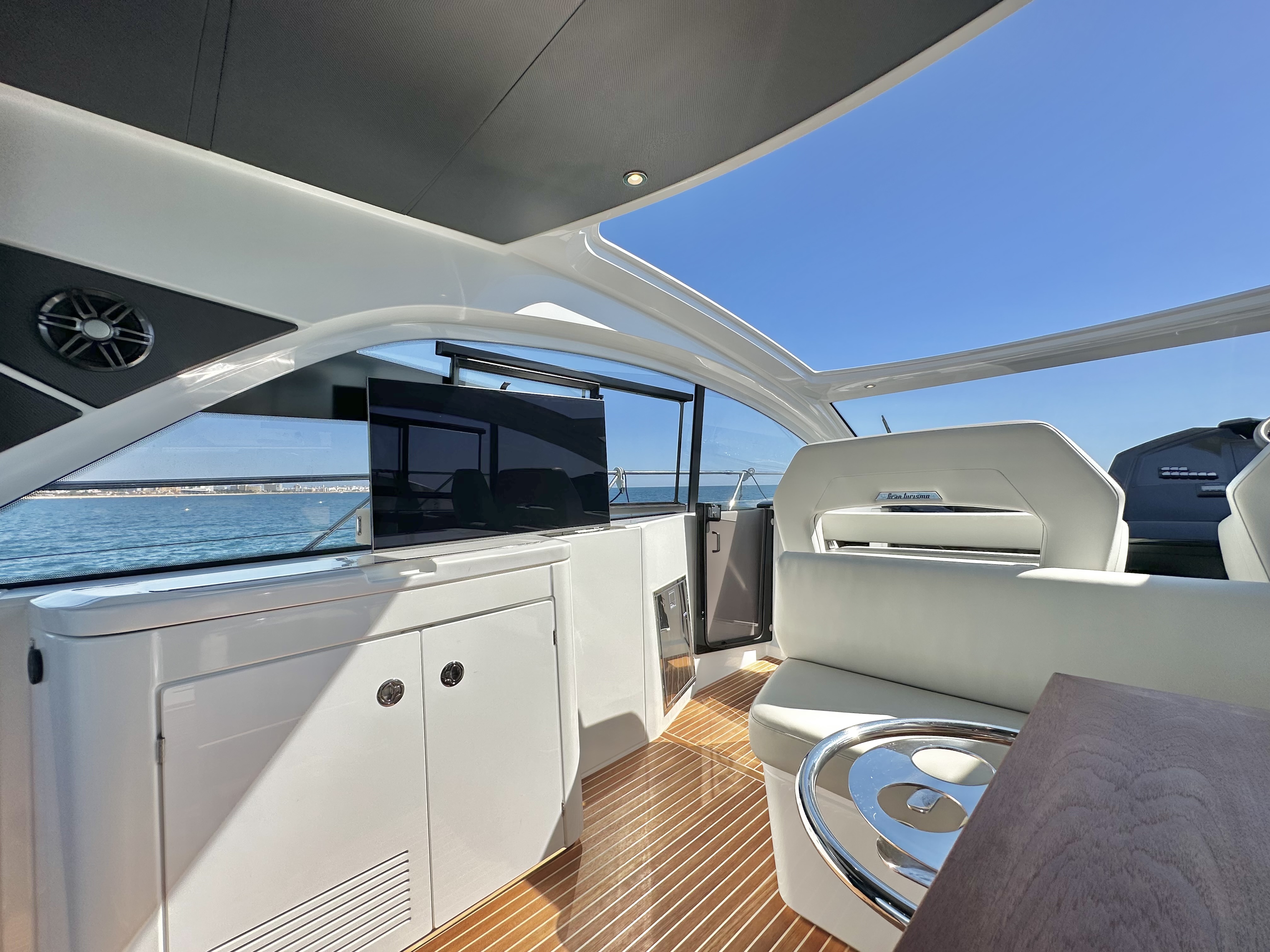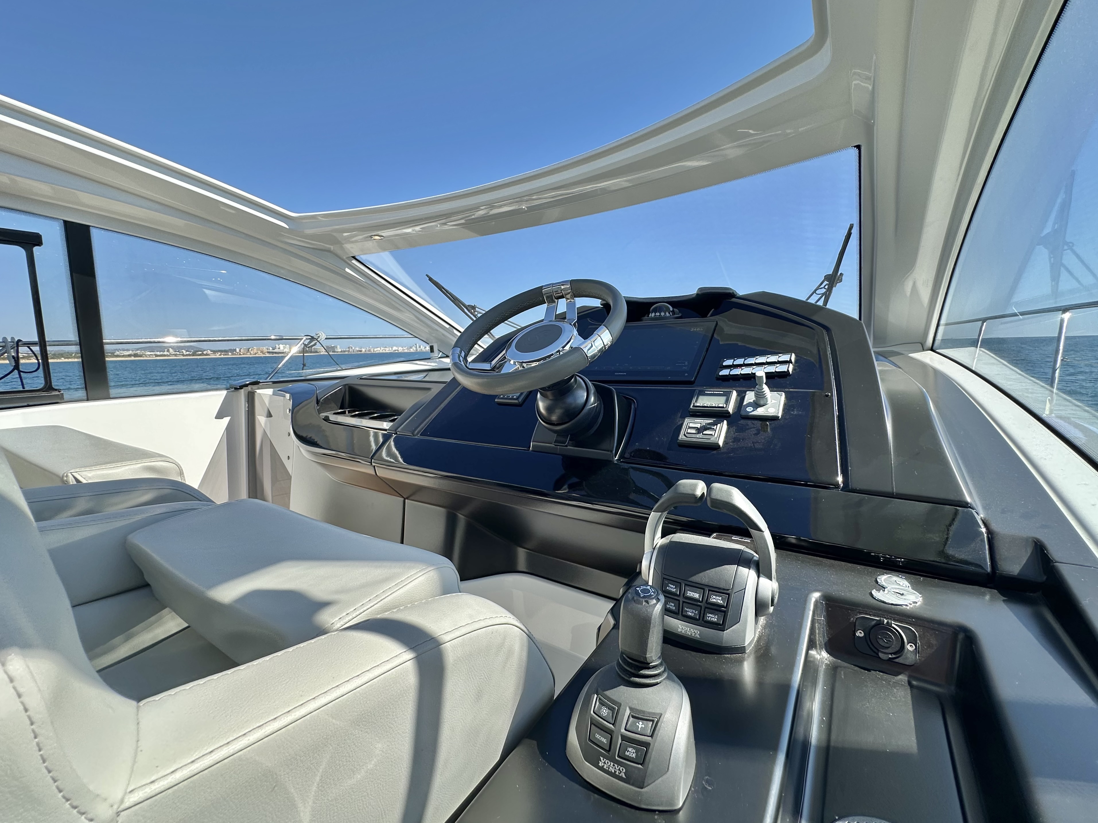 This particular example is powered by twin Volvo Penta D6-380hp diesel engines, low hours, with joystick control on outdrives. Comes with a comprehensive inventory including a Fischer Panda 5000i Neo generator (5kVA/4kW), air conditioning, hi/lo hydraulic platform, ice maker, Electronics pack, Comfort pack, Sports Chic pack, Foredeck pack, cockpit covers, cockpit enclosure and much more.