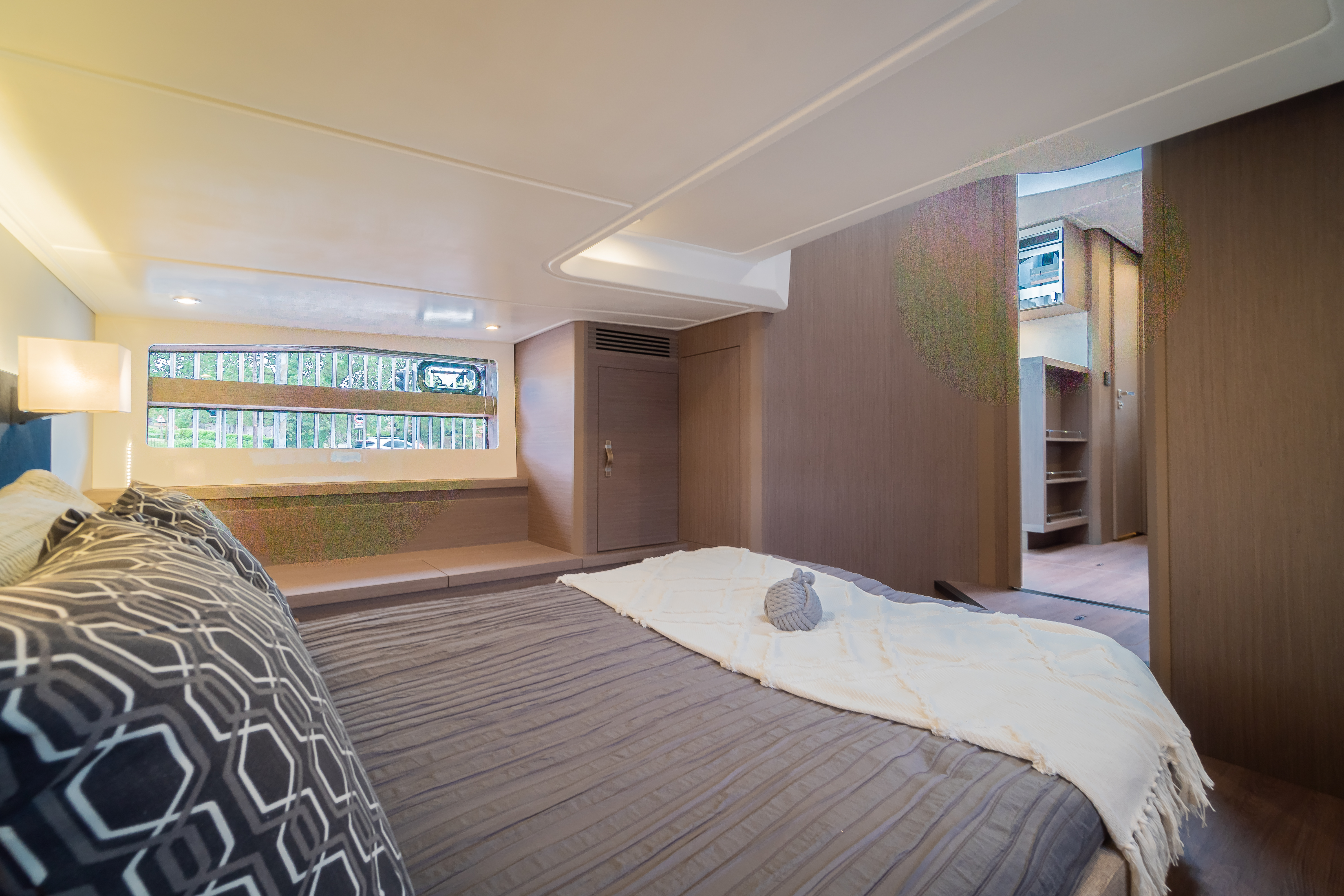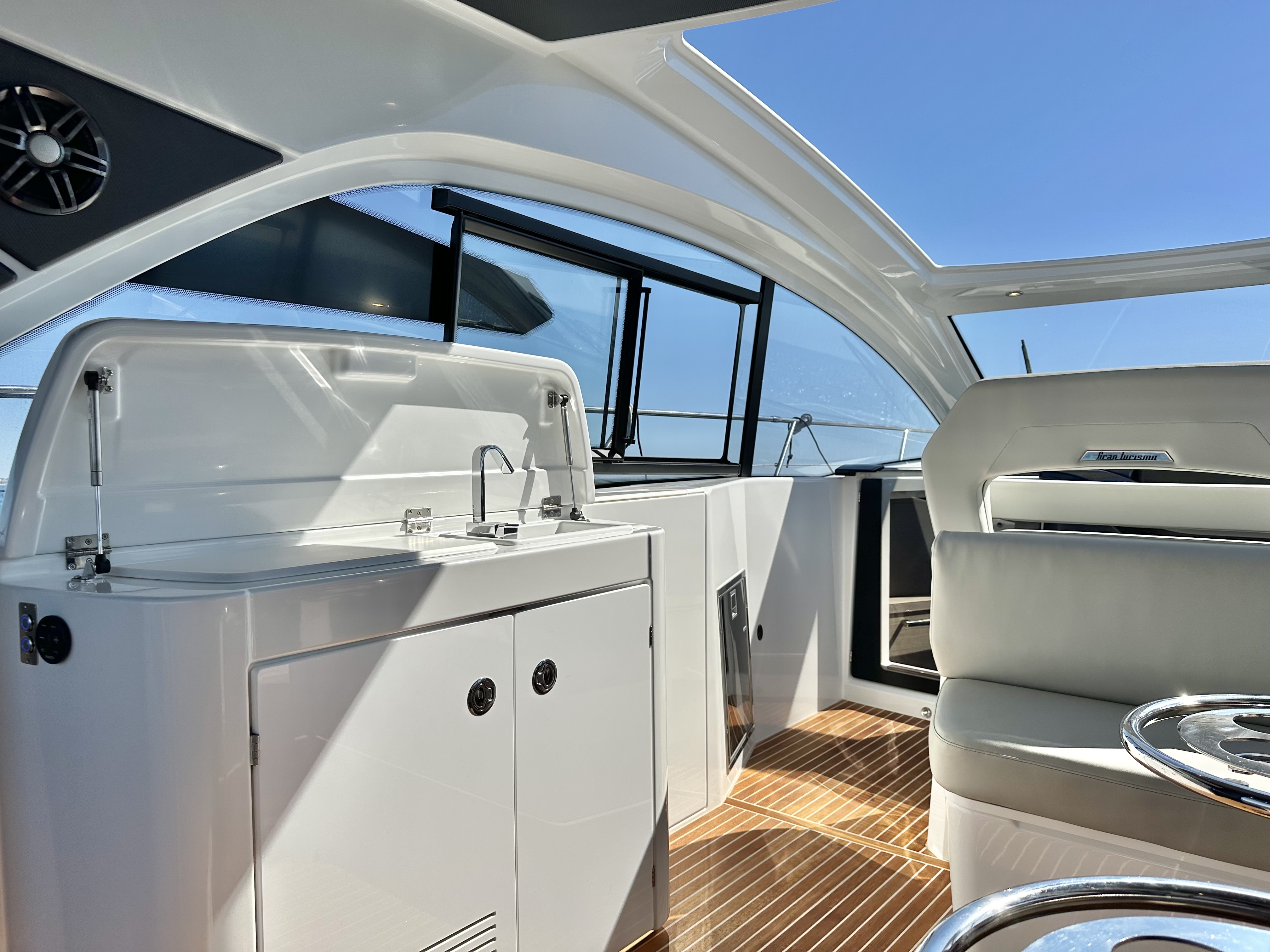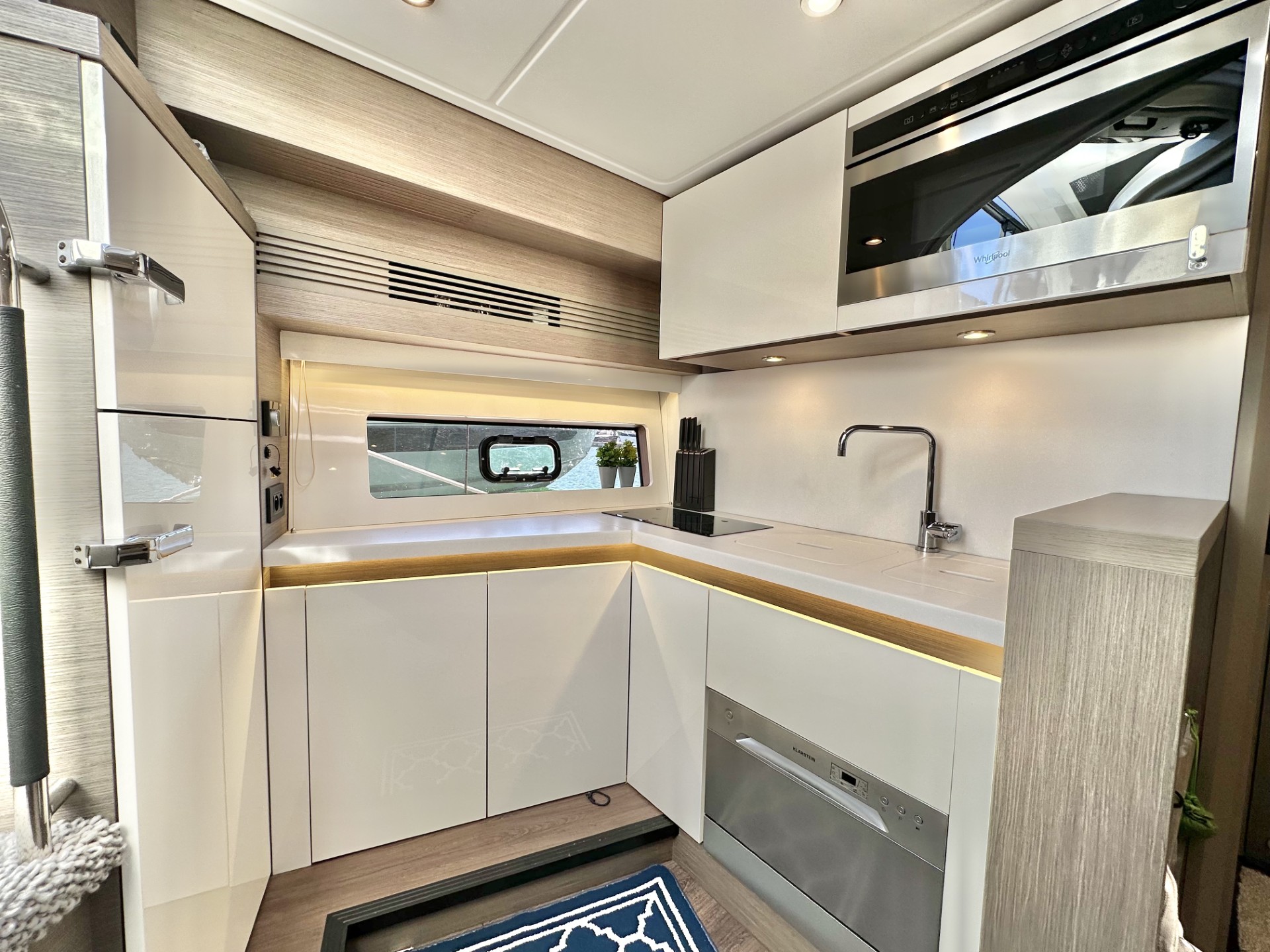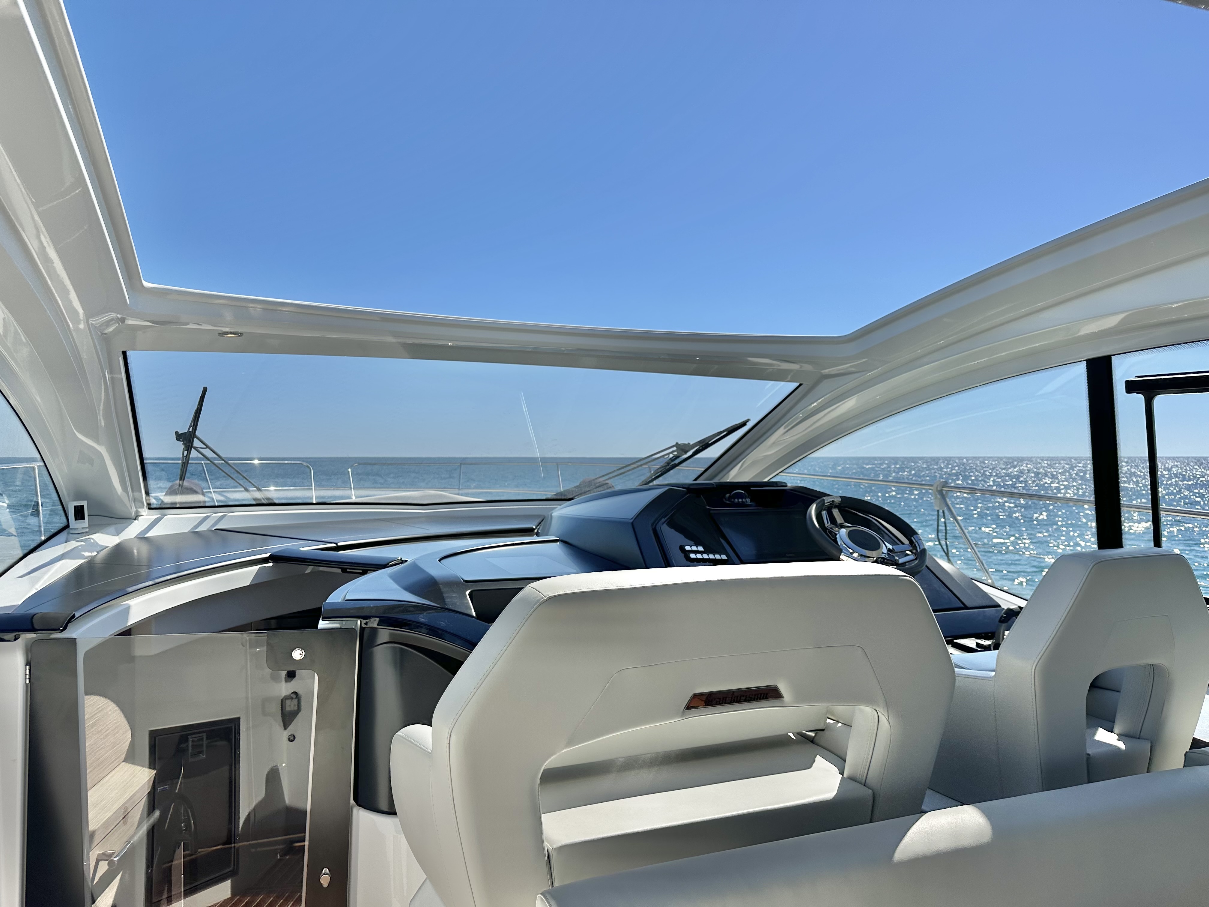 This particular example is powered by twin Volvo Penta D6-380hp diesel engines, low hours, with joystick control on outdrives. Comes with a comprehensive inventory including a Fischer Panda 5000i Neo generator (5kVA/4kW), air conditioning, hi/lo hydraulic platform, ice maker, Electronics pack, Comfort pack, Sports Chic pack, Foredeck pack, cockpit covers, cockpit enclosure and much more.