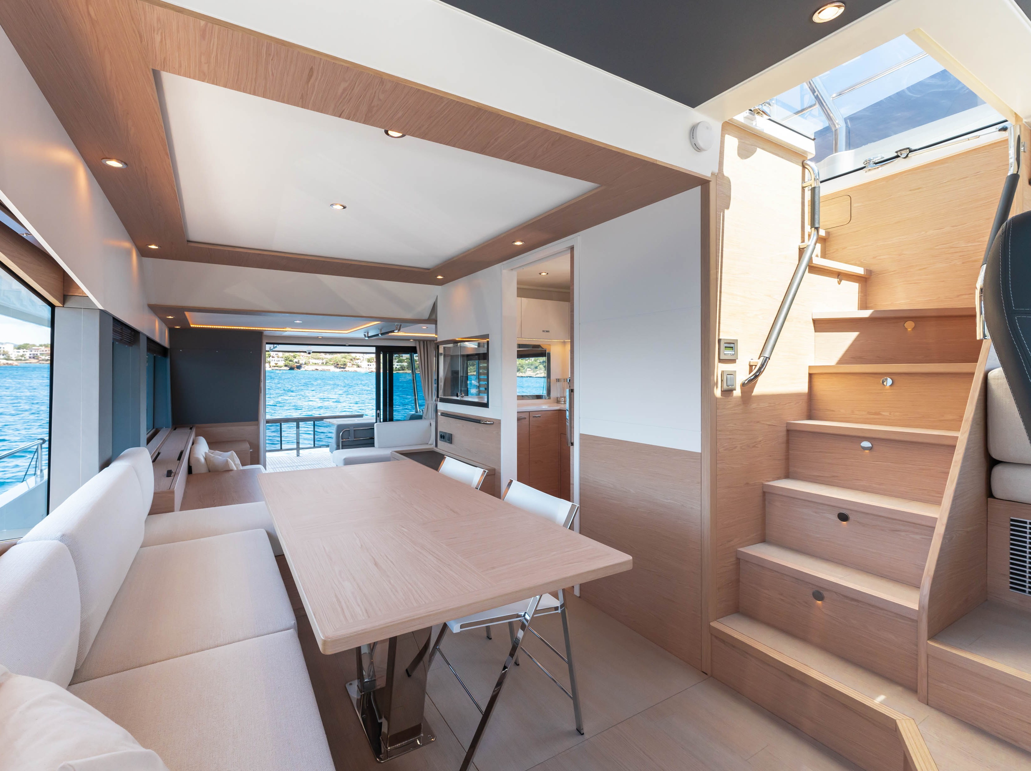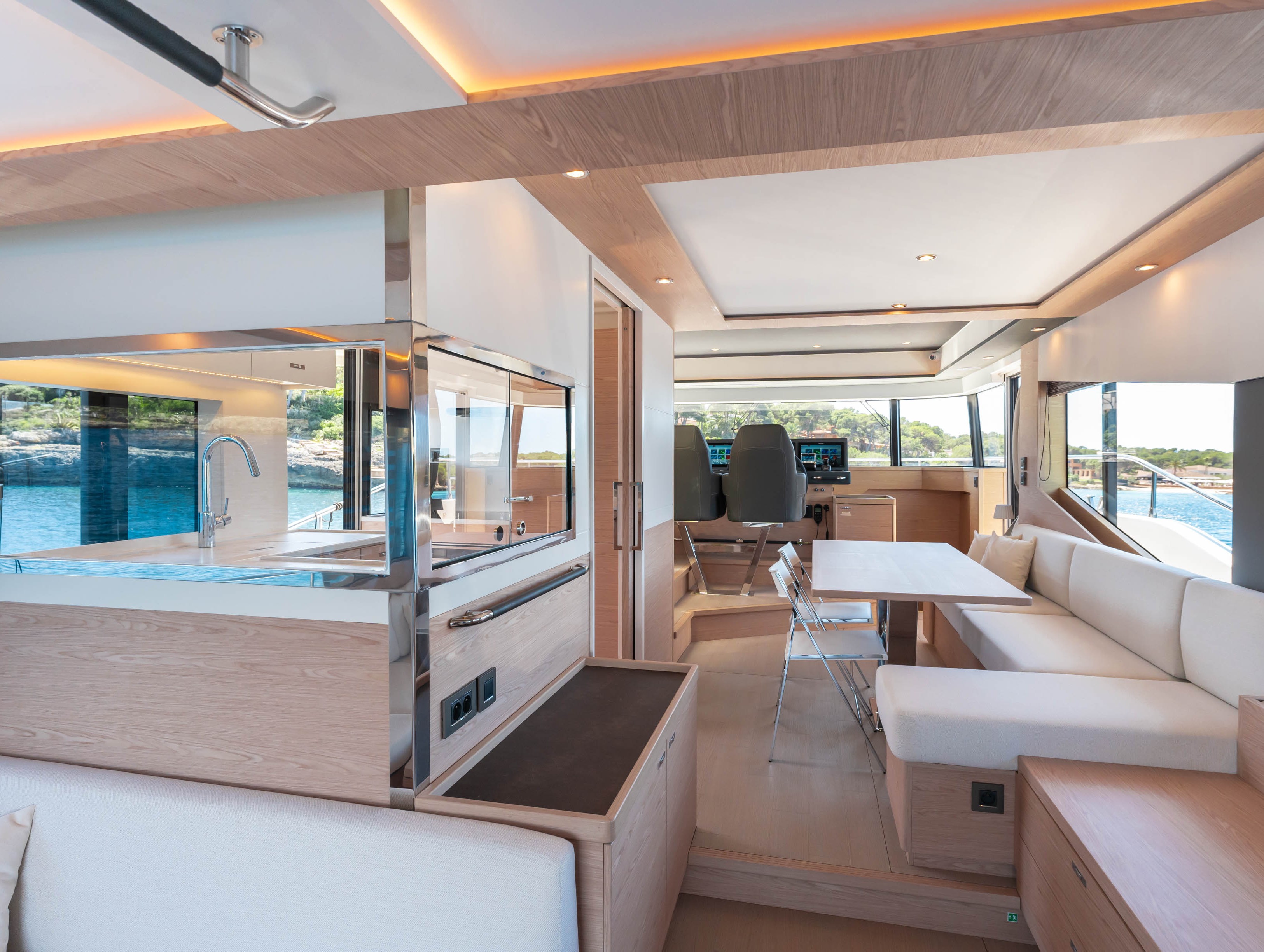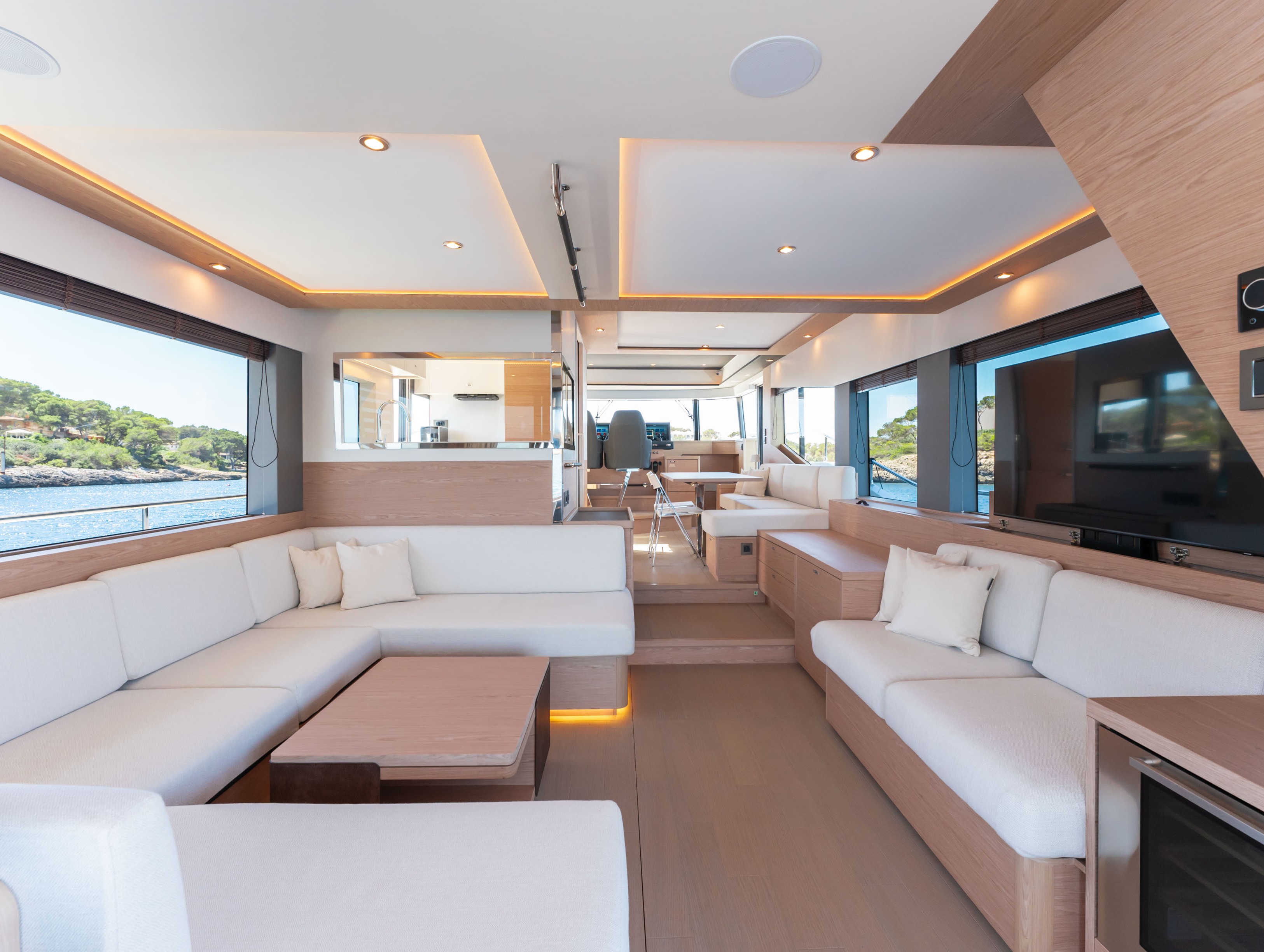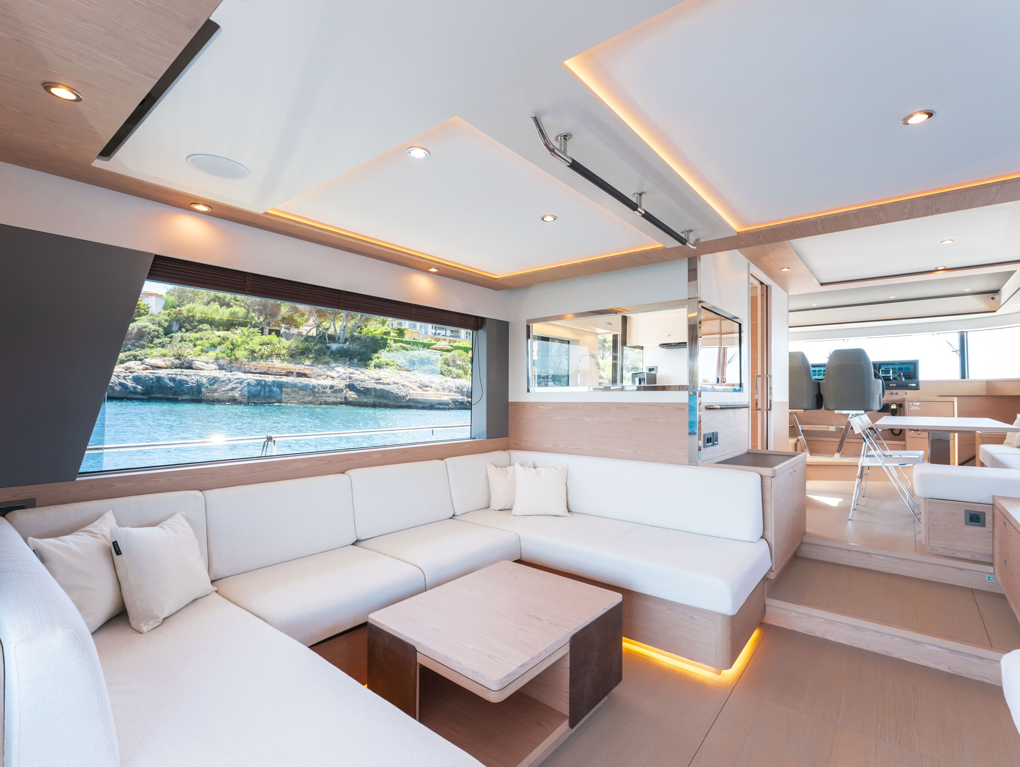 The beautiful open saloon with a U shaped sofa to the port side, surrounded by windows to let a lot of natural light in and a lot of storage and cupboard space.