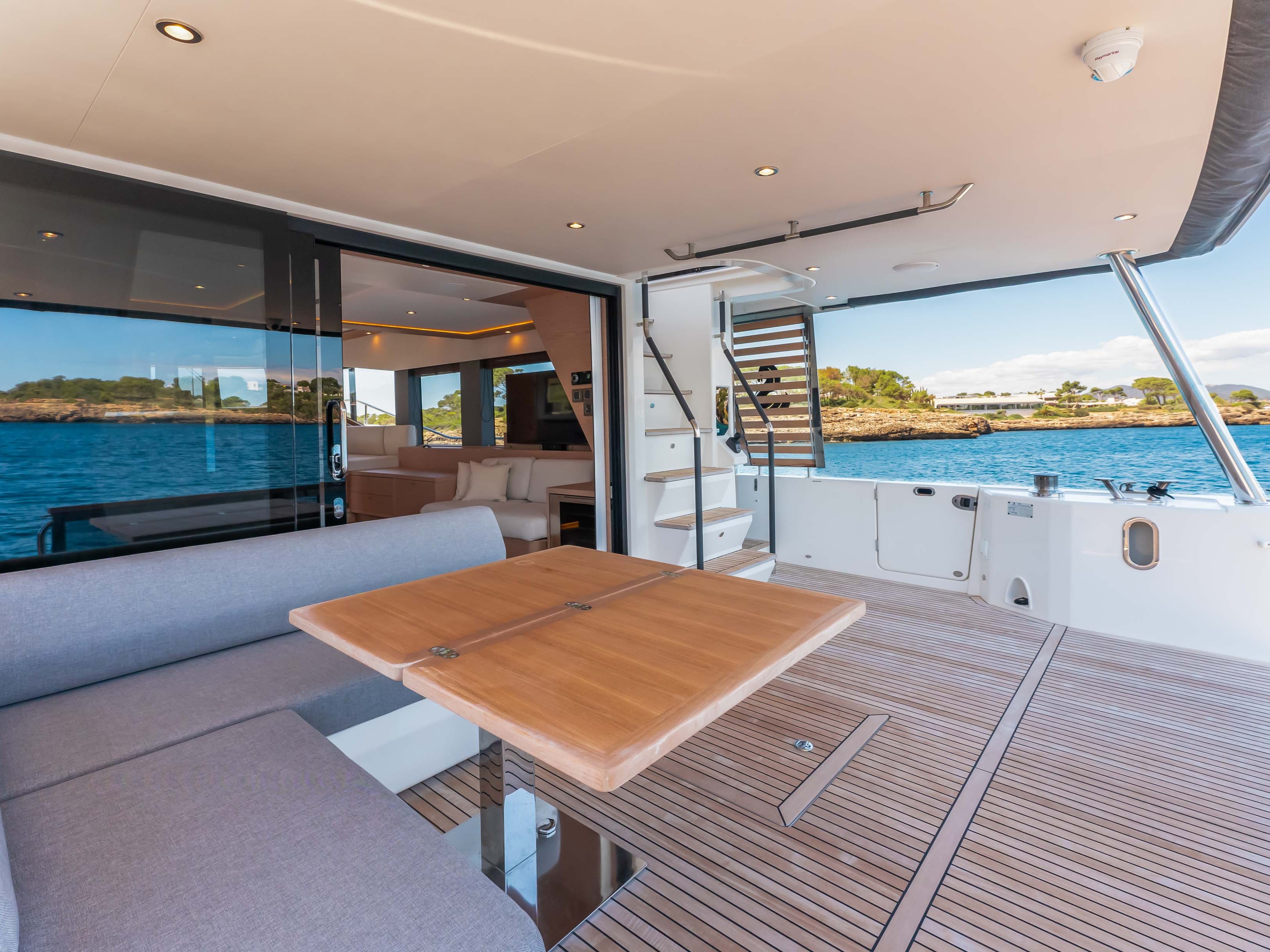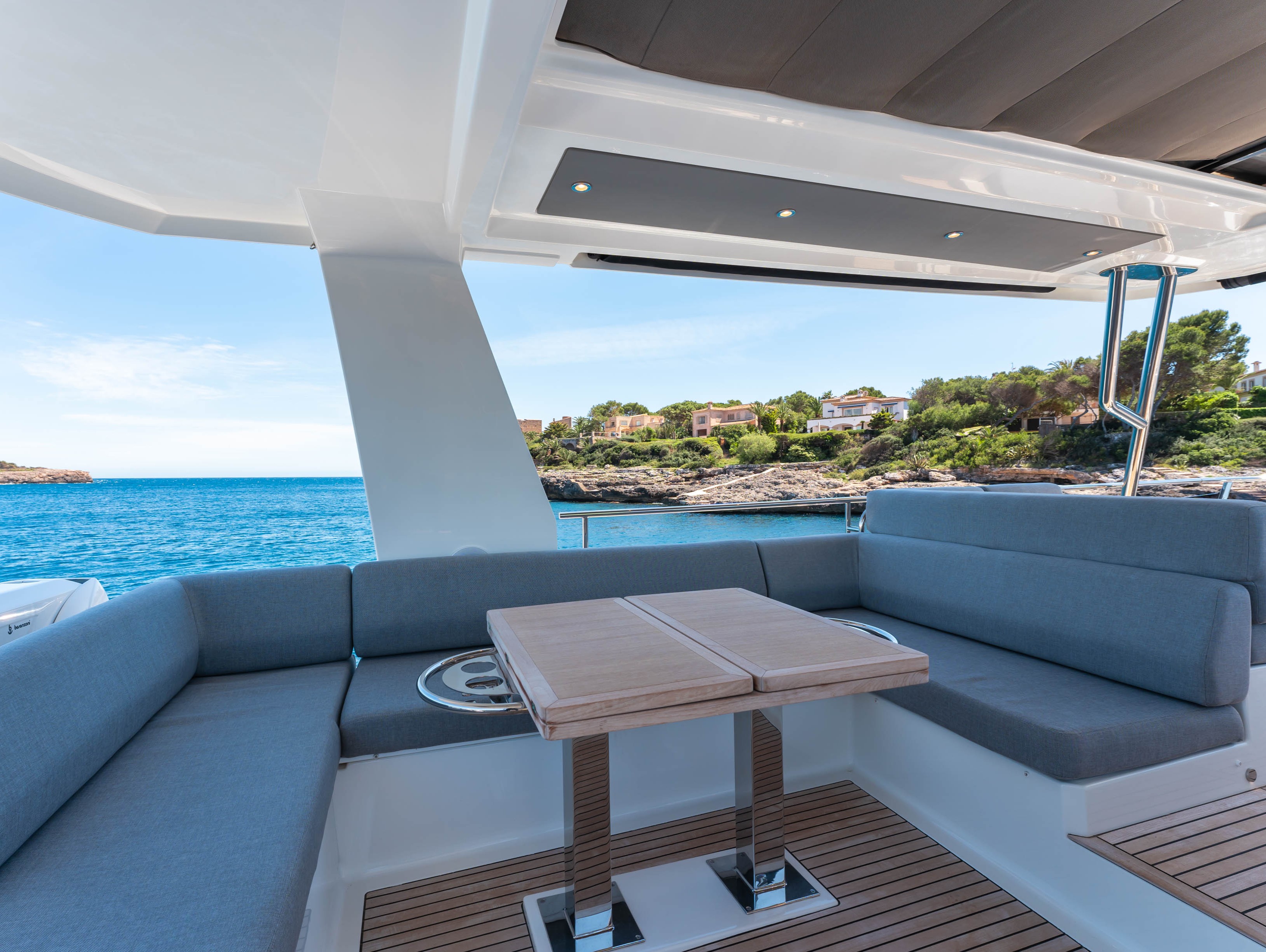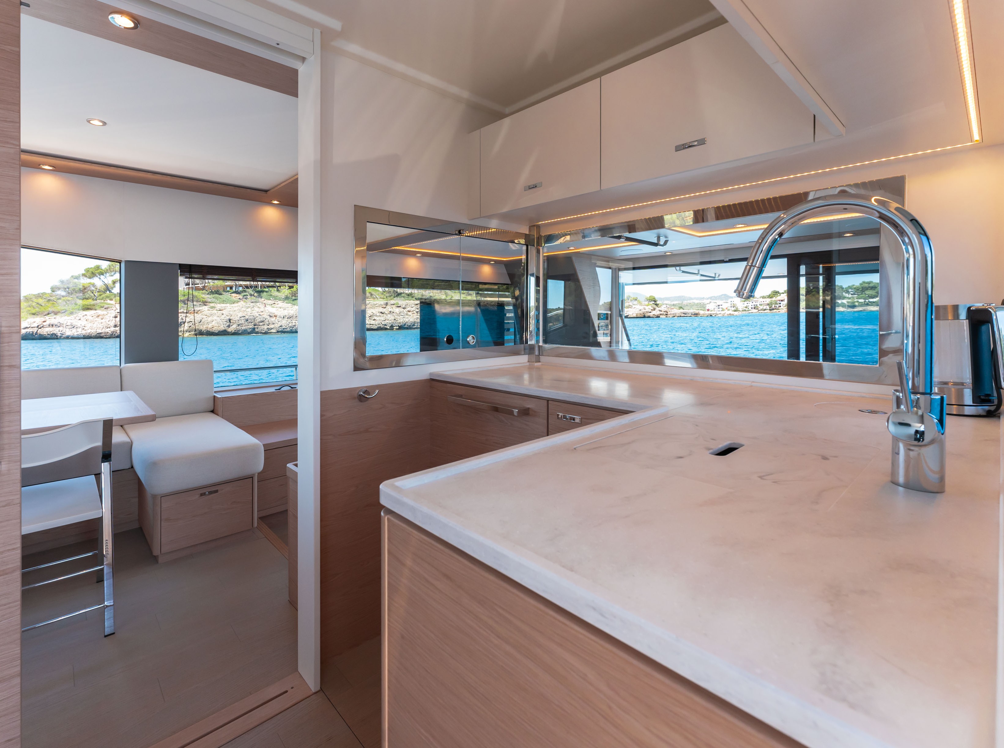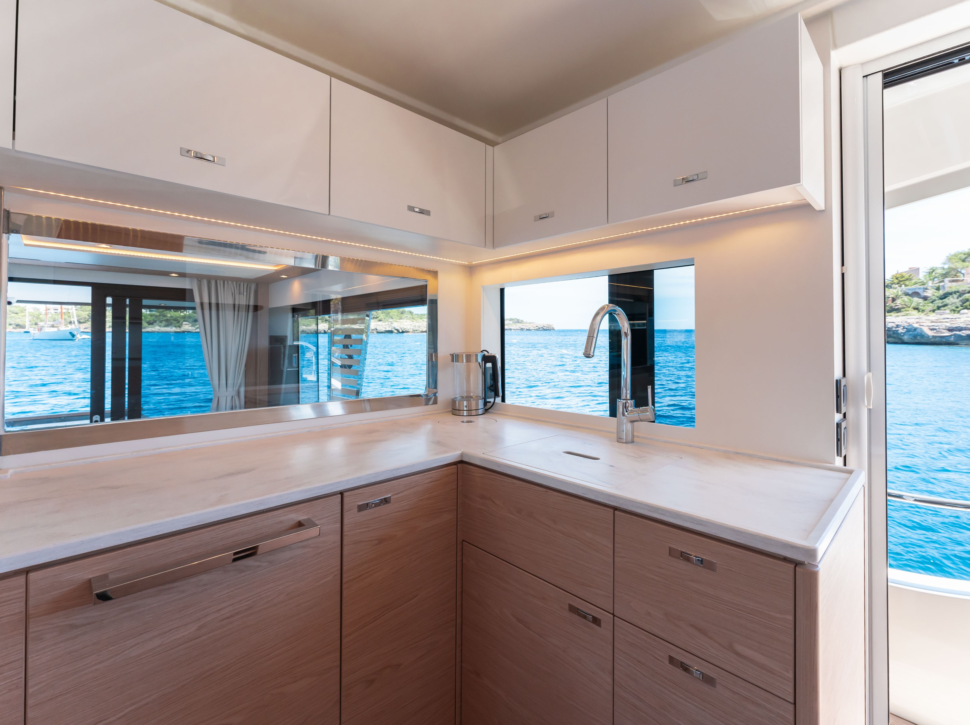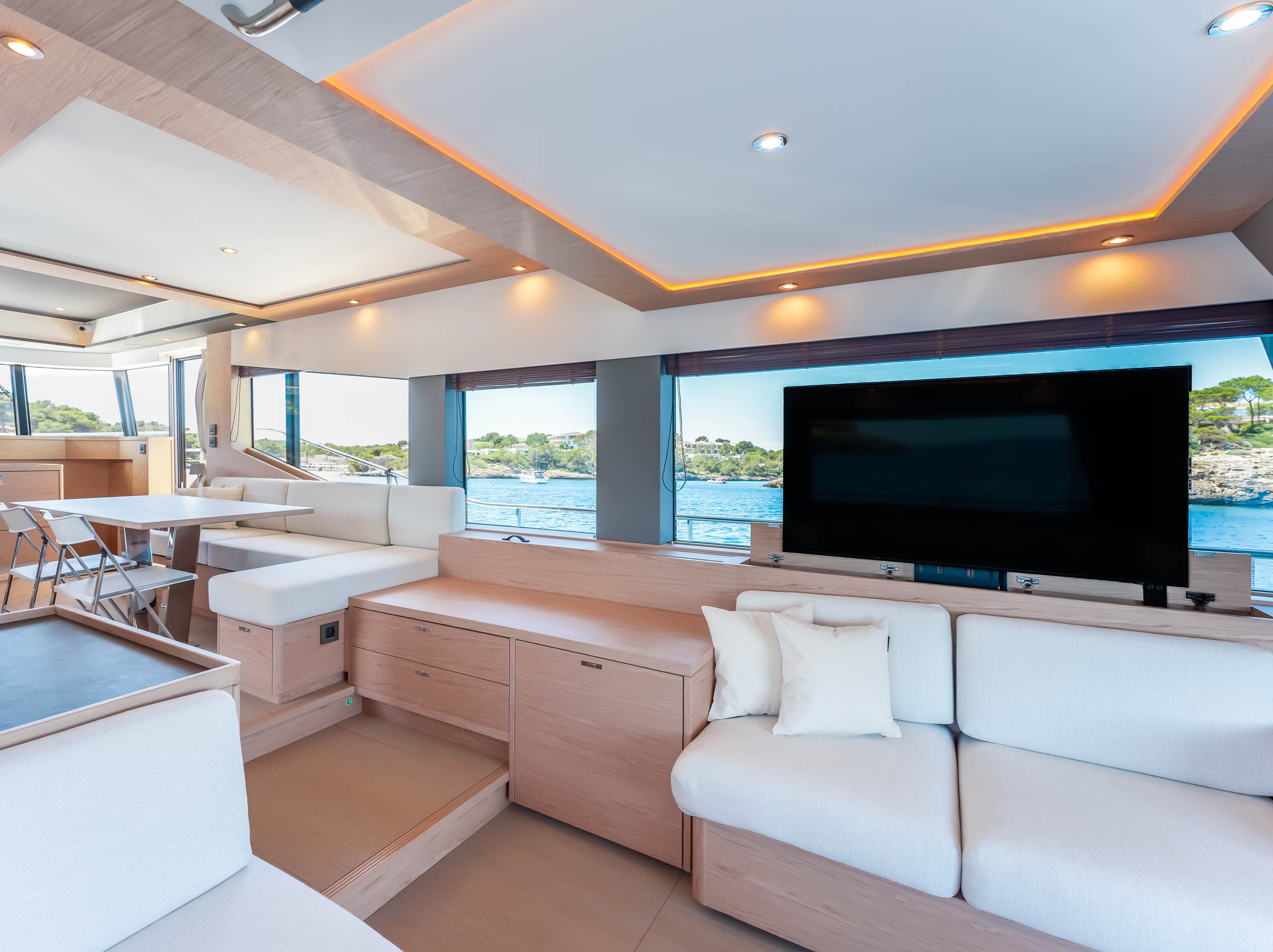 The beautiful open saloon with a U shaped sofa to the port side, surrounded by windows to let a lot of natural light in and a lot of storage and cupboard space.