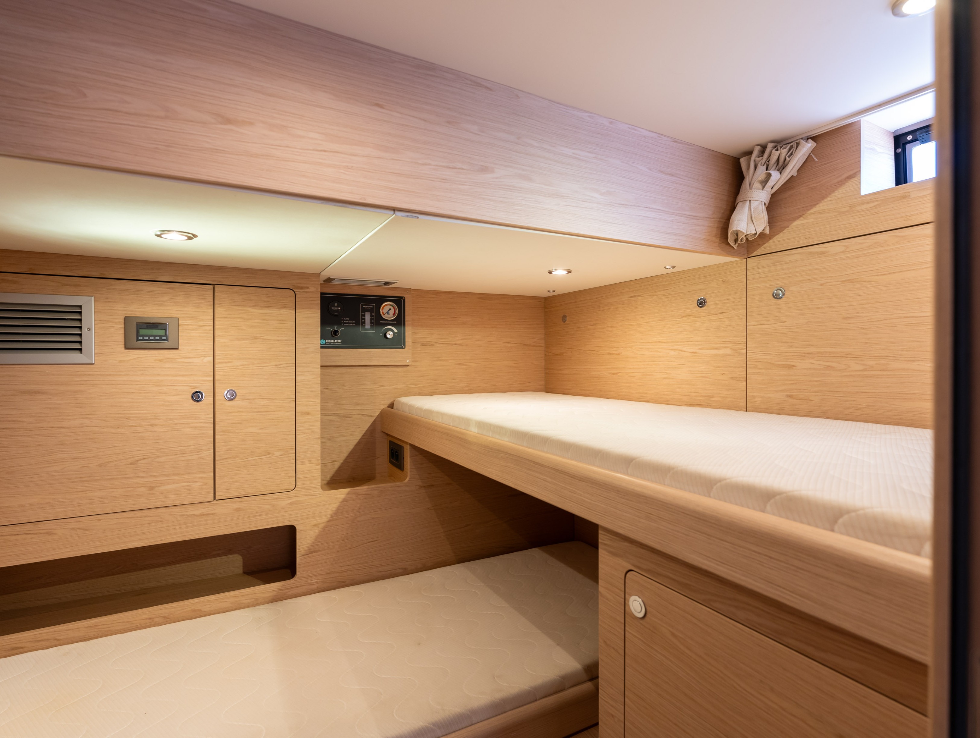 Two single berths in the Guest Cabin with a middle bedside table, opening and closing port holes and cupboard space. Attached onto a guest heads with an electric toilet, separate shower, sink and storage cabinets with a mirror.
