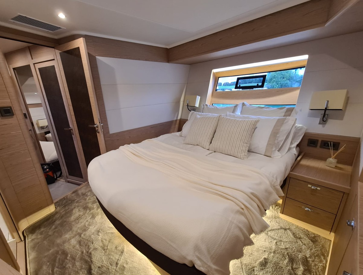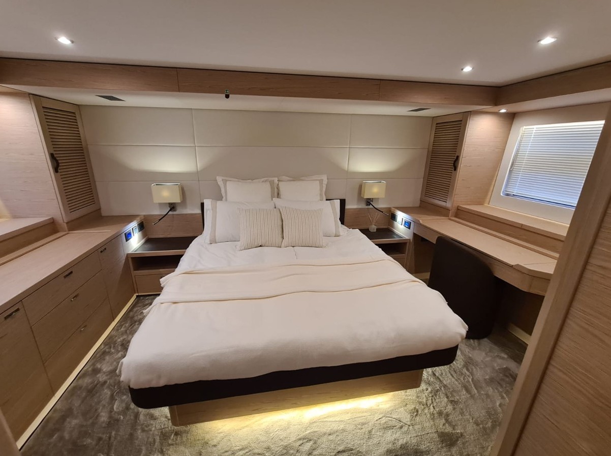 A double person berth below an upholstered headboard in Owners Cabin, with slatted doors on wardrobe and storage space, desk/vanity area and bedside tables. Attached onto the main heads with an electric toilet, separate shower, sink and storage cabinets with a mirror.