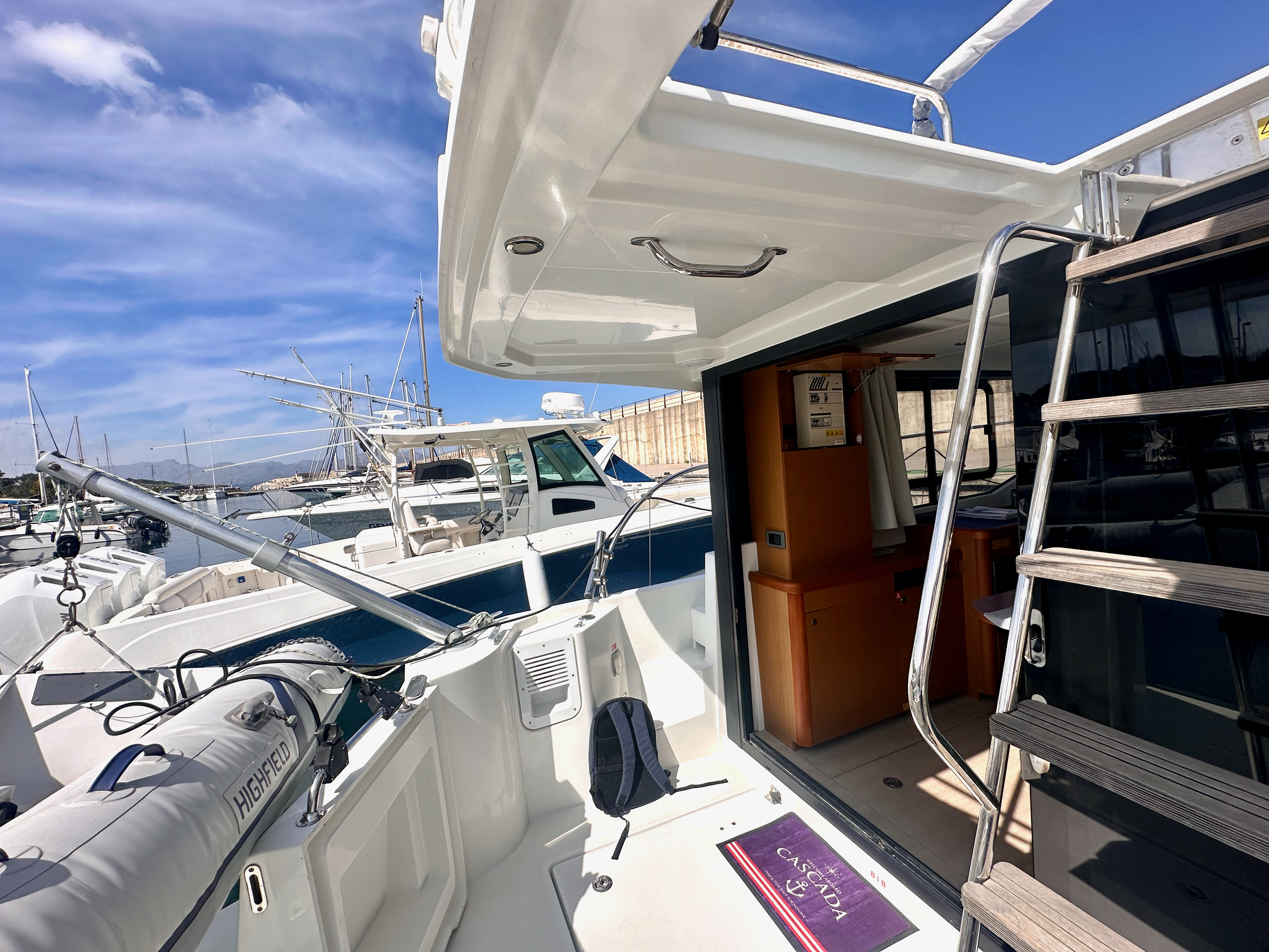 Access to flybridge with folding ladder, stainless steel and wooden handrail