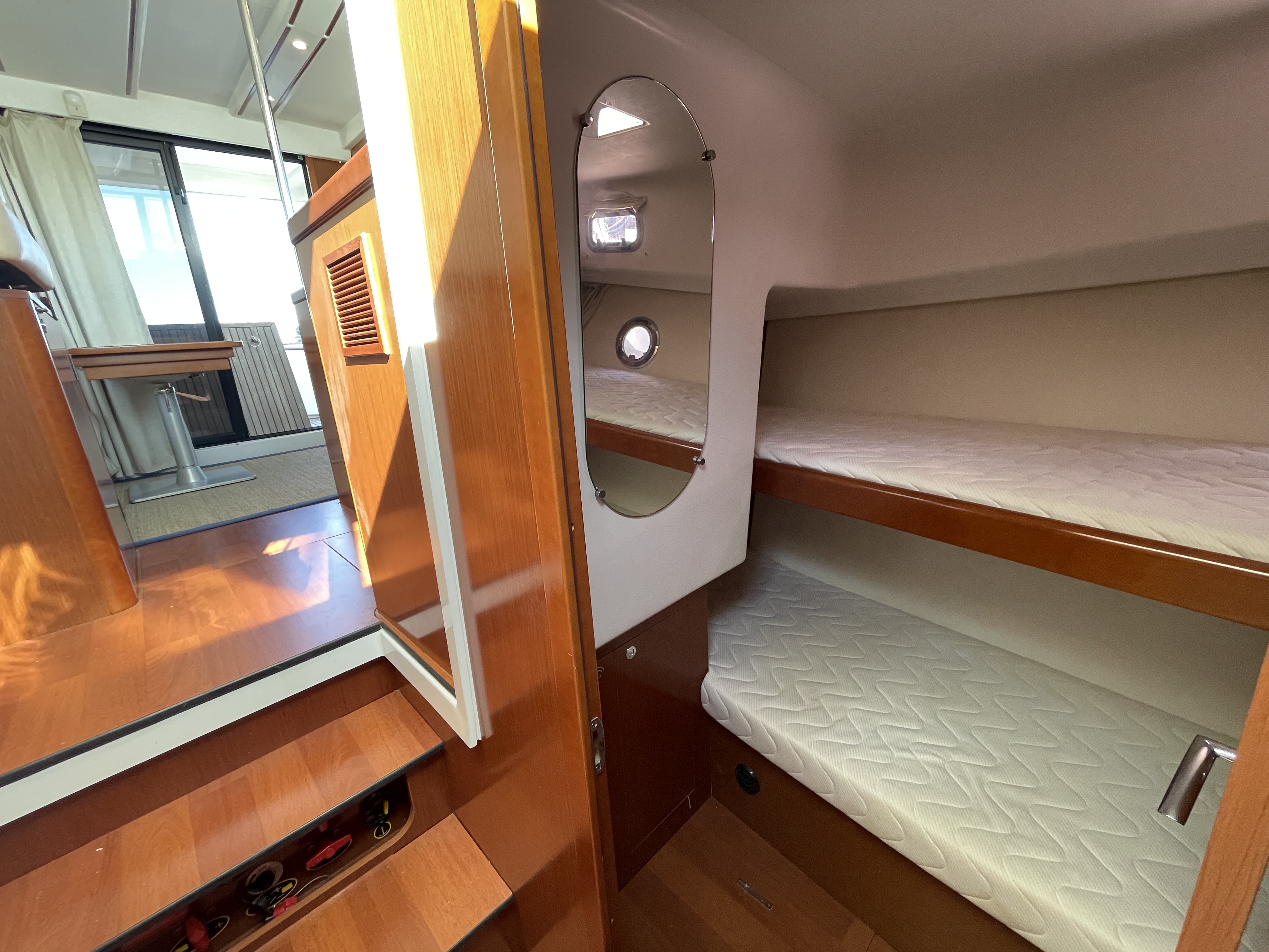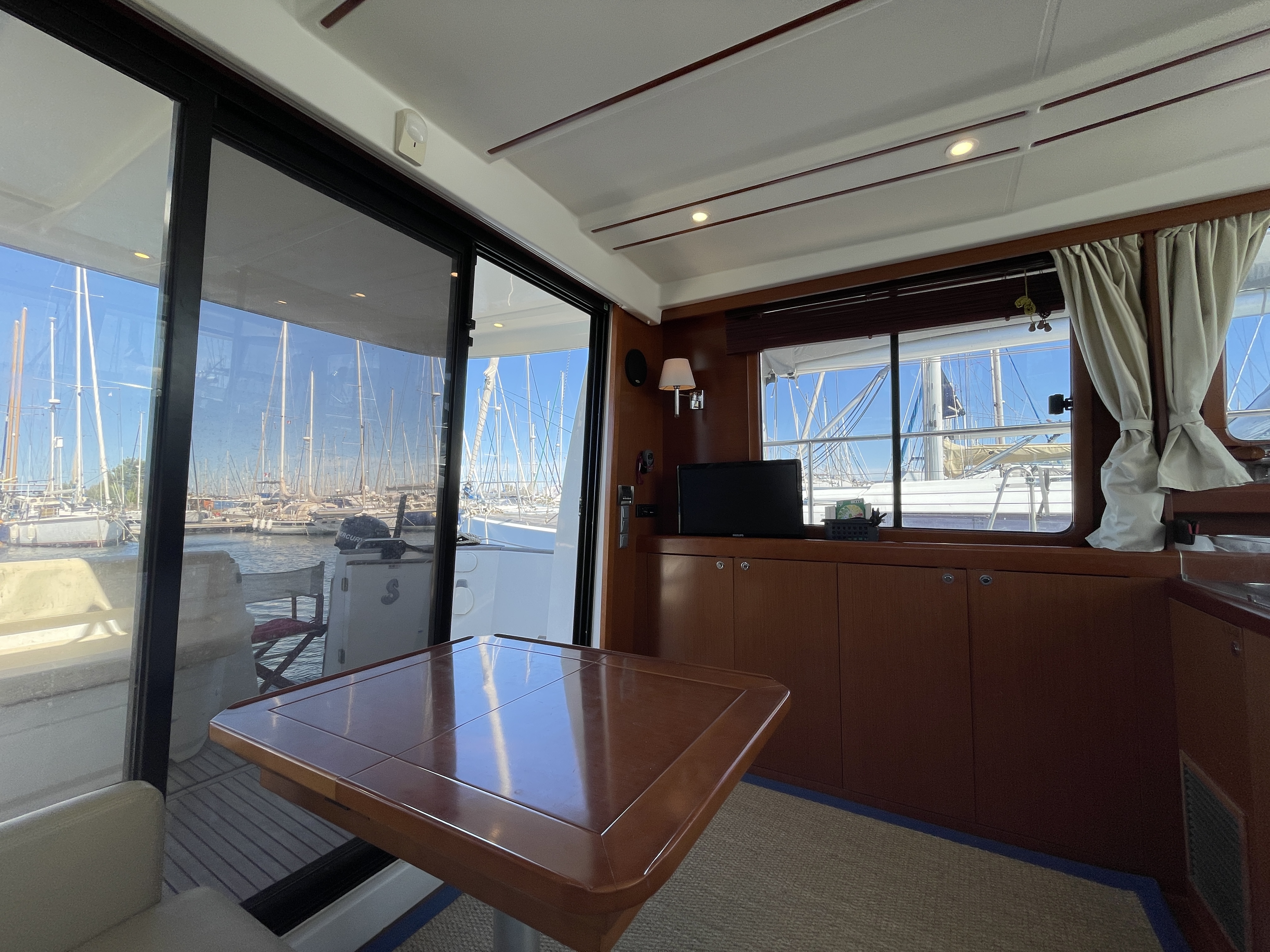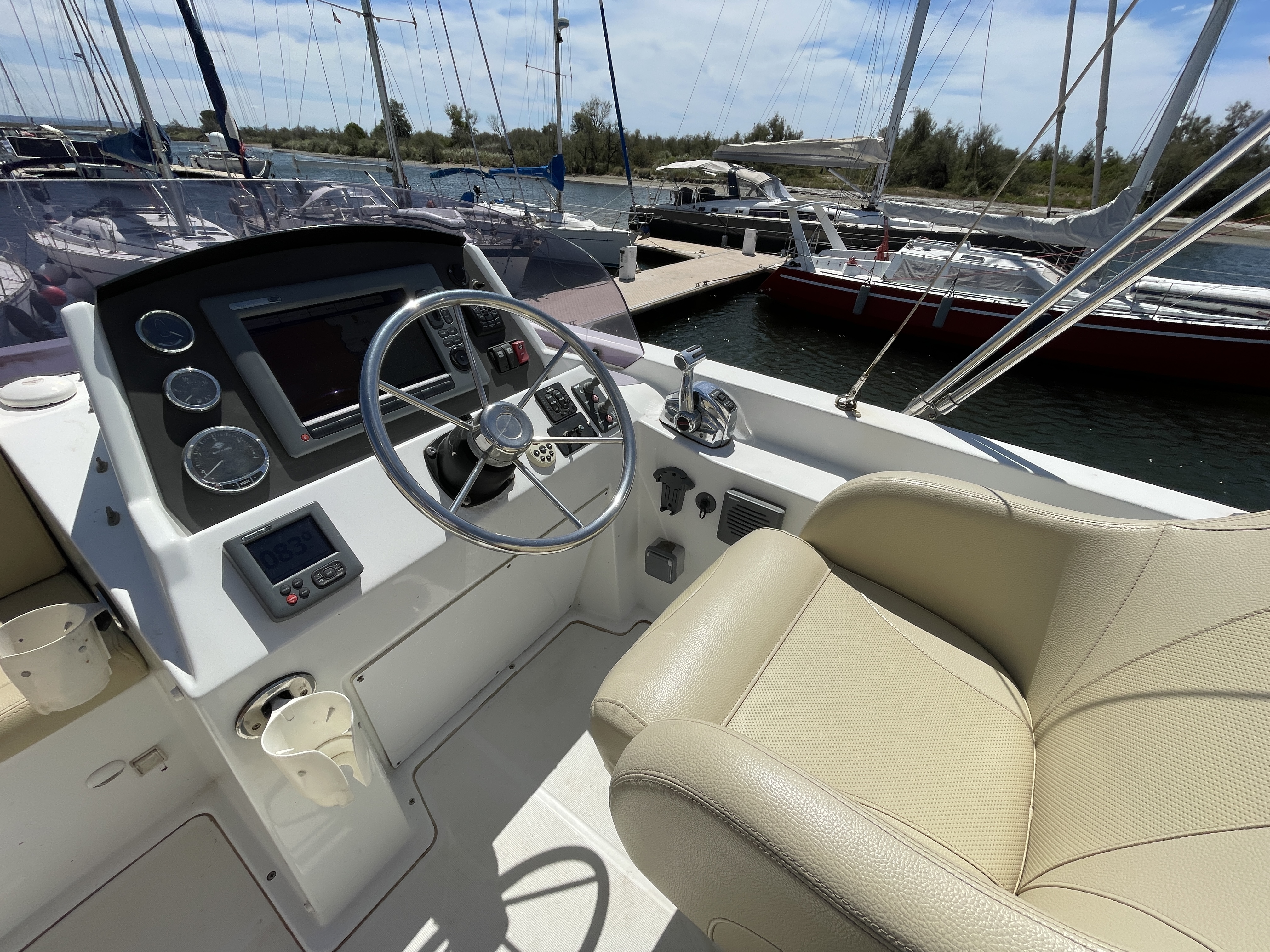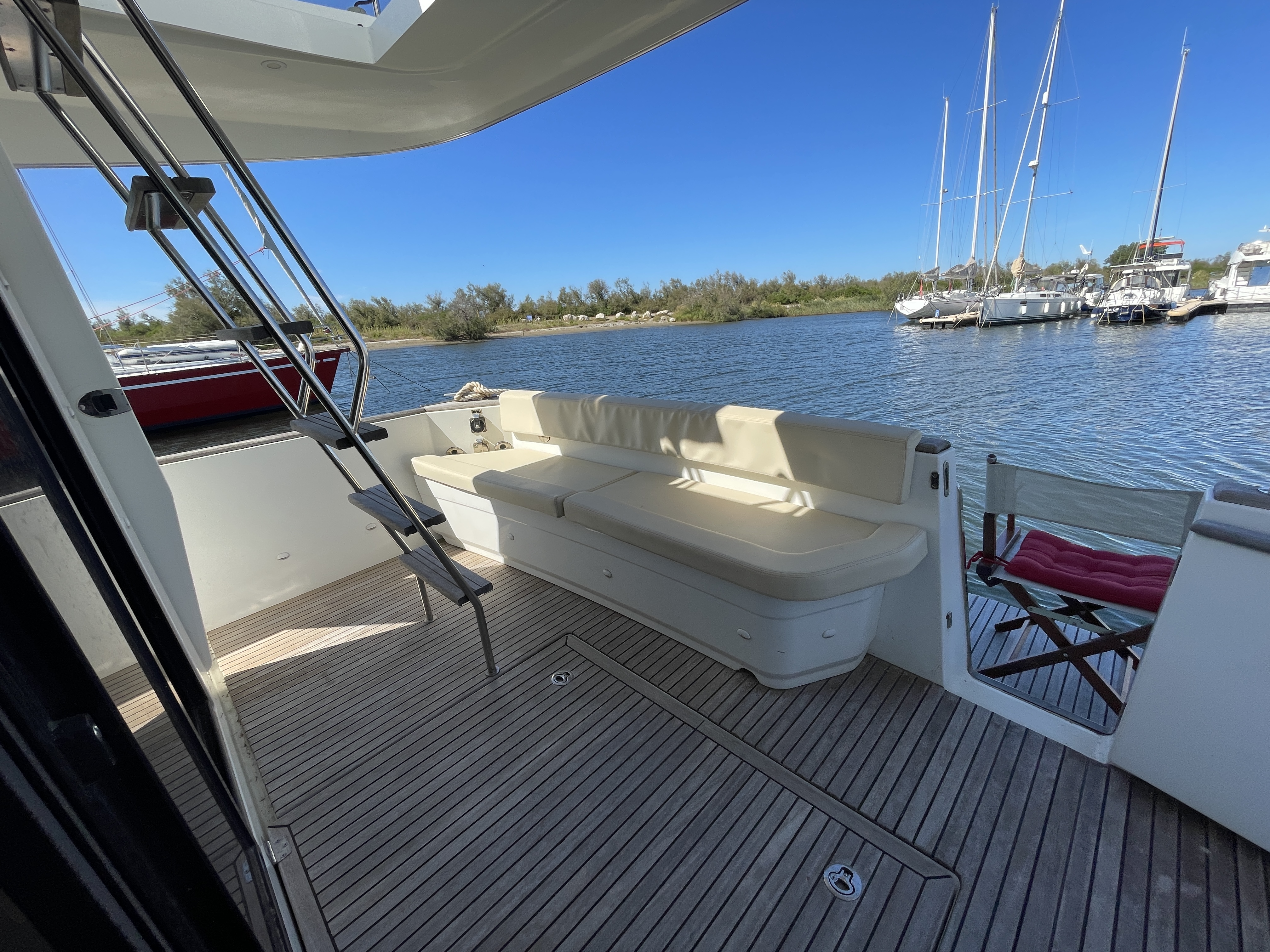 Équipement : propulseurs d'étrave et de poupe, climatisation, chauffage, électronique RAYMARINE, radar RAYMARINE, coussins pour le cockpit, le flybridge et le pont, lave-linge ELECTROLUX et réfrigérateur supplémentaire sous le plancher du cockpit