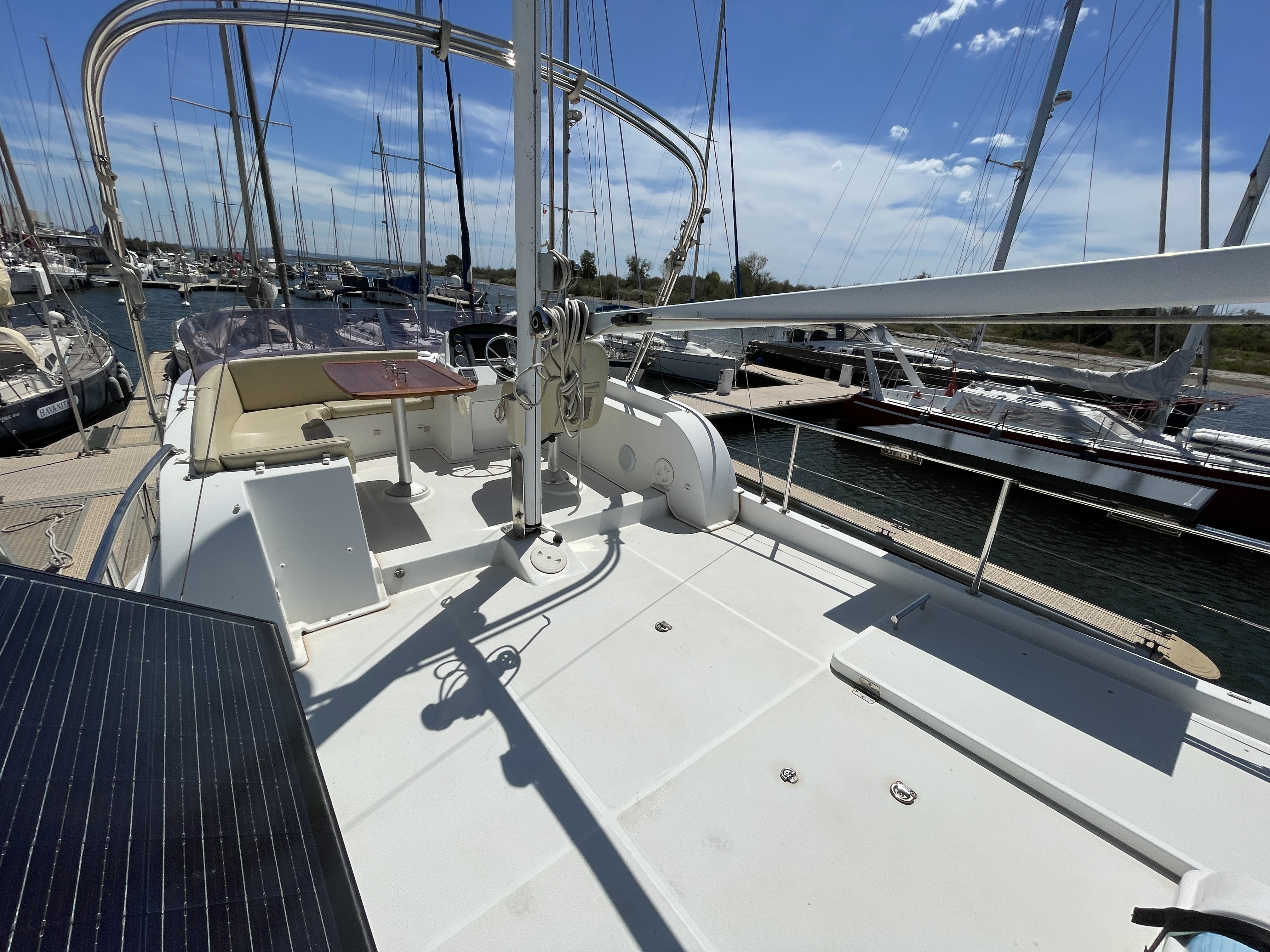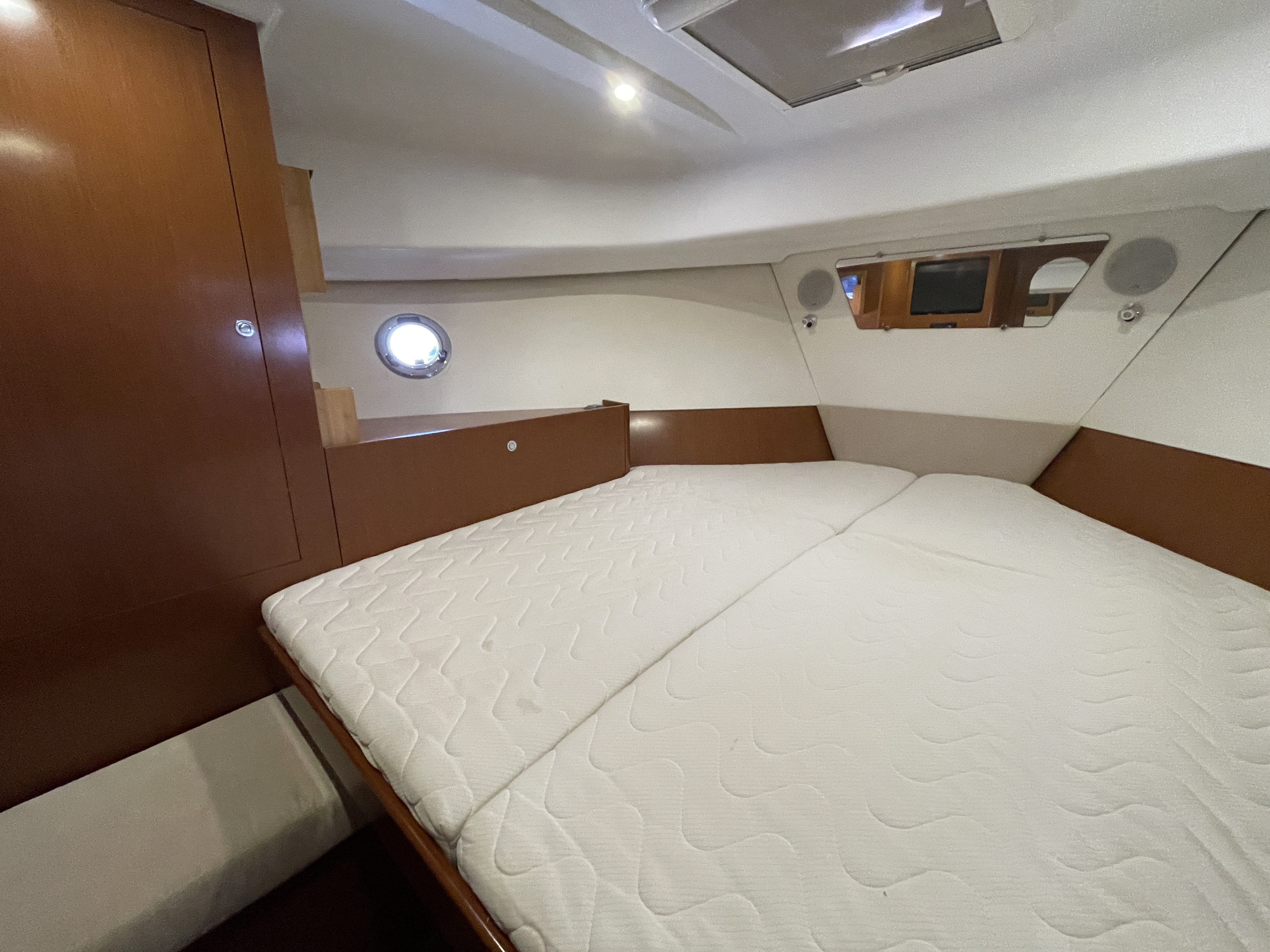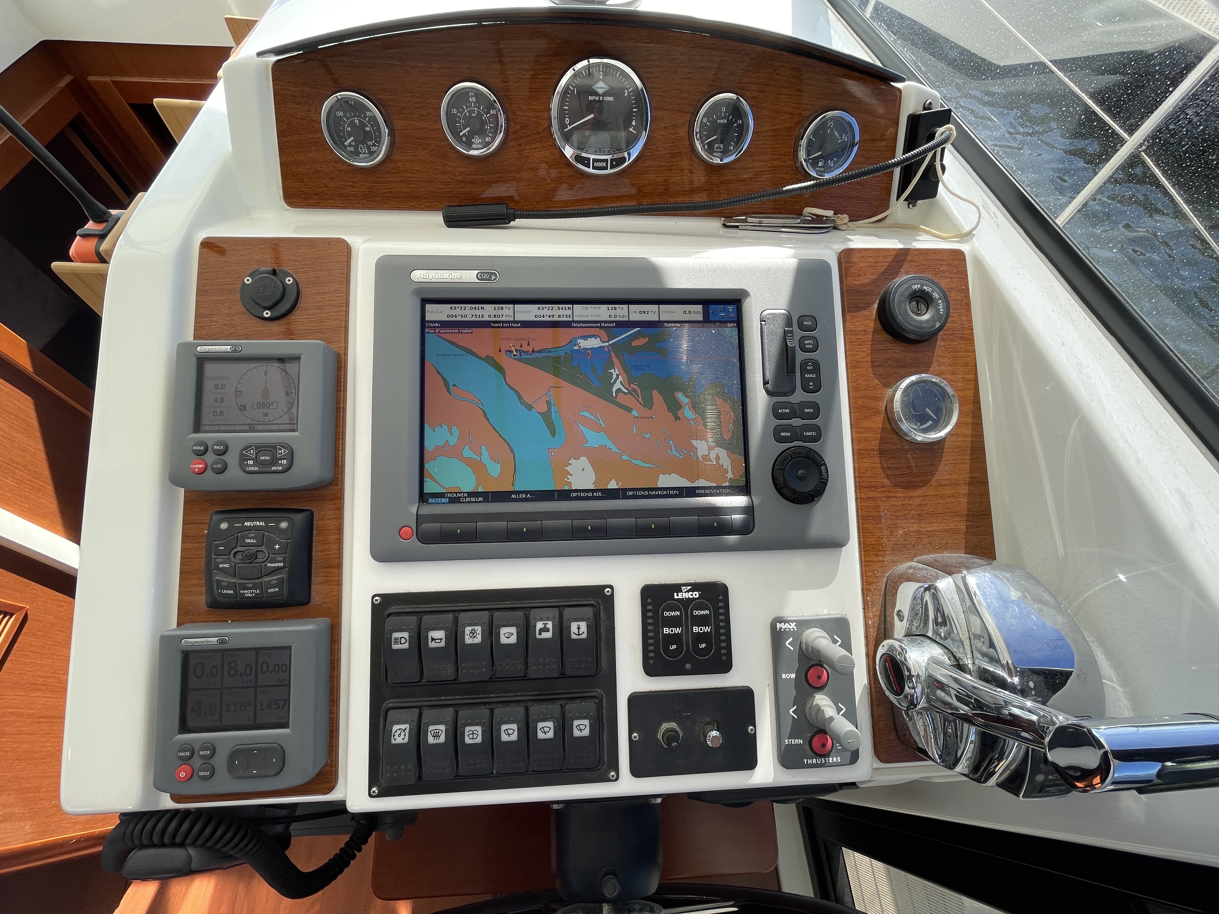 Équipement : propulseurs d'étrave et de poupe, climatisation, chauffage, électronique RAYMARINE, radar RAYMARINE, coussins pour le cockpit, le flybridge et le pont, lave-linge ELECTROLUX et réfrigérateur supplémentaire sous le plancher du cockpit