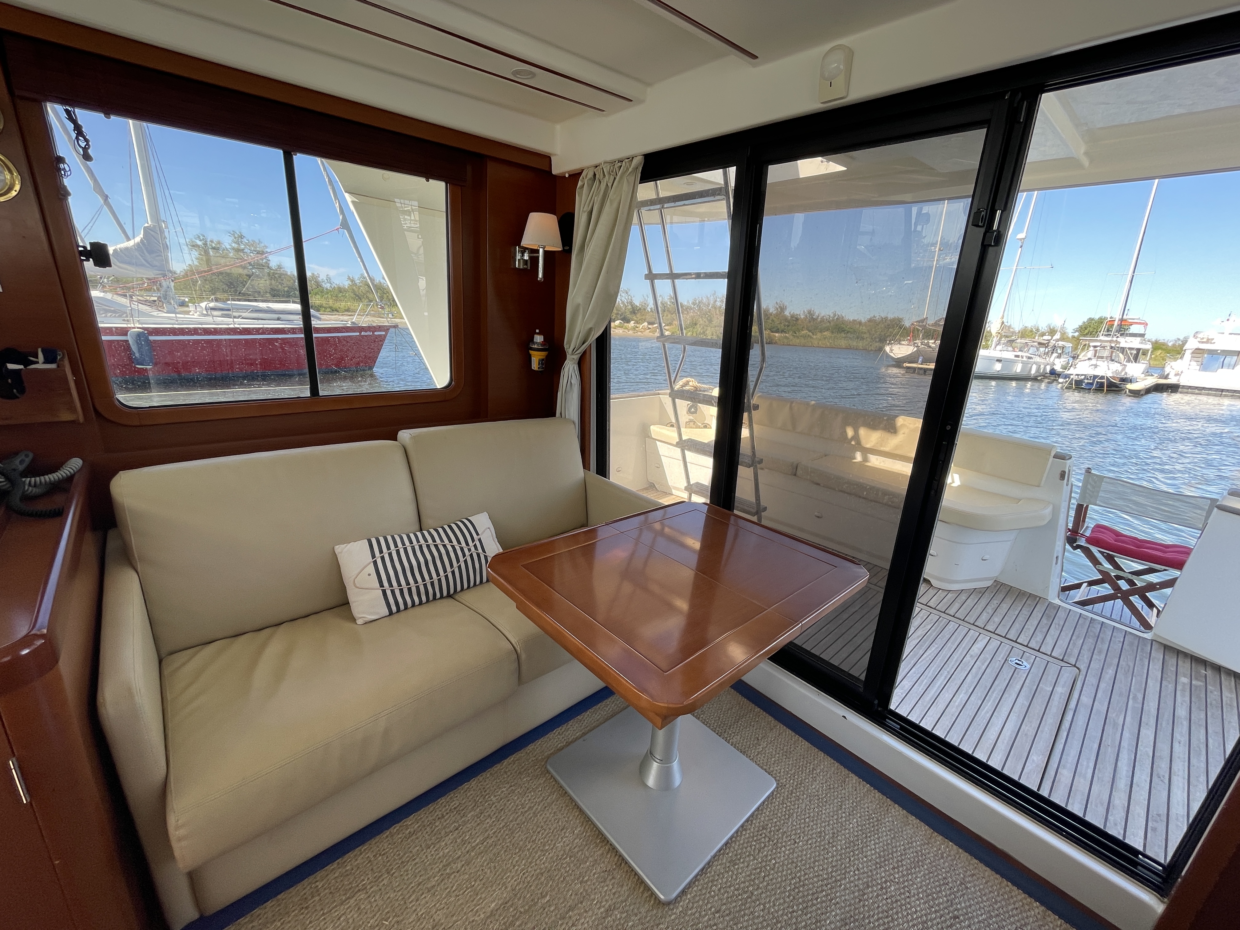 Single seat at helm on starboard with L shaped seat to port and deck table