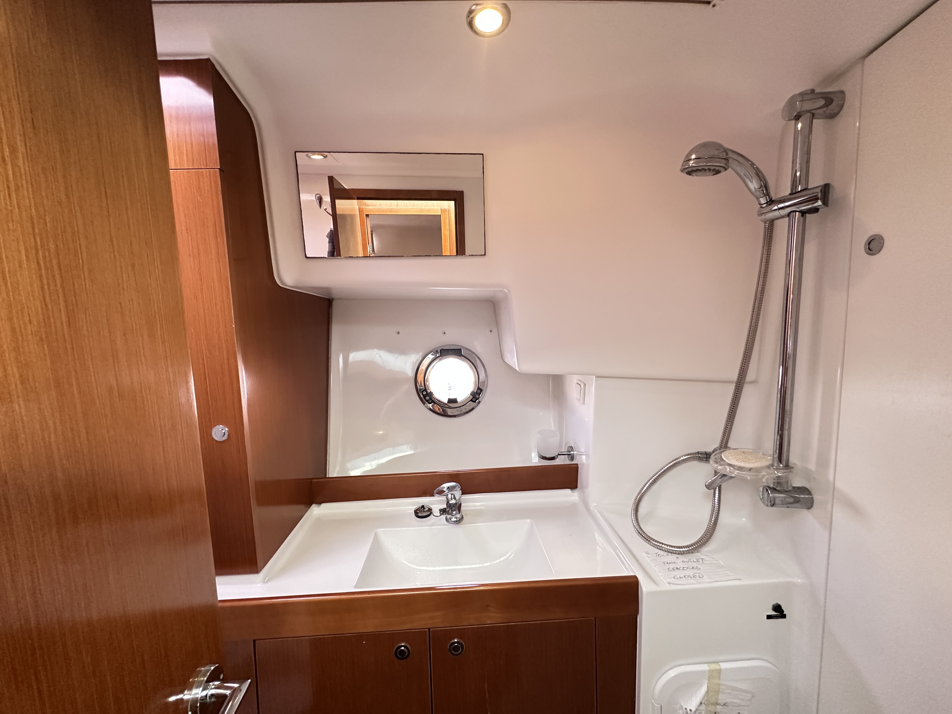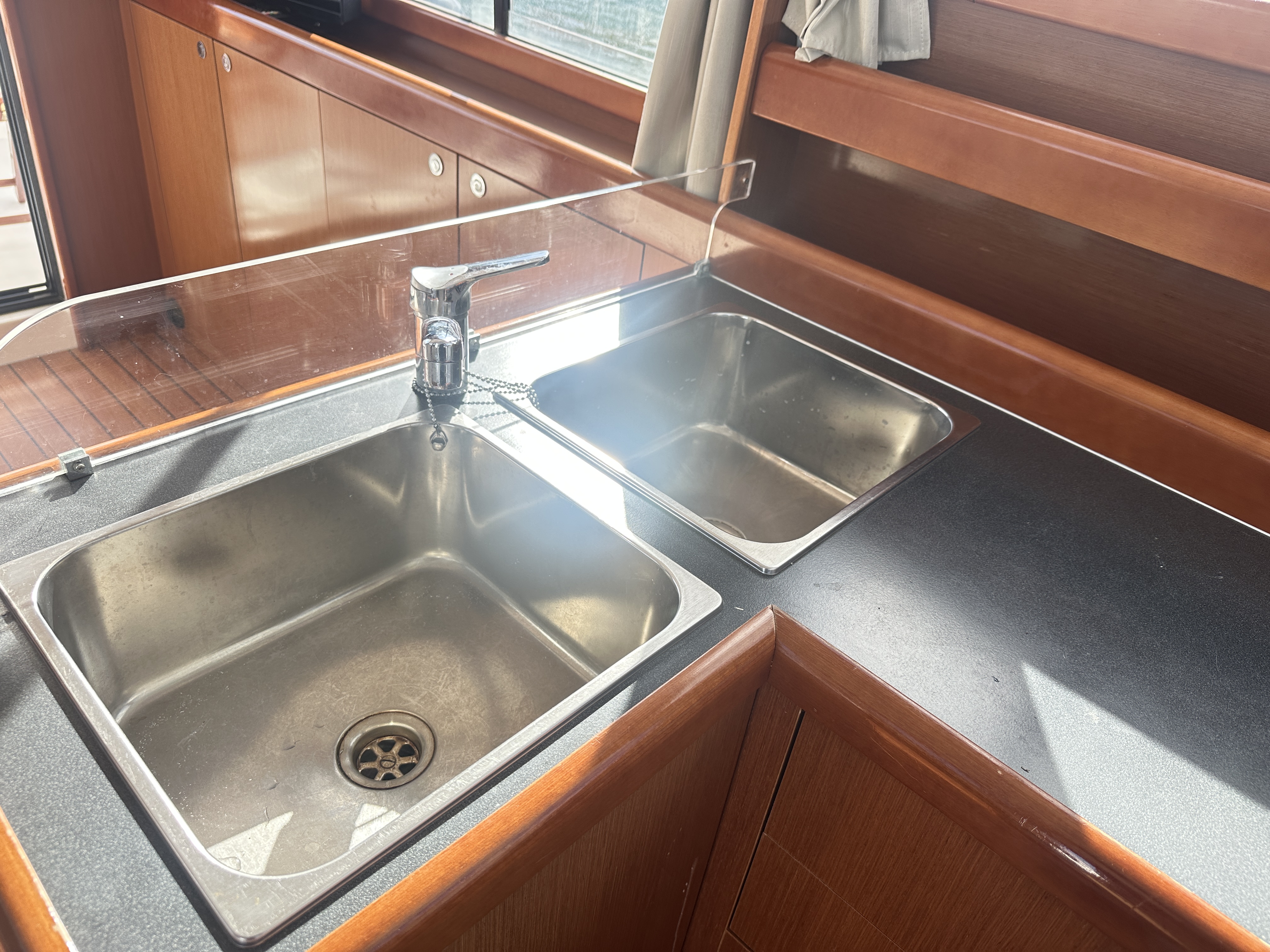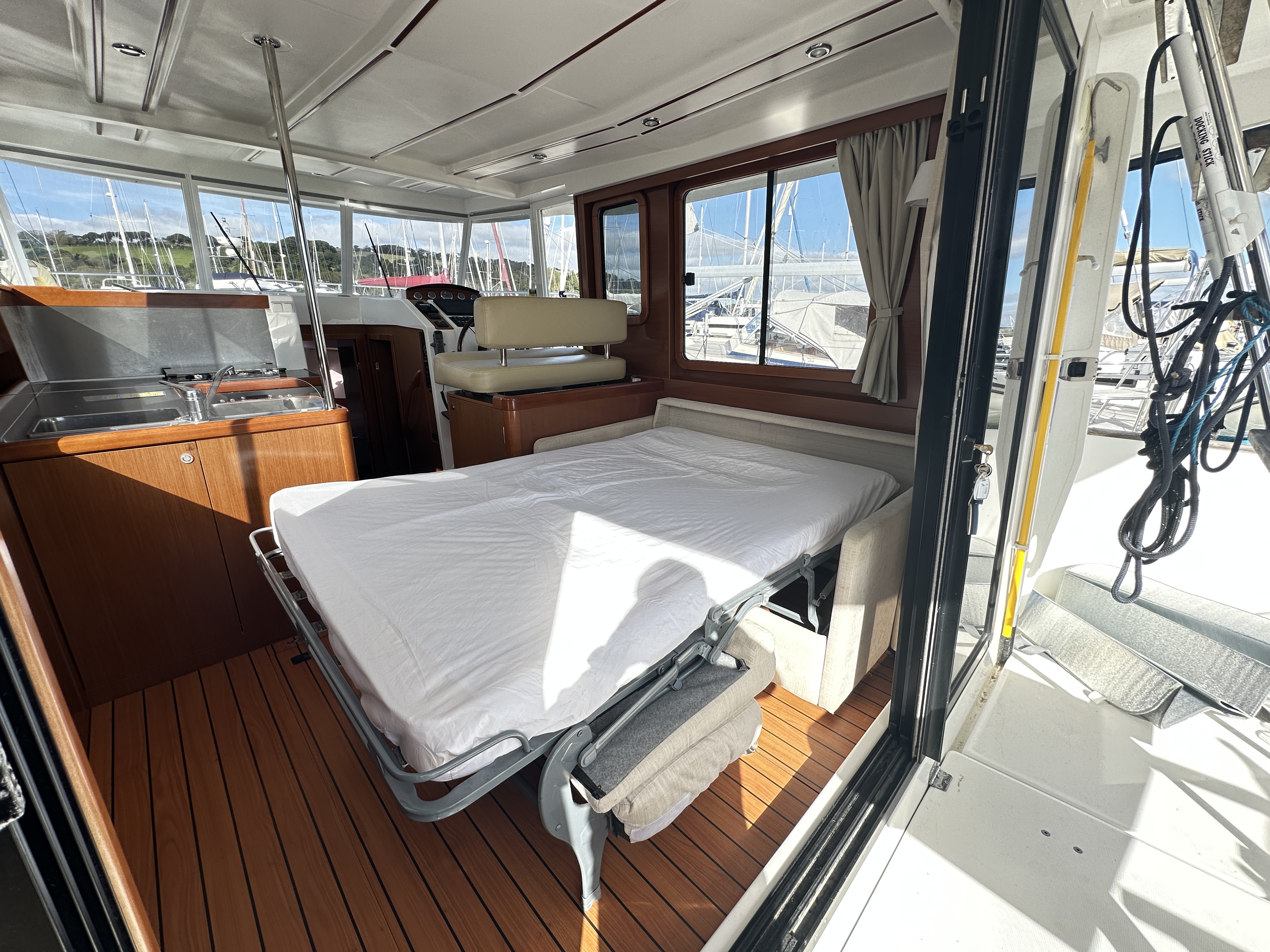 Large owners cabin with Island bed, twin bunk cabin plus large metal framed rollout sofa bed to saloon - sleeps 6 in true comfort.