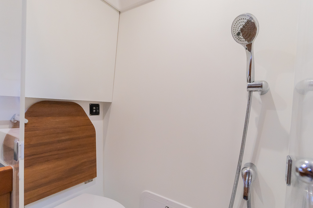 Heads compartment to starboard with electric quiet flush WC, additional heating outlet, washbasin and shower