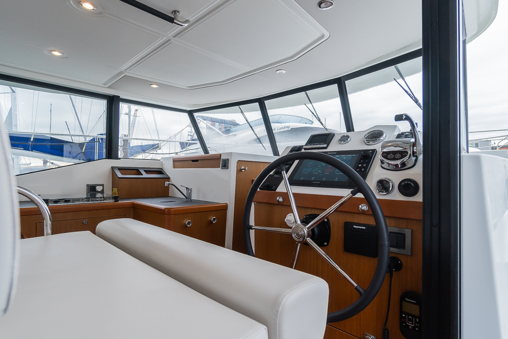 Built on a semi-planing flared hull, the Swift Trawler 35 has a Cummins 425 hp engine and the flybridge emphasises the boat’s harmonious profile and distinctive long distance cruising temperament. Broad walkways, lots of hand rails and high pushpits – higher than regulations require – reveal the importance attached to safety on board. Intended for long cruises, the Swift Trawler 35 offers a spacious interior with ingenious contemporary fittings with the owners cabin located forward and the second cabin with bunk berths to port. The U shaped galley is fitted with a twin sink that converts into a worktop and an extra forward-facing seat, while the saloon sofa converts to a comfortable double berth. Enjoy plenty of visibility from the Swift Trawler 35’s wheelhouse which has a 360° view and is bathed with natural light.