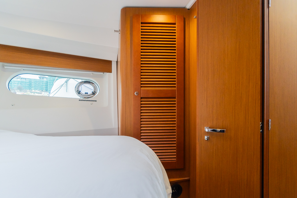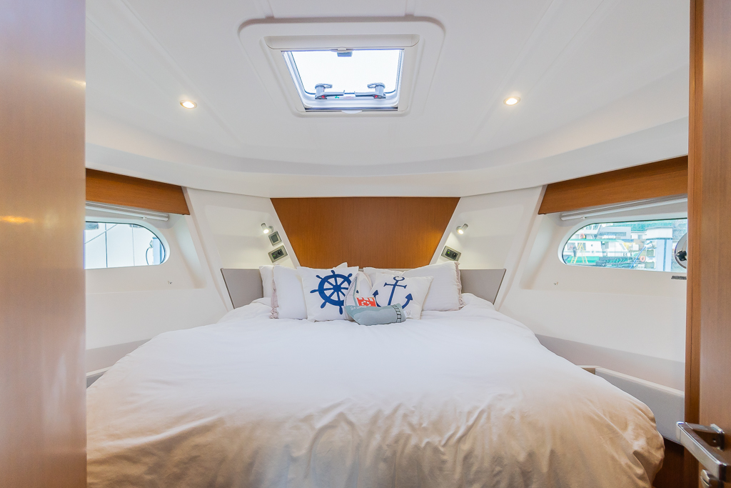 Master cabin forward with island double berth, hanging locker, reading lights USB and power sockets.