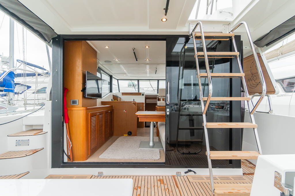 Saloon with seating which converts to double berth, weighted saloon table, curtain (between galley and saloon) and stowage