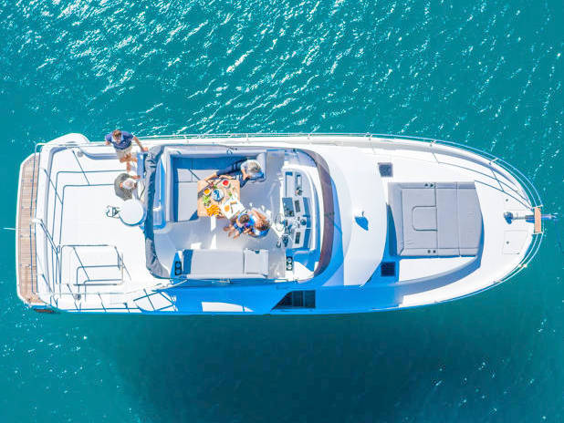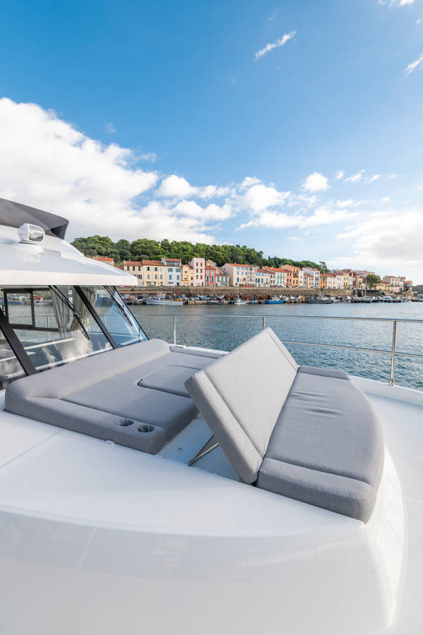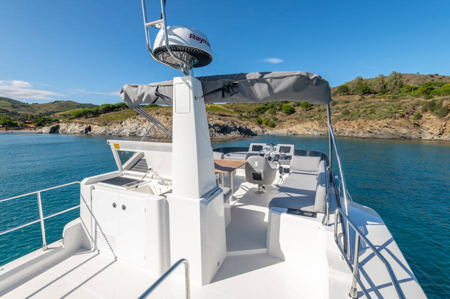 Rotating helm seat (for additional seating at the saloon) with handrails, removable floor step, sliding side door with direct access to catwalk.