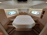 Superb owners cabin forward with island double berth and padded headboard, with storage underneath and stowage on both sides of berth, hanging wardrobe with lighting, cupboard with shelves, opening hatch with mosquito screen and blind, two hull windows with opening portholes and venetian blinds.