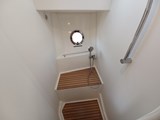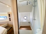 Hot and cold shower with curtain, moulded wooden seat and floor, towel rail. Opening deck hatch with integrated blind and opening hull porthole.