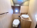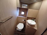 Mirror, top and bottom cupboard, opaque opening porthole, electric toilet flushing with fresh and salt water, oval washbasin with mixer tap, hot and cold shower, towel rail.