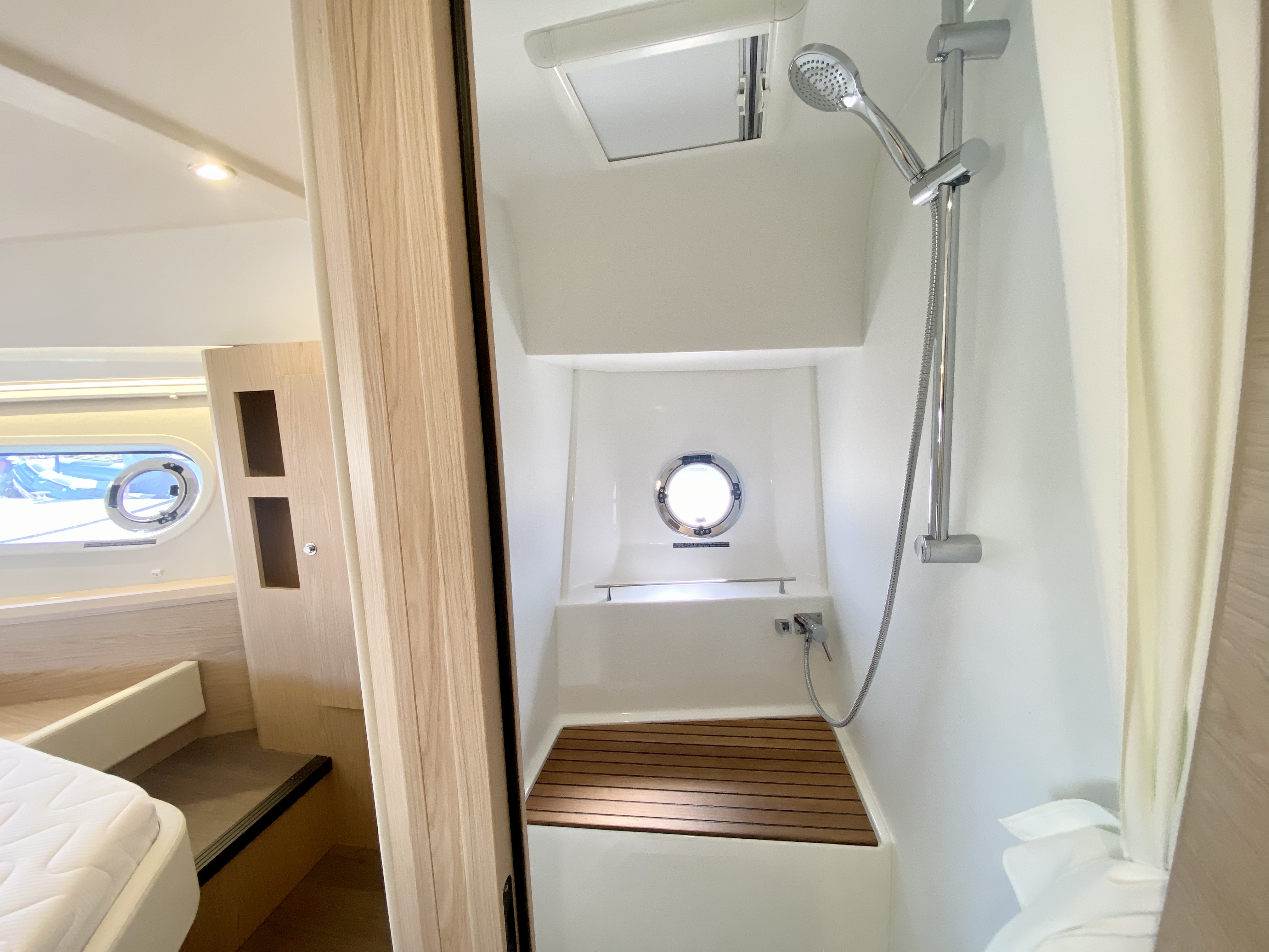 Hot and cold shower with curtain, moulded wooden seat and floor, towel rail. Opening deck hatch with integrated blind and opening hull porthole.