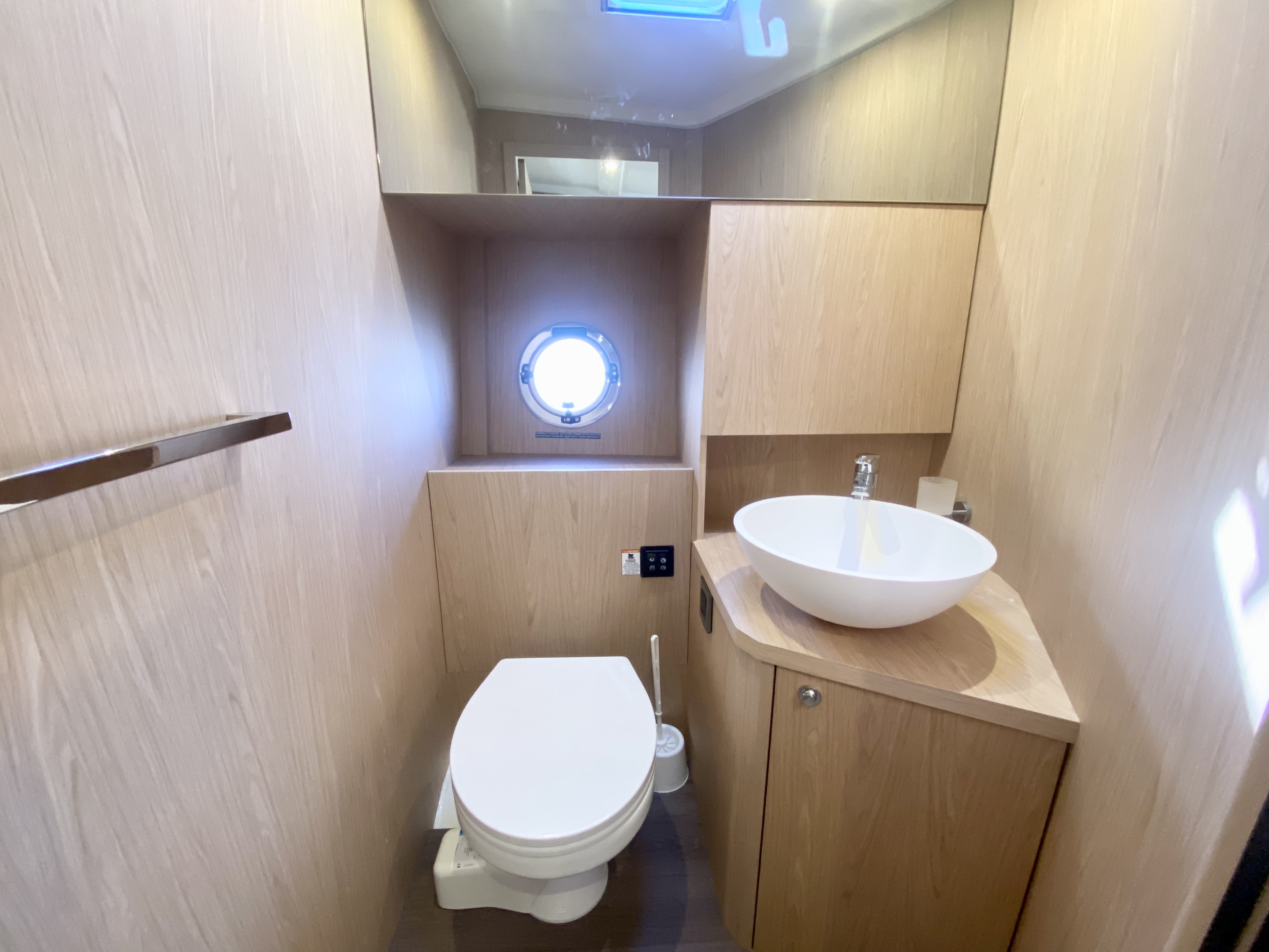 Mirror, top and bottom cupboard, electric flushing toilet with fresh and salt water, oval washbasin with mixer tap, opening deck hatch with integrated blind and opaque hull porthole.