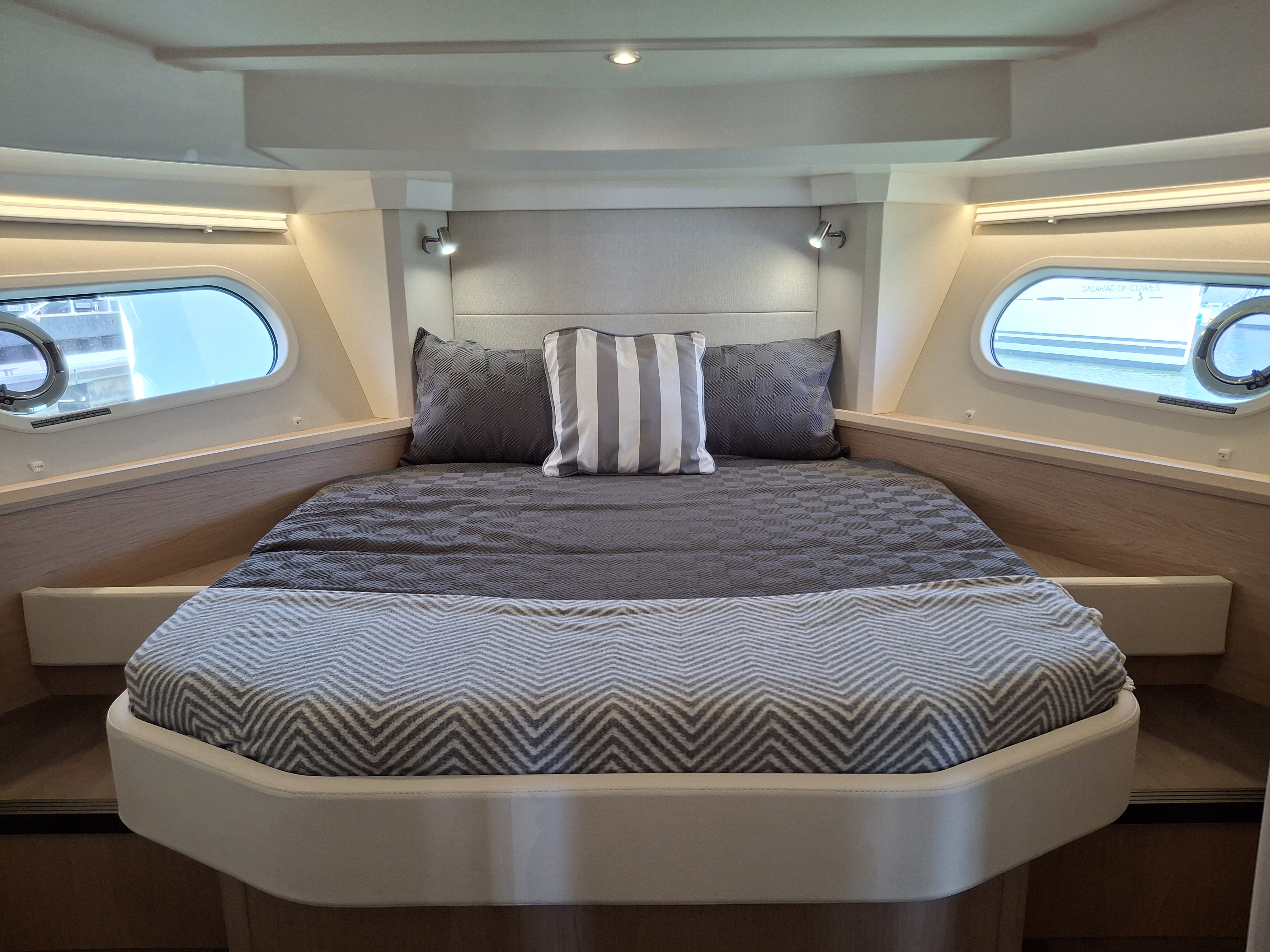 Superb owners cabin forward with island double berth and padded headboard, with storage underneath and stowage on both sides of berth, hanging wardrobe with lighting, cupboard with shelves, opening hatch with mosquito screen and blind, two hull windows with opening portholes and venetian blinds.