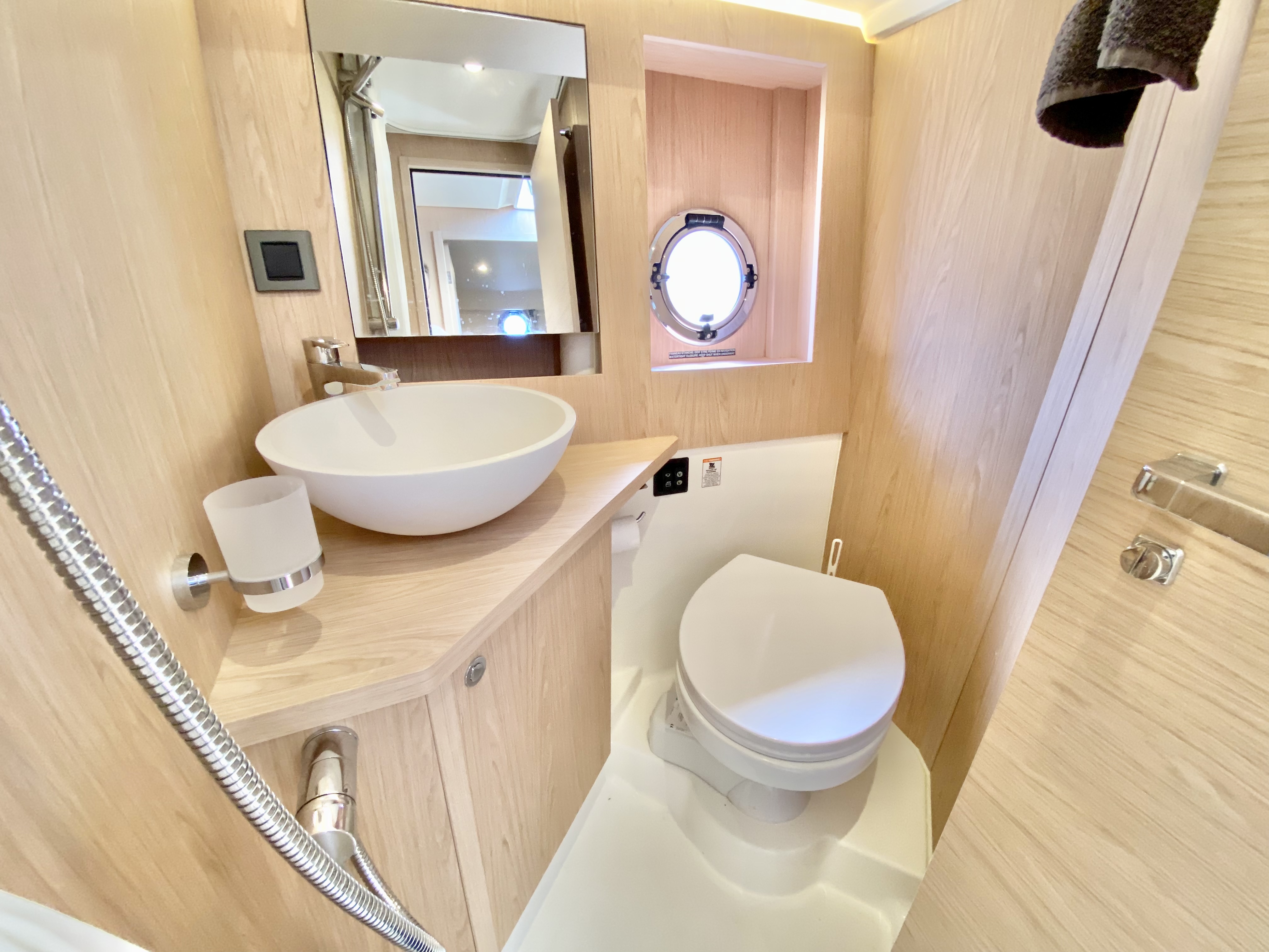 Mirror, top and bottom cupboard, opaque opening porthole, electric toilet flushing with fresh and salt water, oval washbasin with mixer tap, hot and cold shower, towel rail.