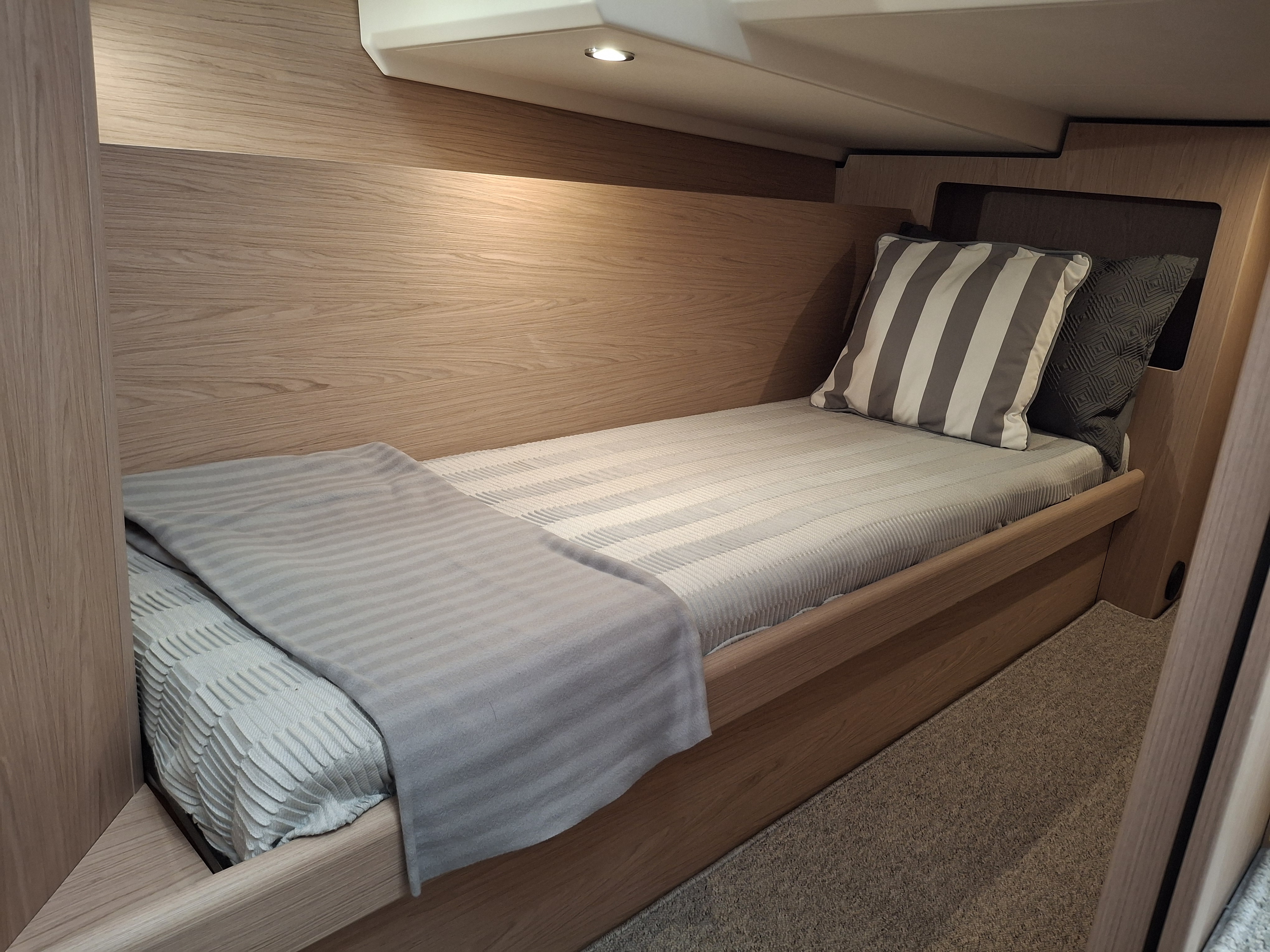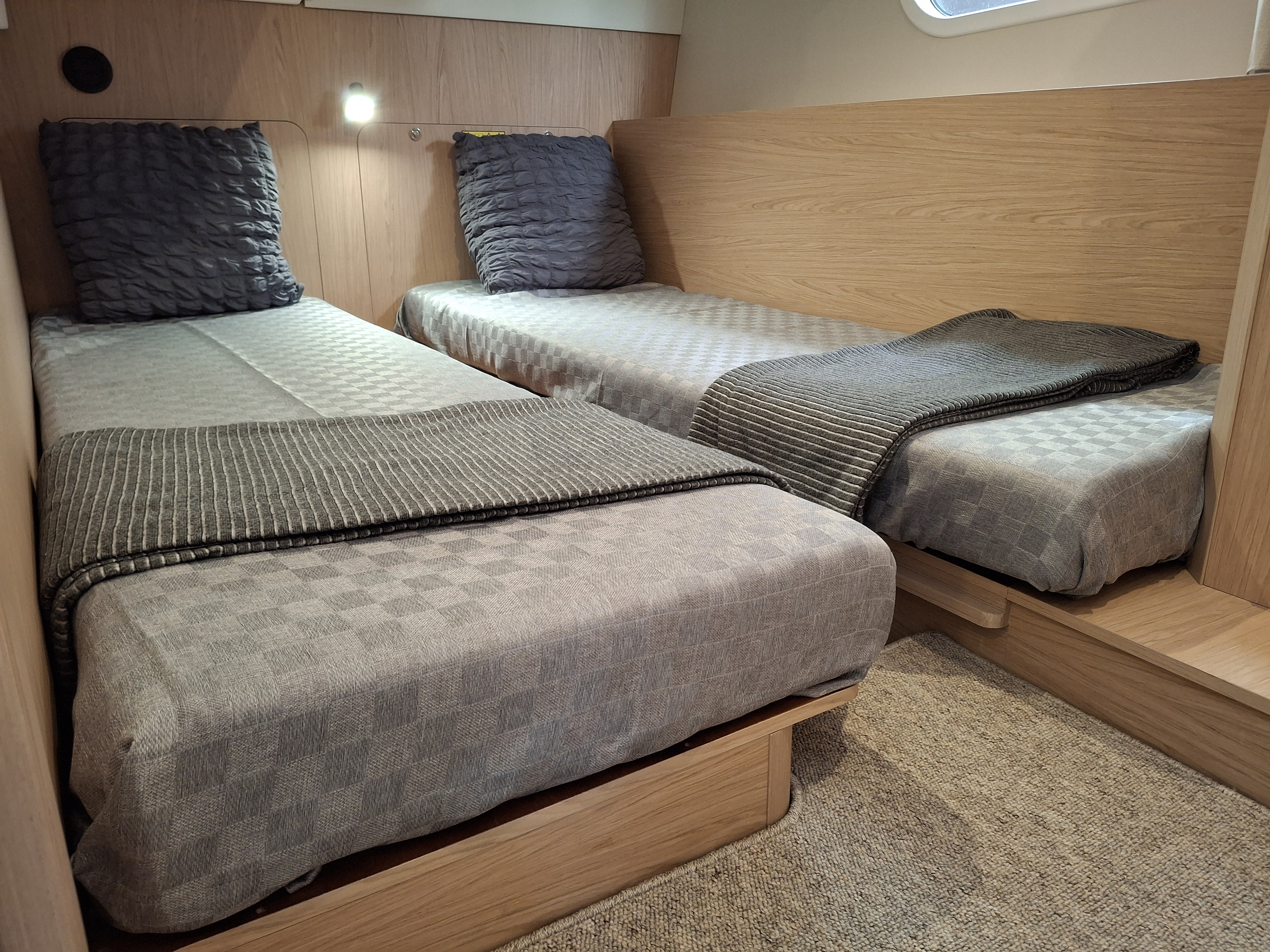Two single berths with an infill to convert into double berth and storage under berth, hanging wardrobe with shelve and opening porthole with curtain above, hull window with opening porthole, curtain and shelve below.