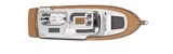 Central wheel steering console with grey tinted windscreen, control panel with engine controls, electric windlass, thrusters and trim tabs