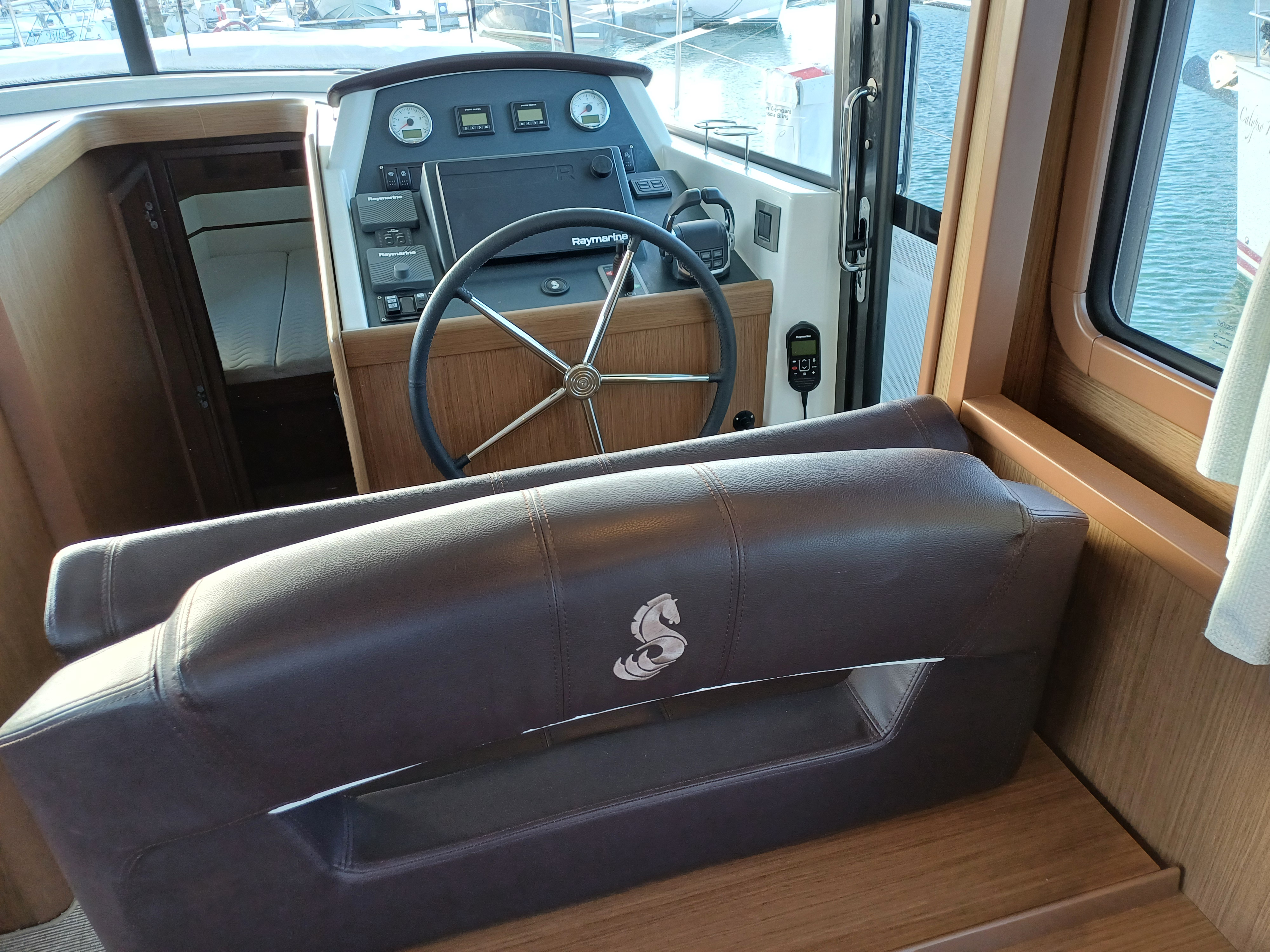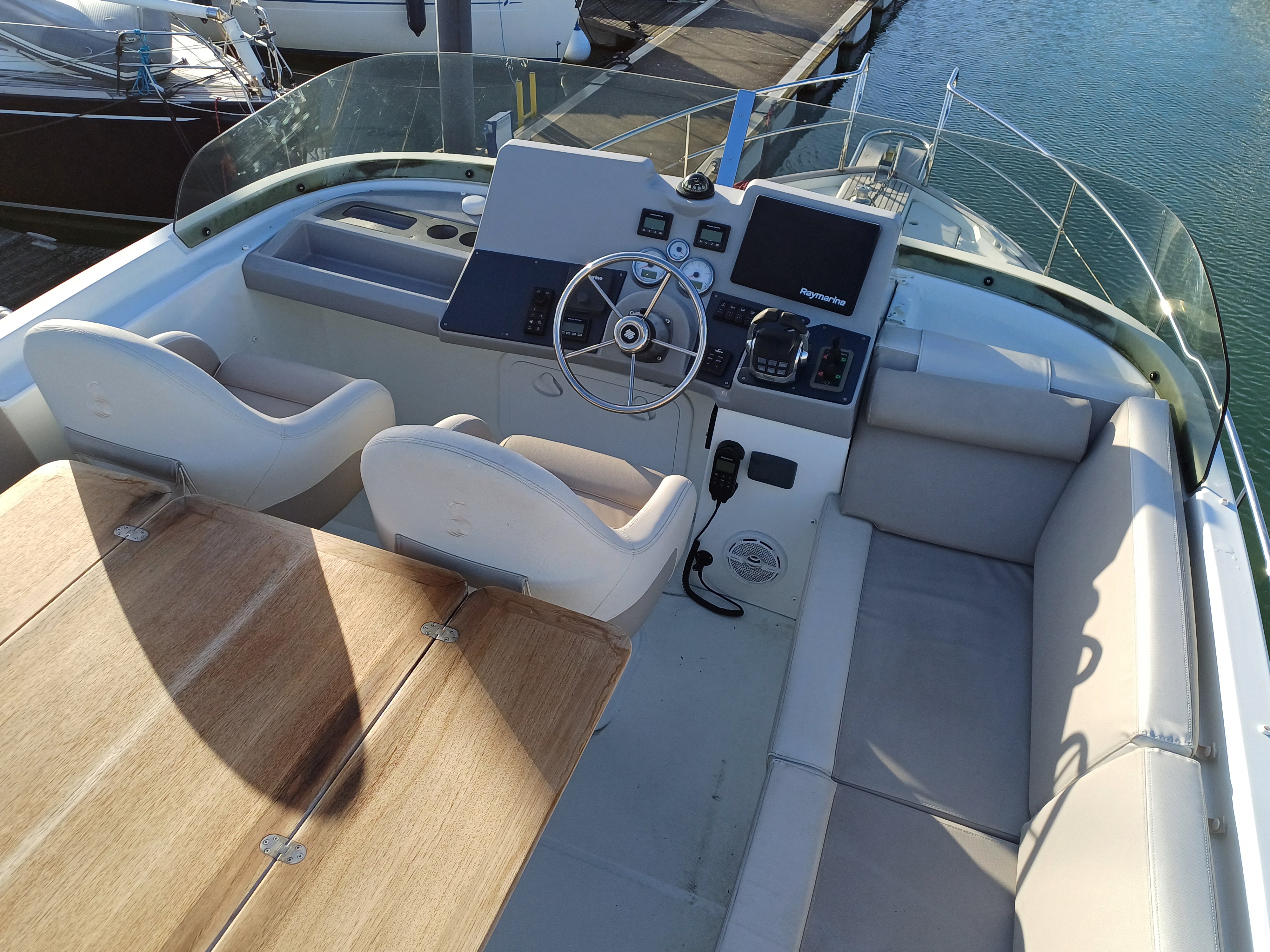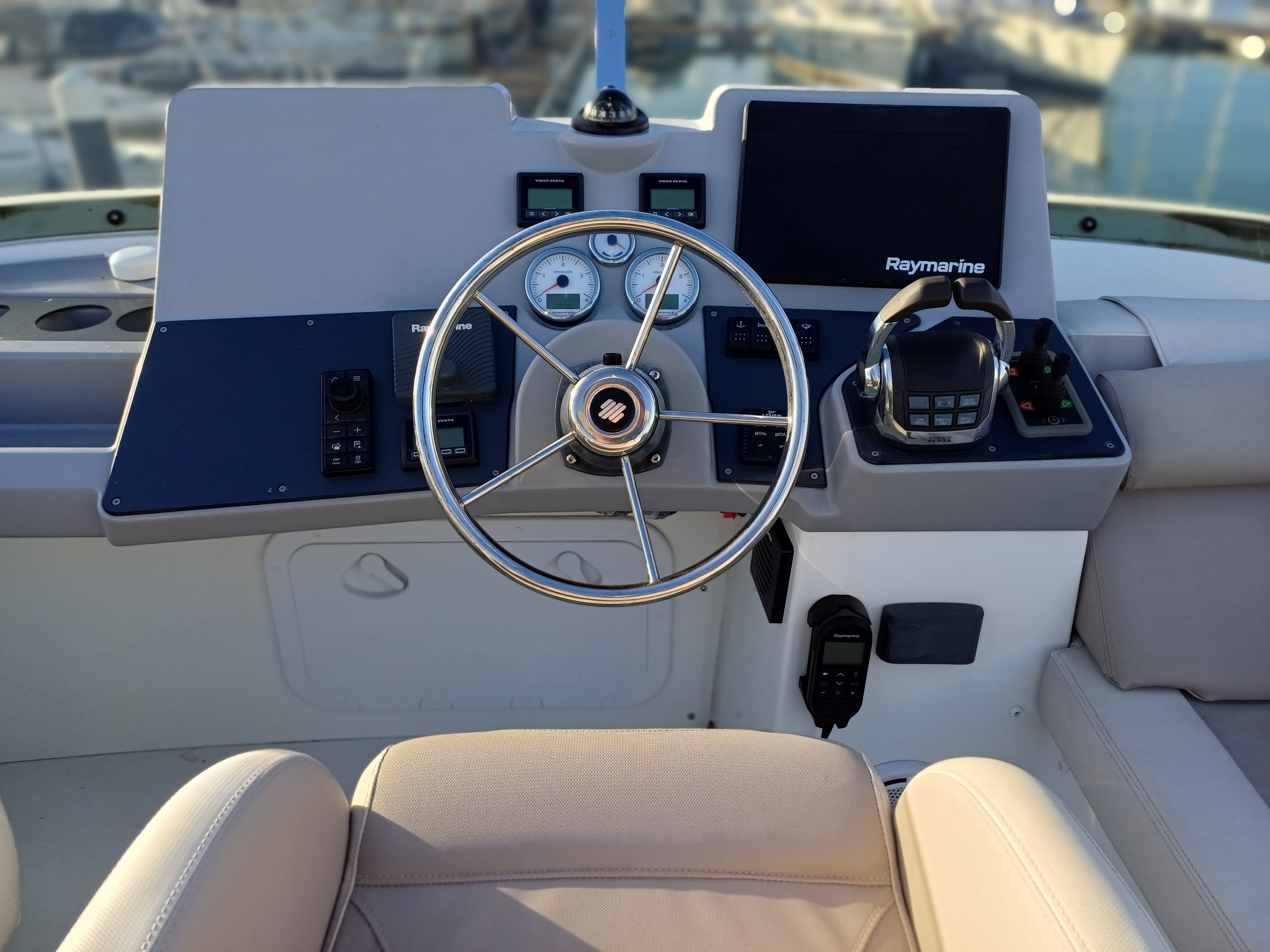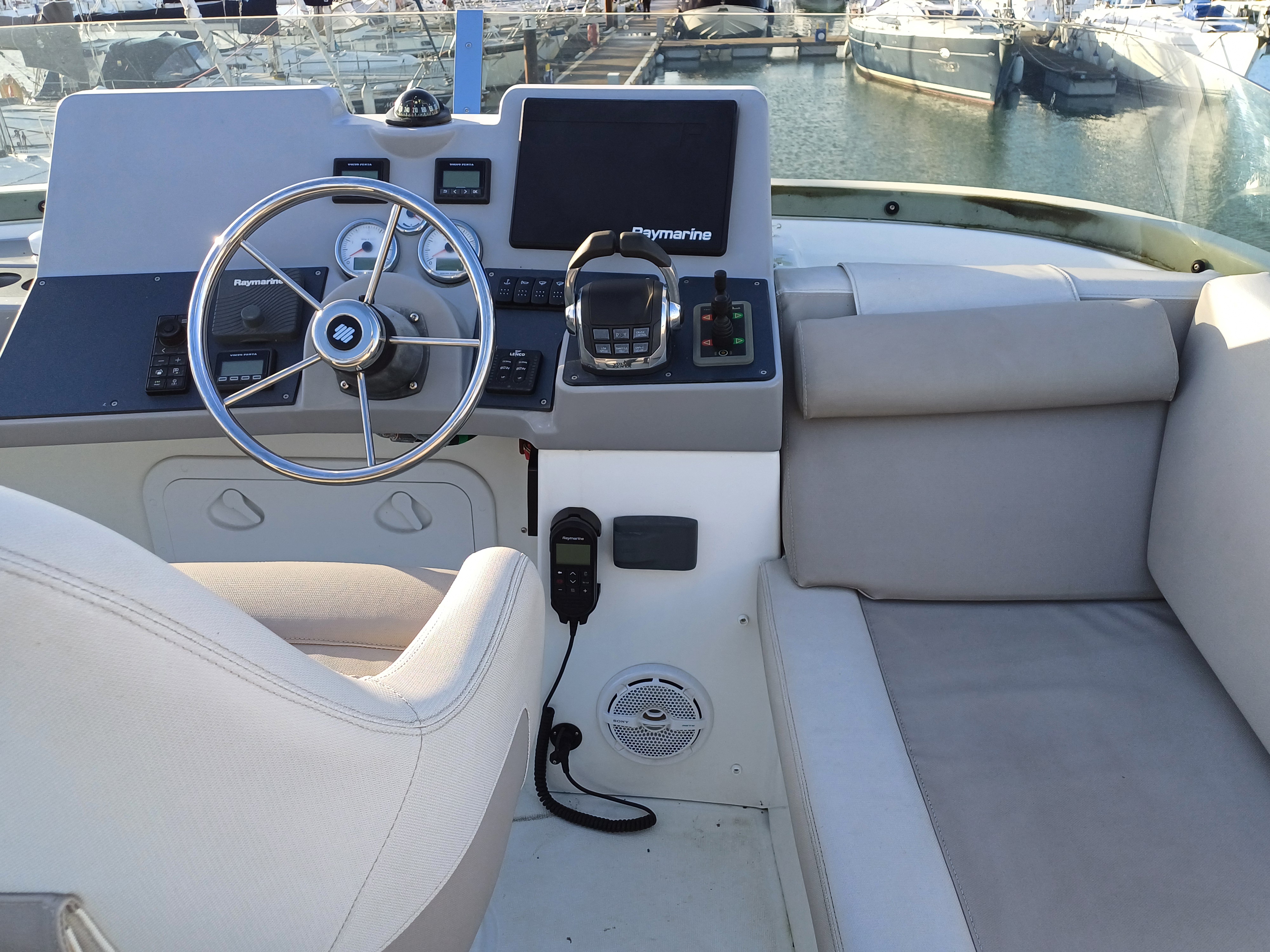 Central wheel steering console with grey tinted windscreen, control panel with engine controls, electric windlass, thrusters and trim tabs