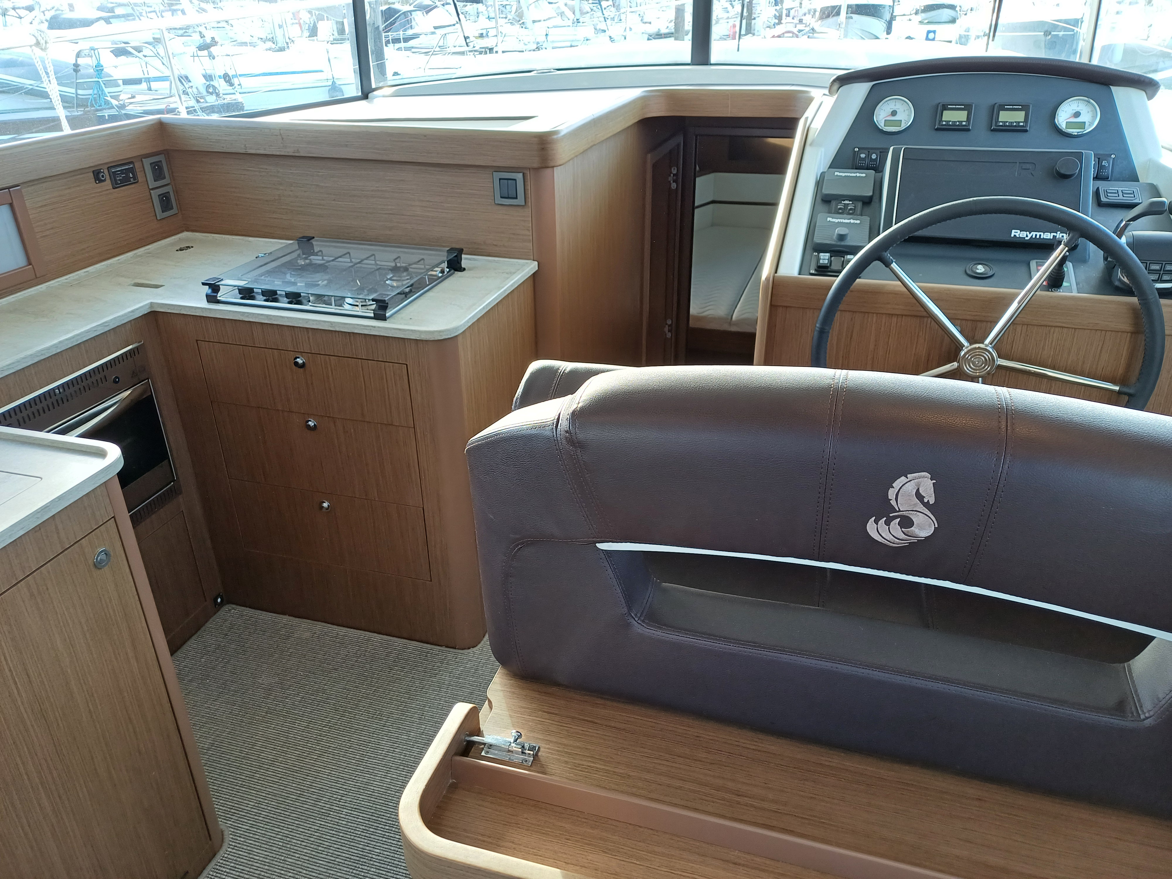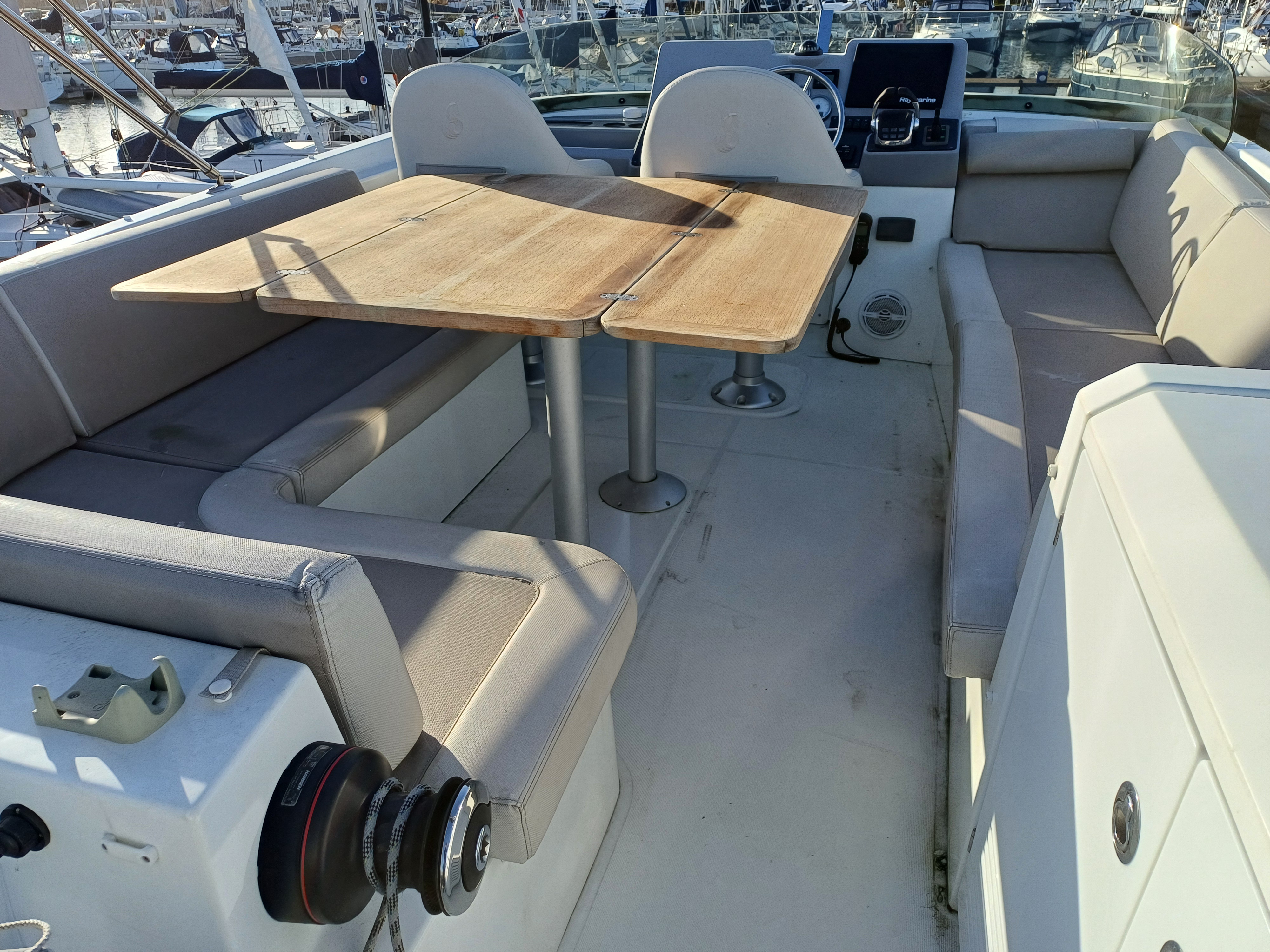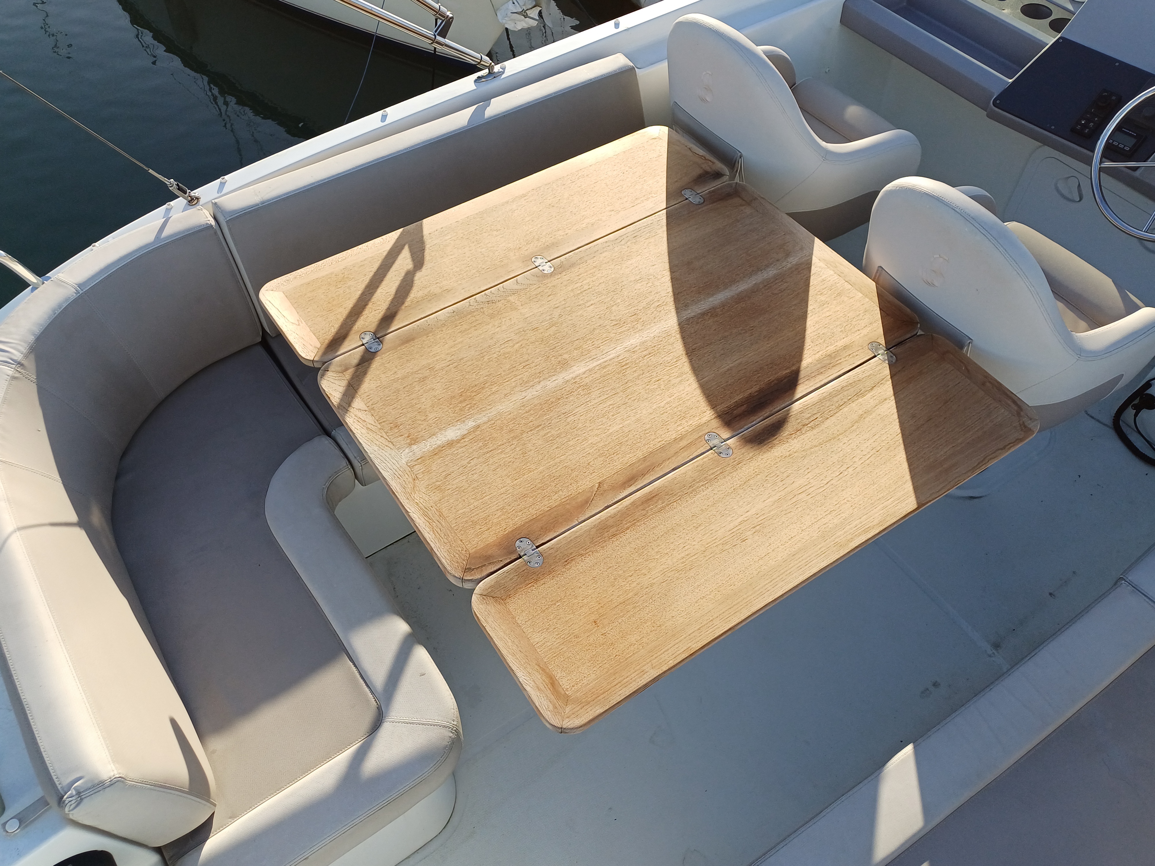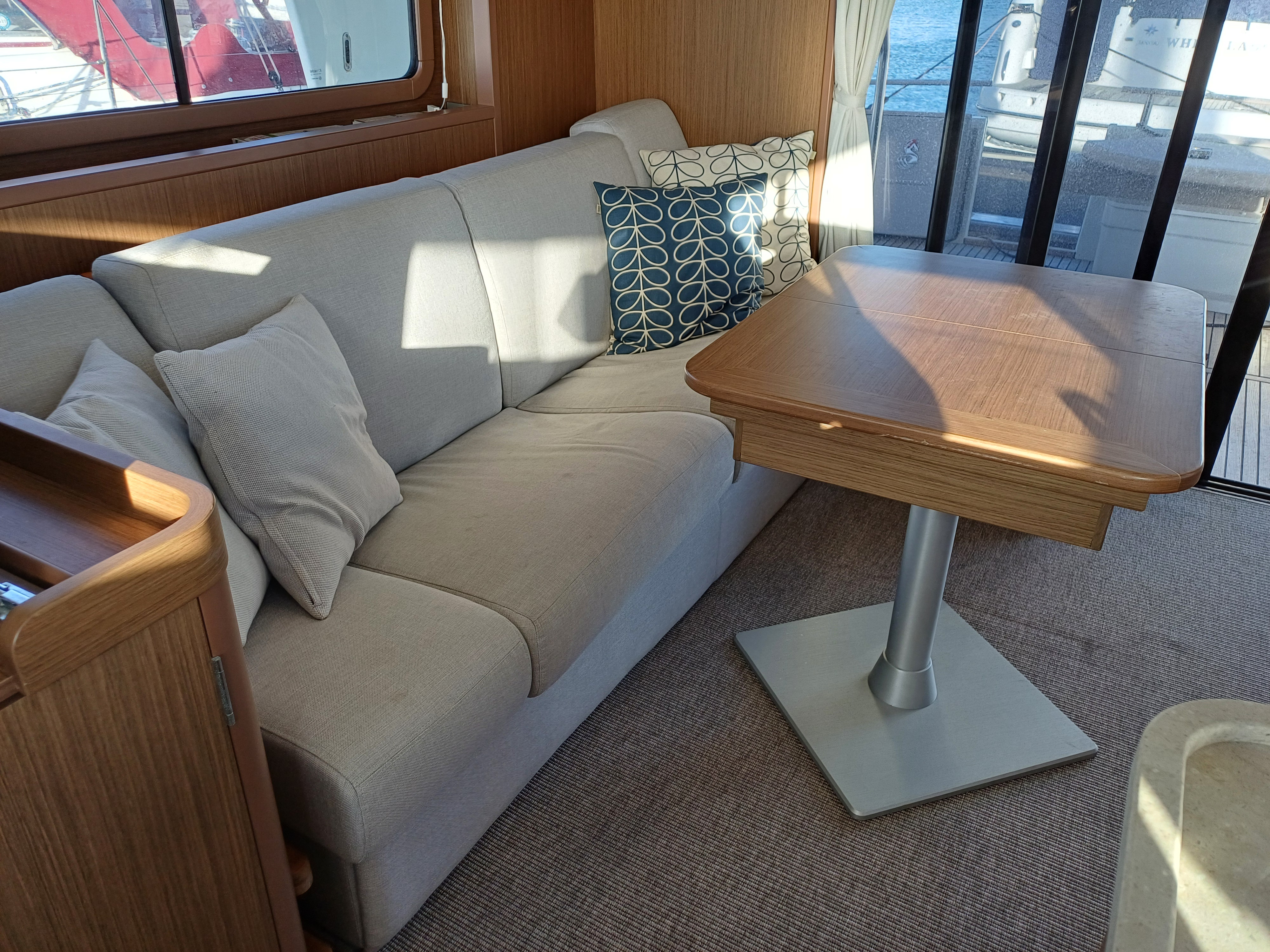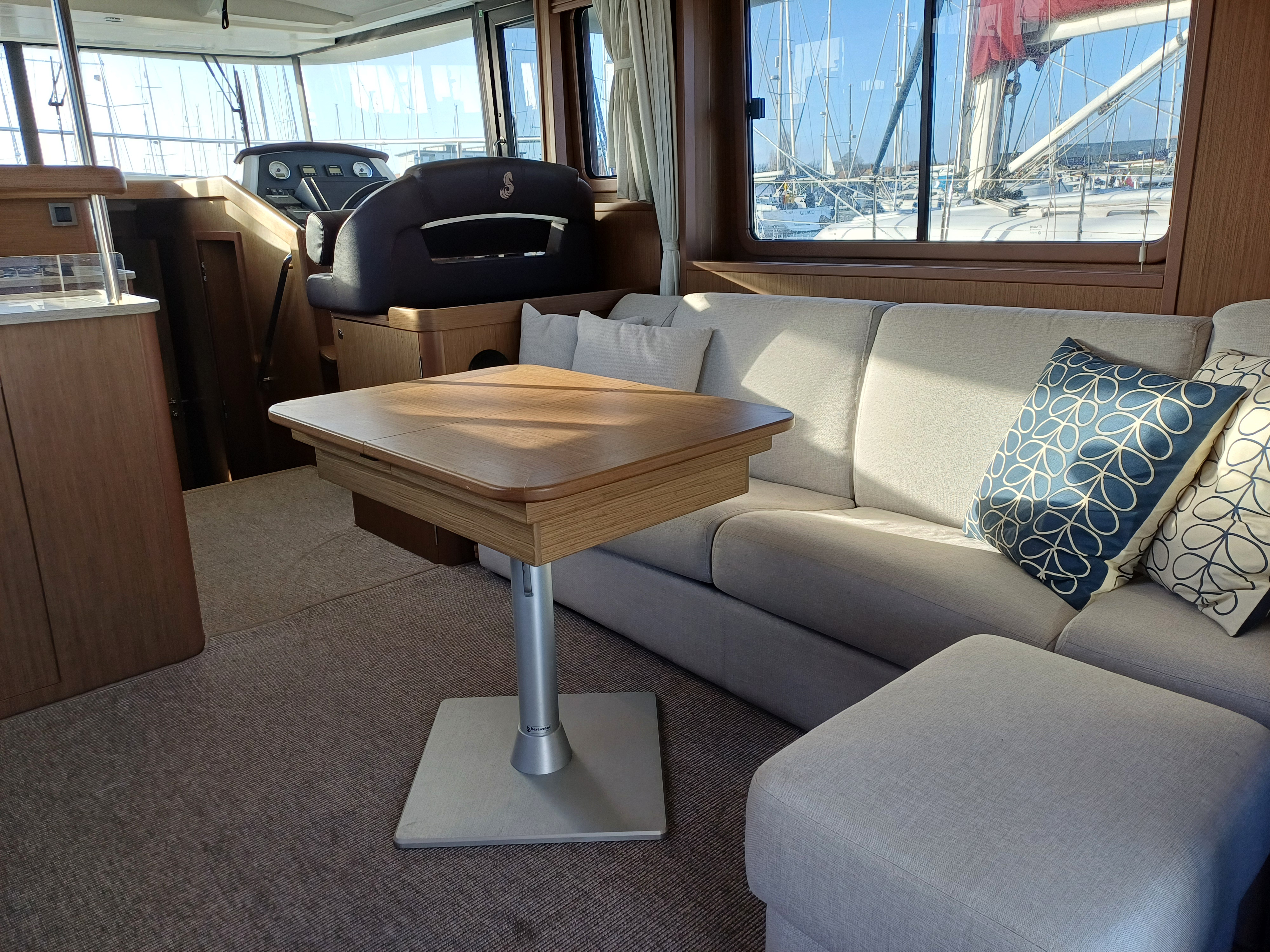 L-shaped bench seating to port aft of pilot seats with integral lockers and large folding teak table