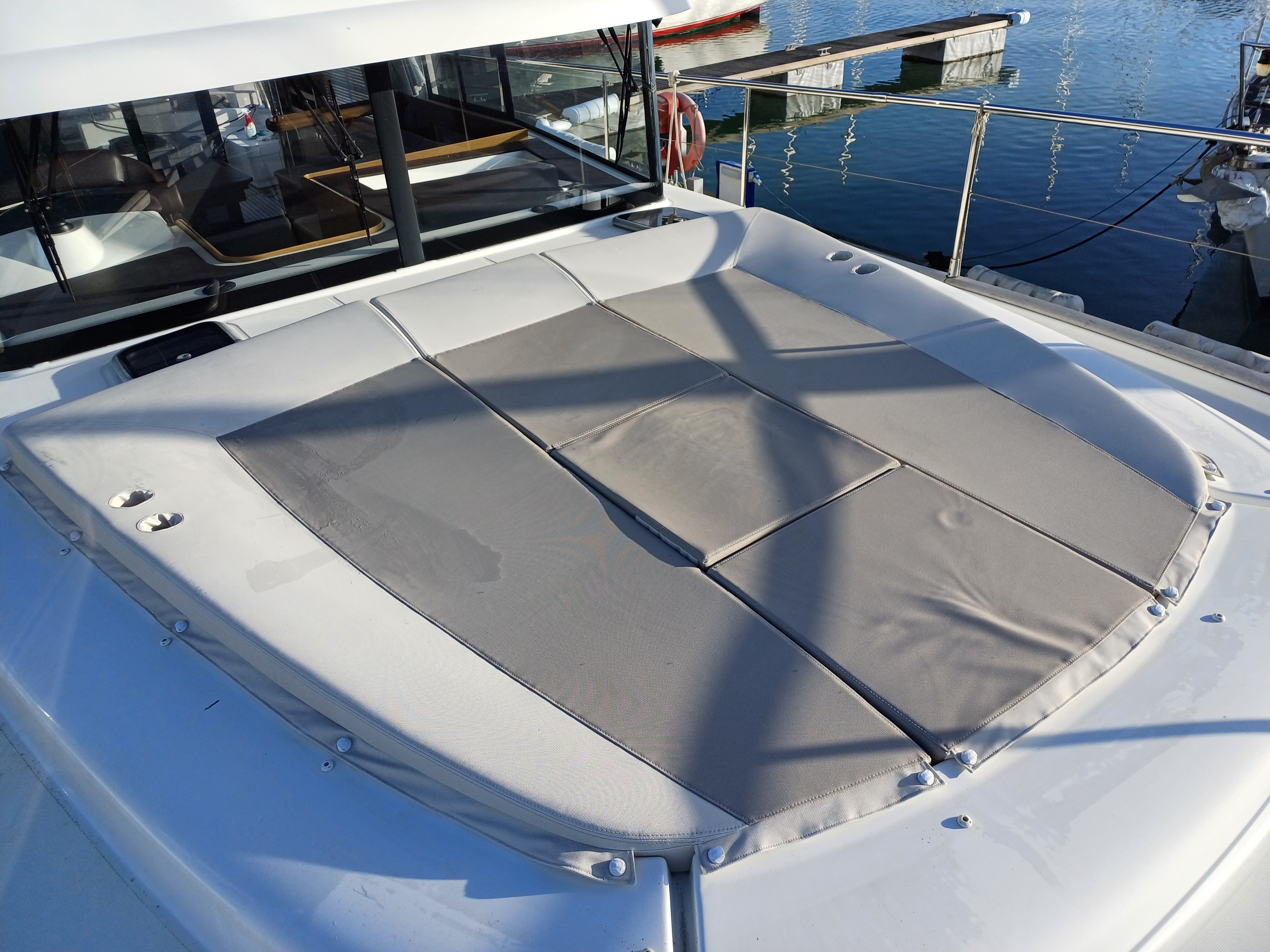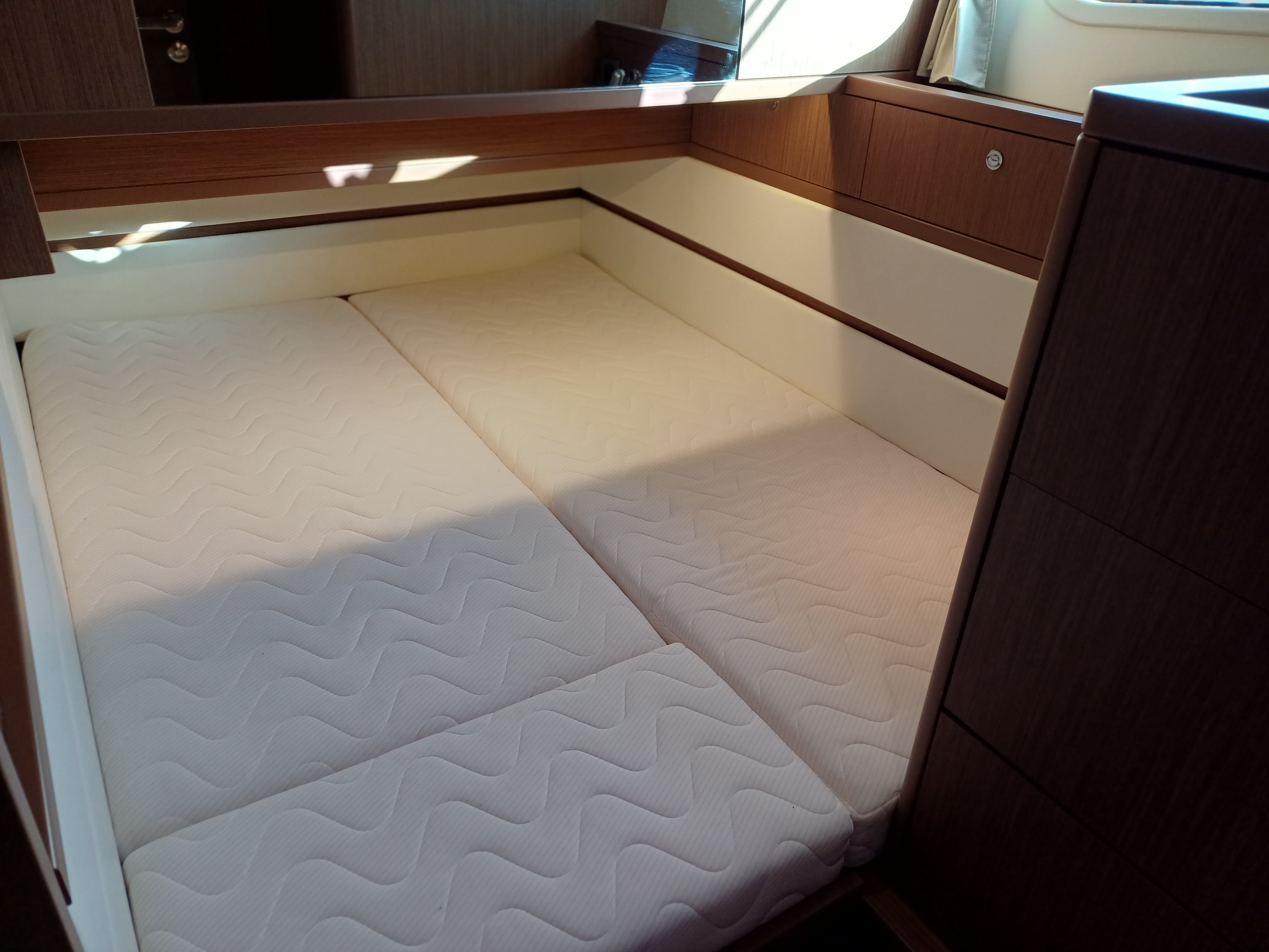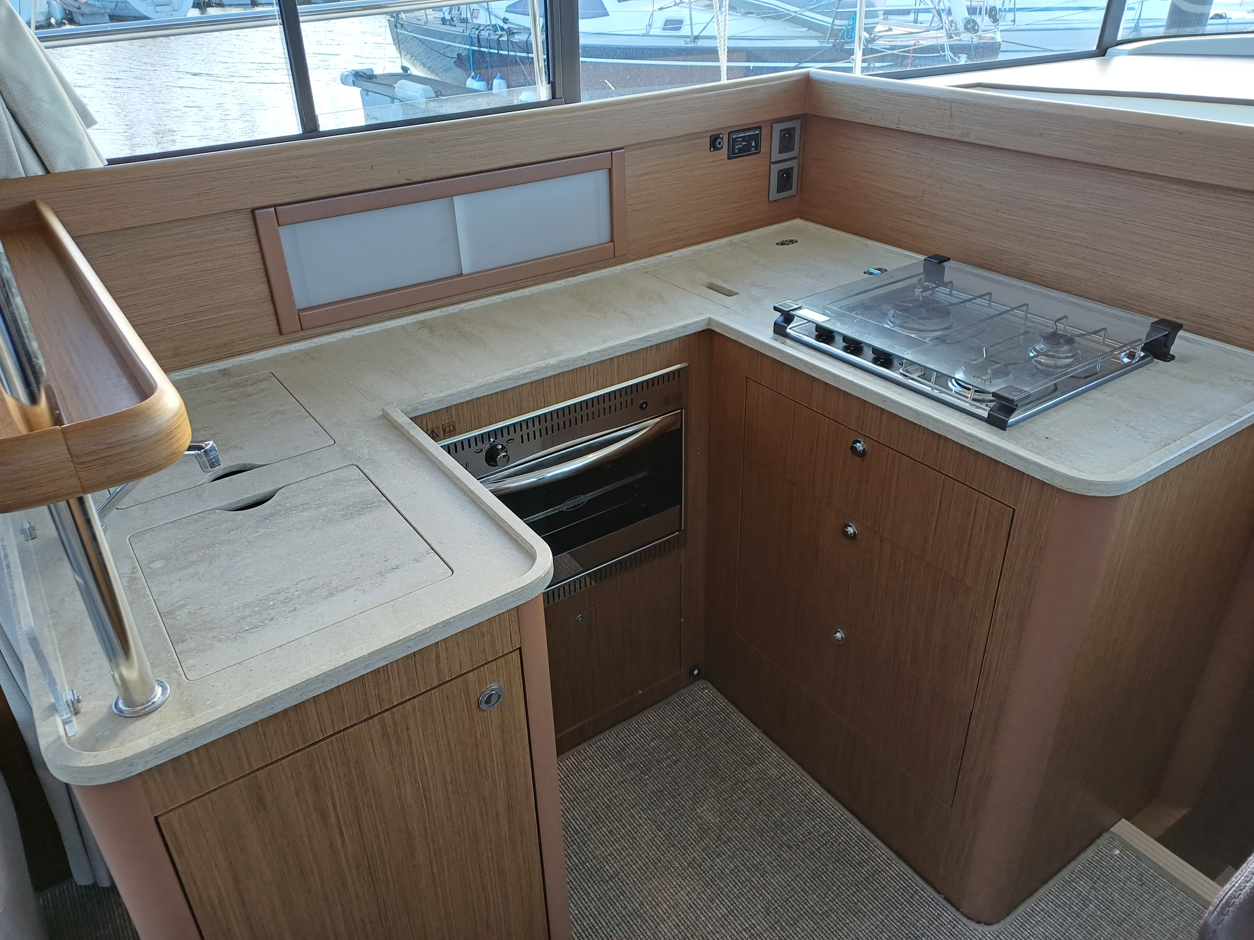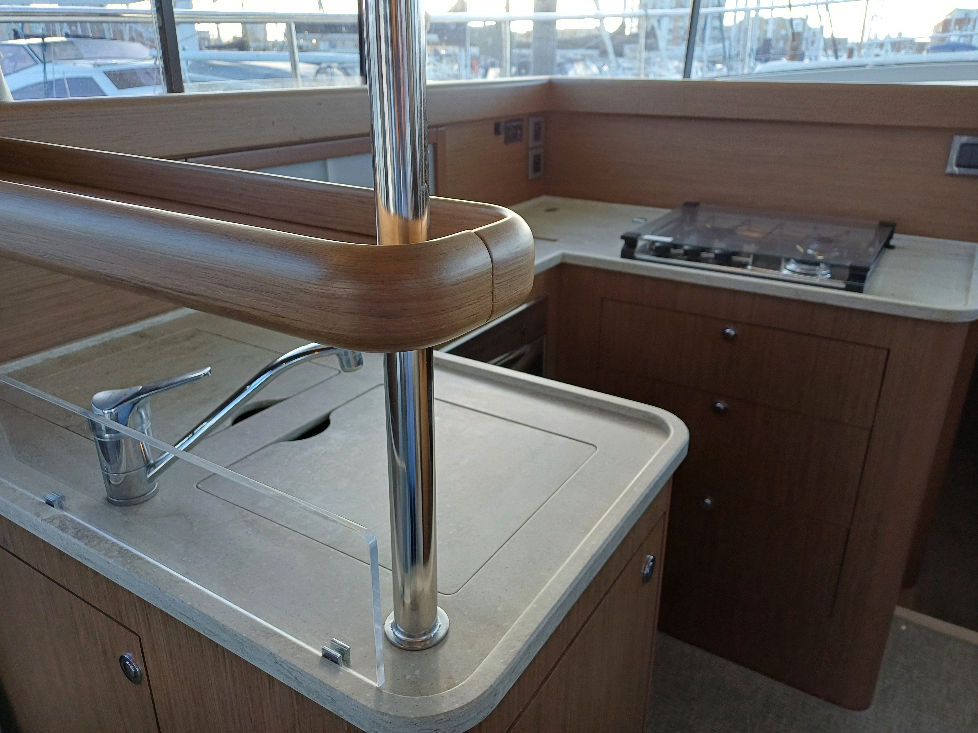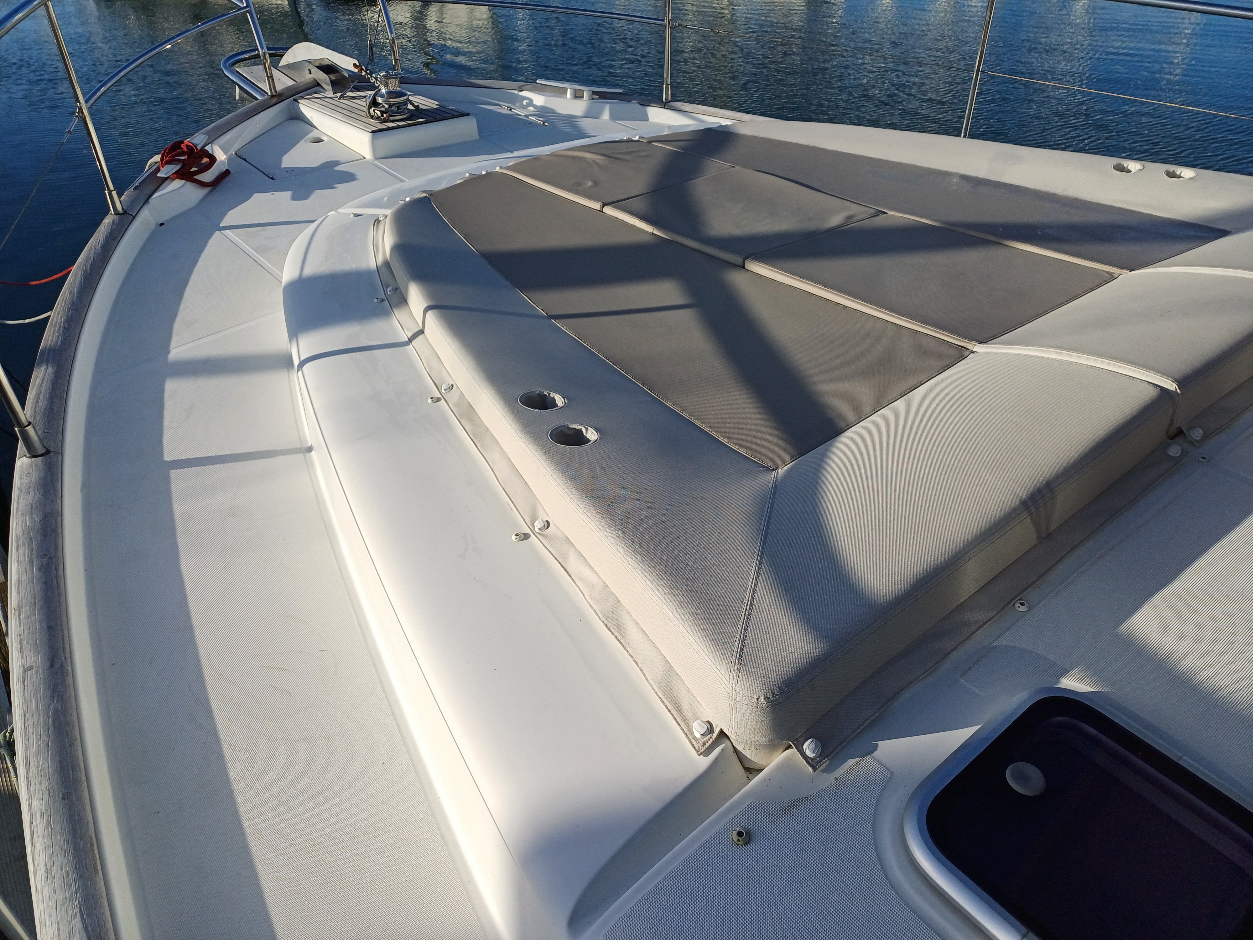 L-shaped bench seating to port aft of pilot seats with integral lockers and large folding teak table