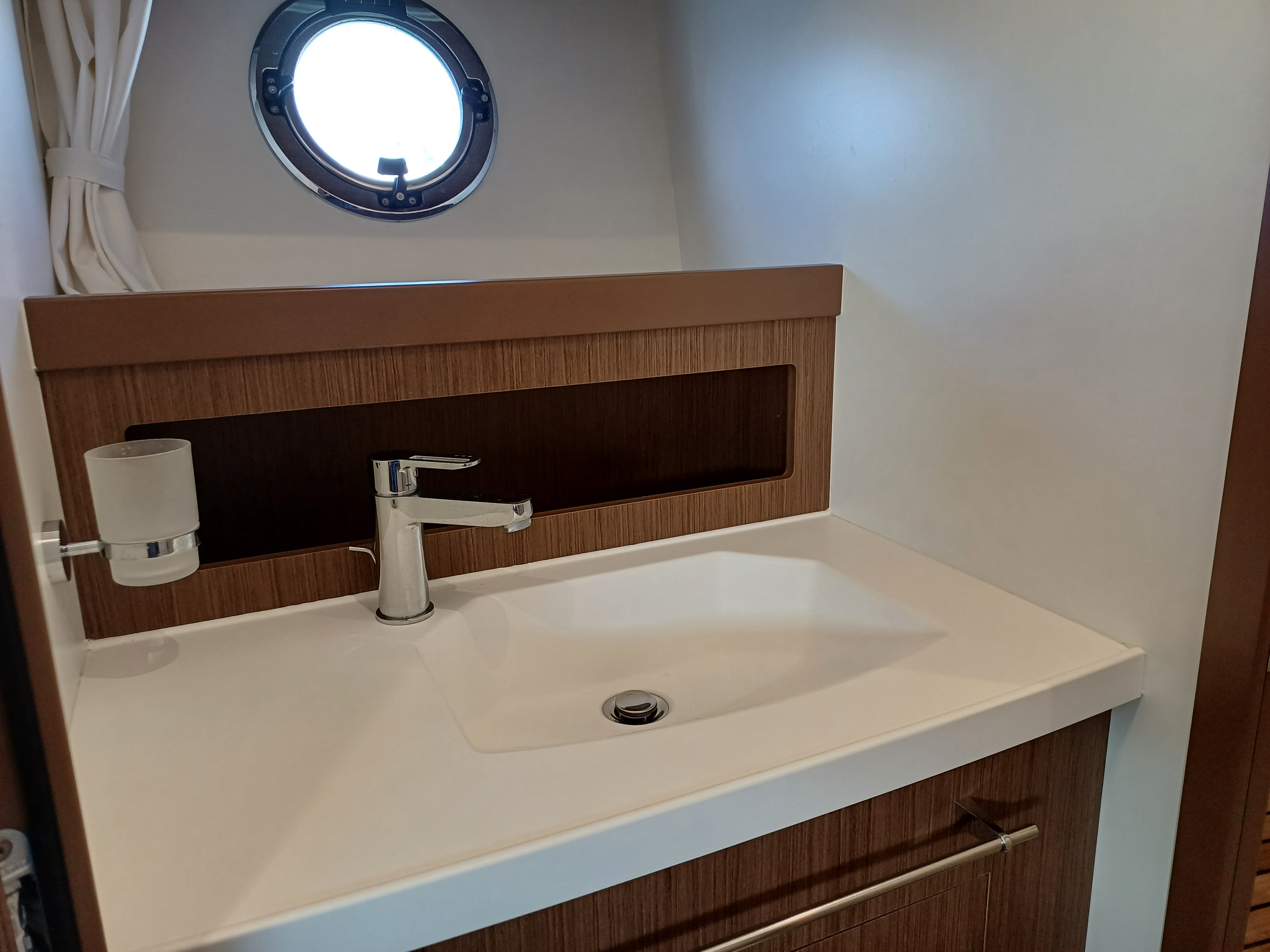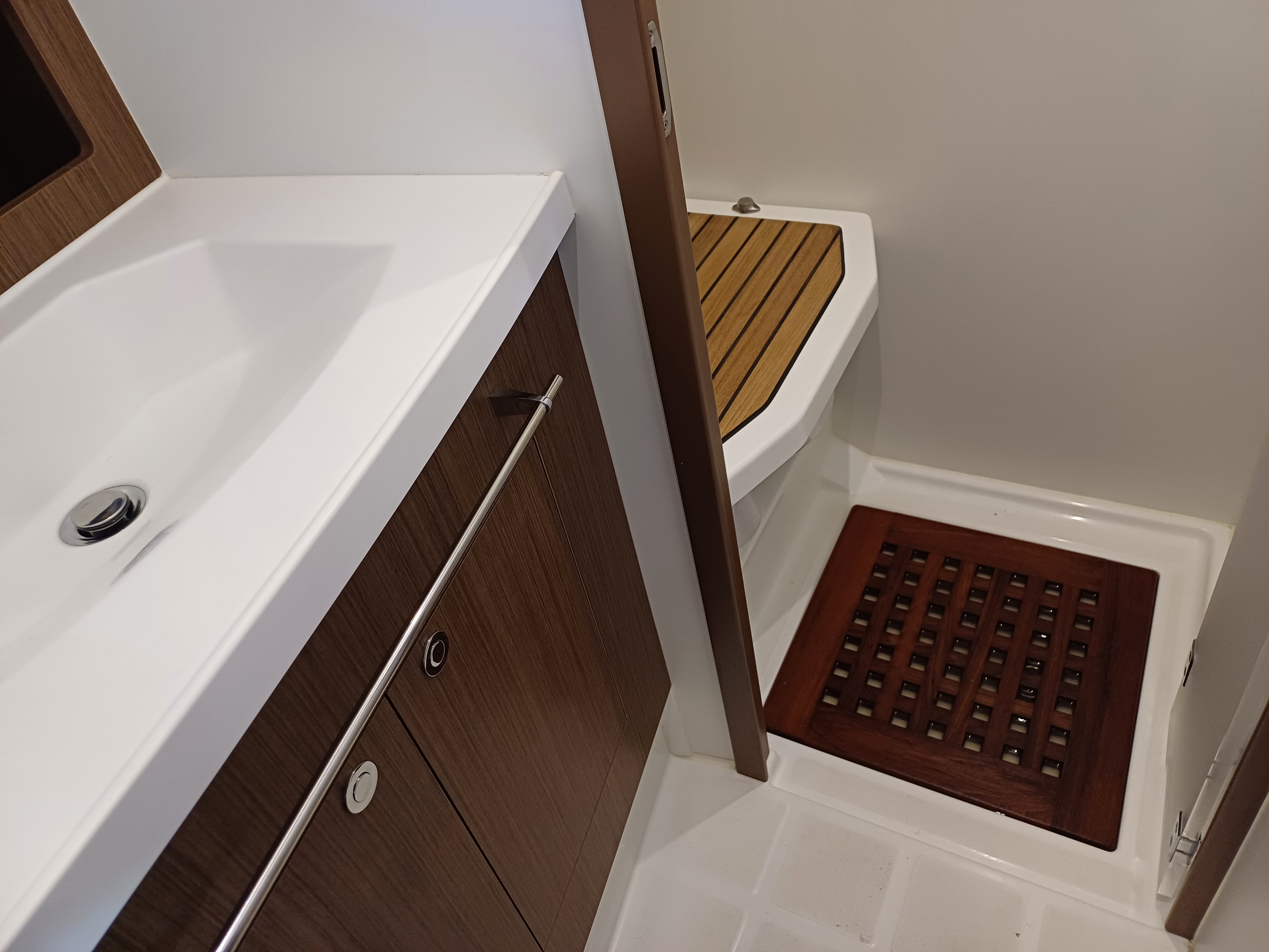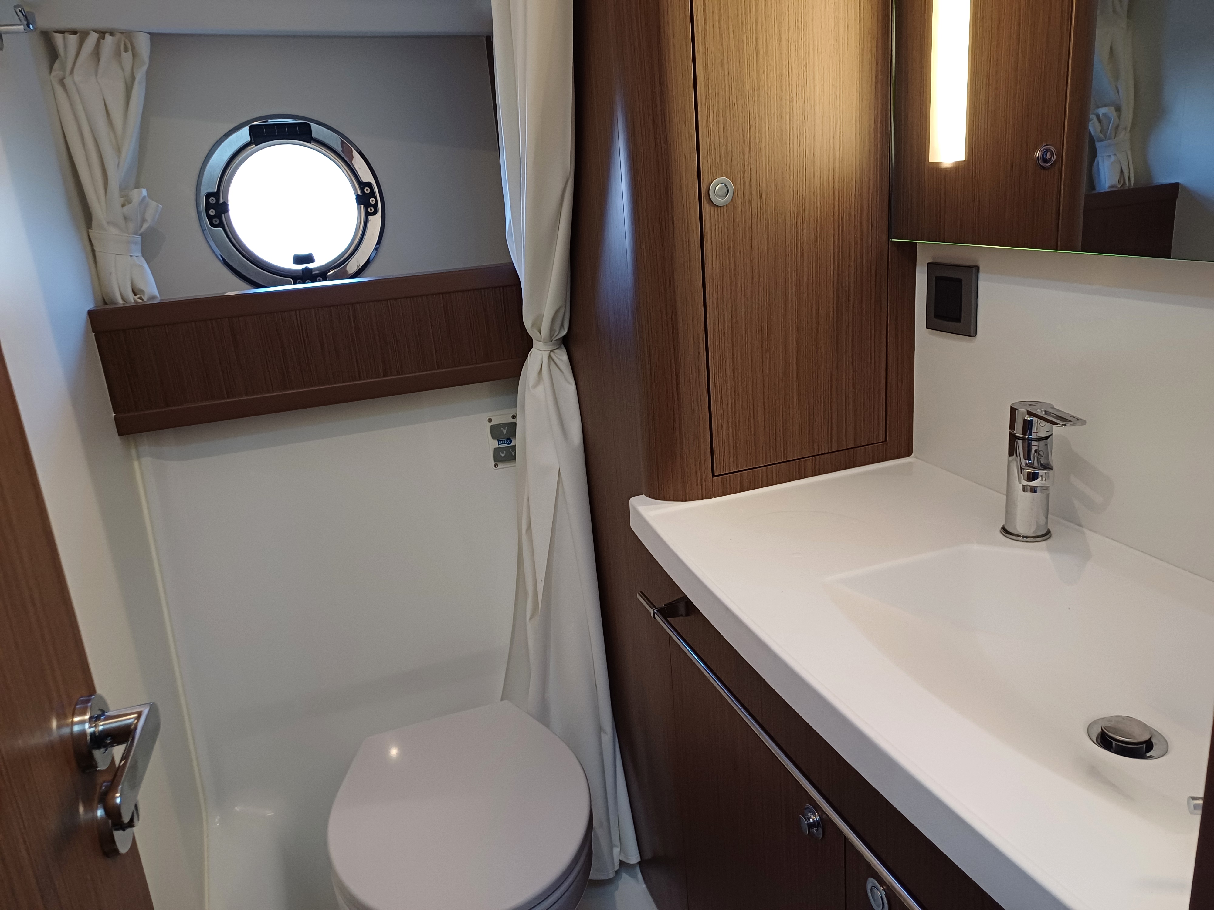 En-suite heads with basin, mirror and back lighting, cupboard and open stowage