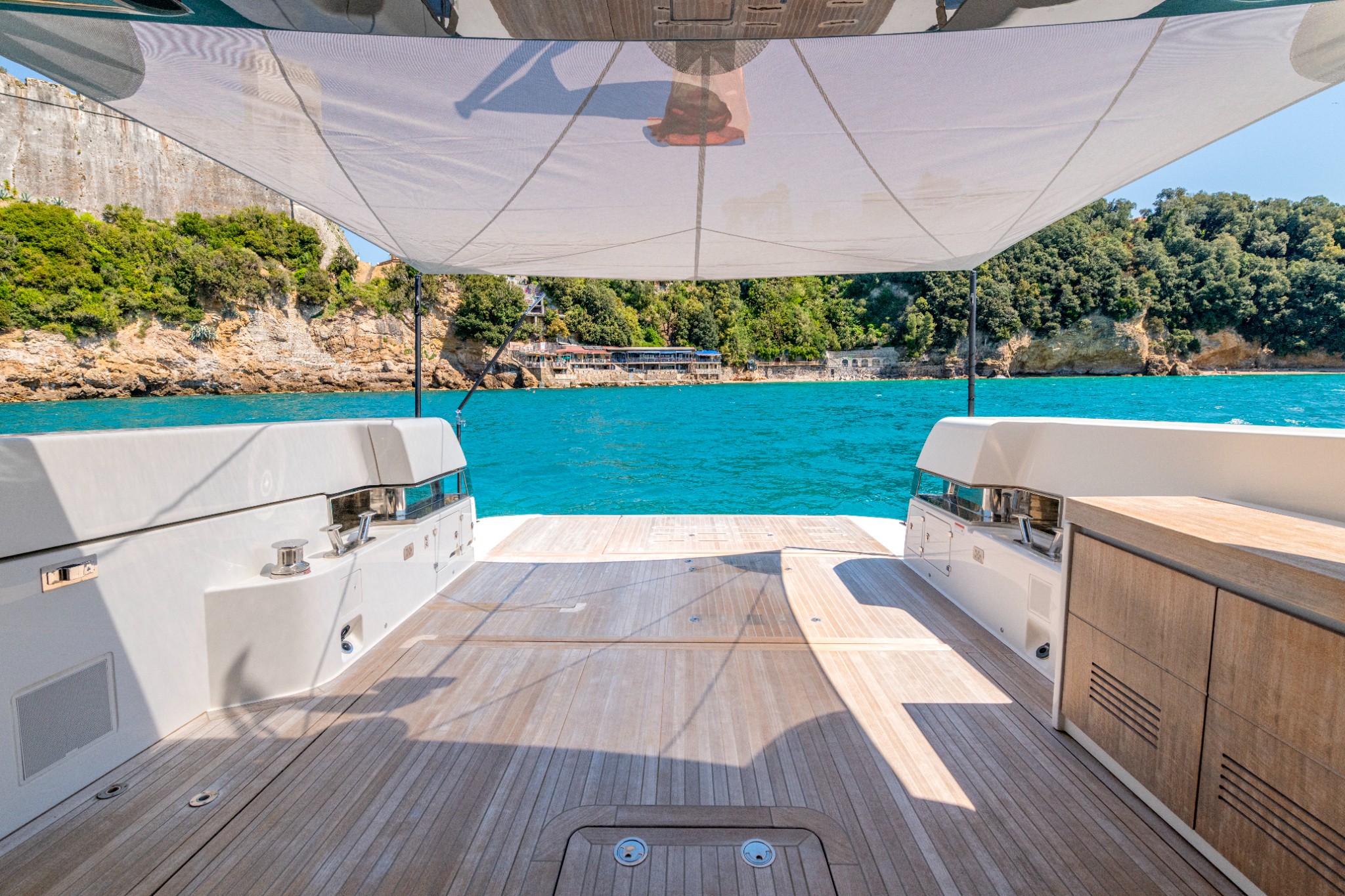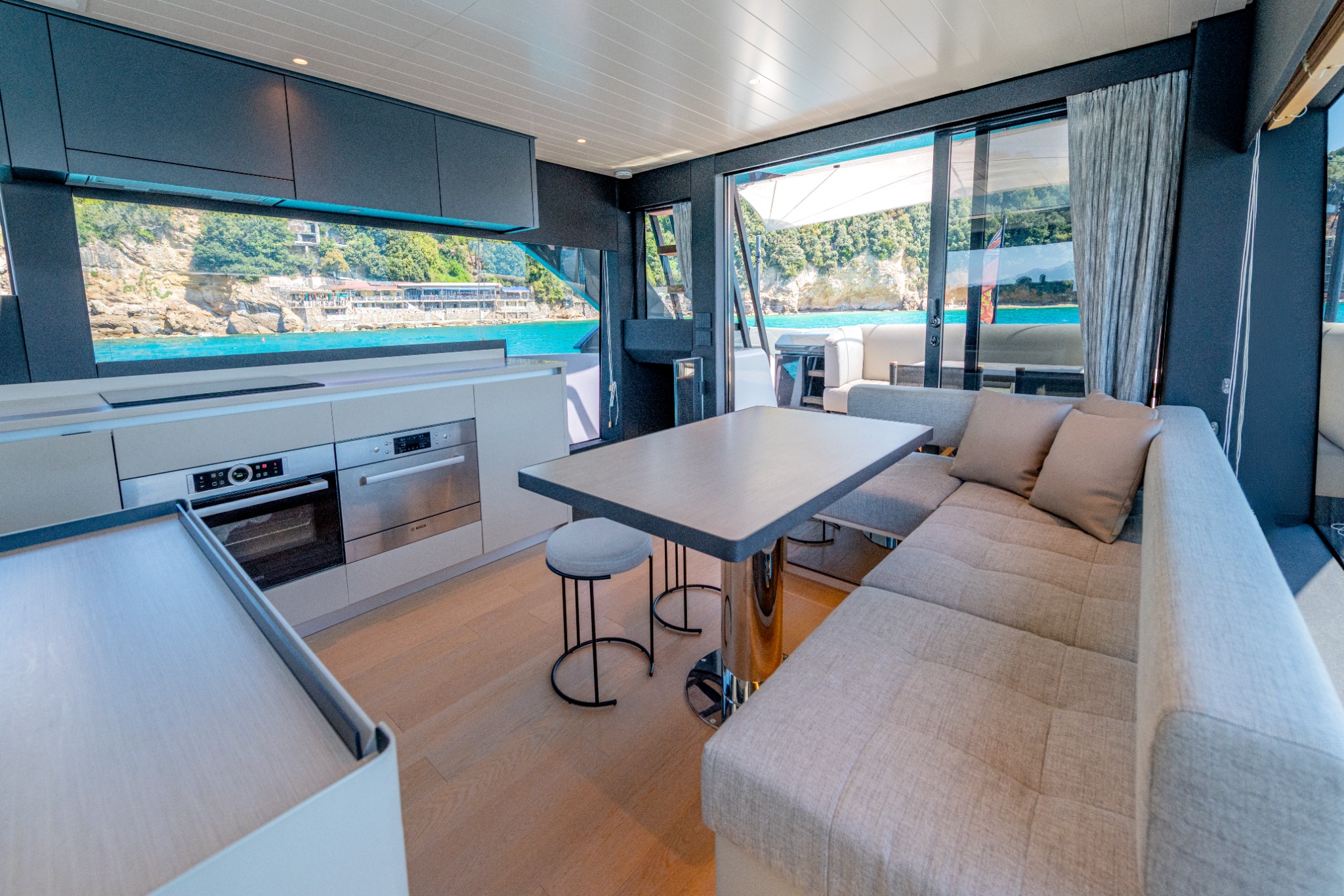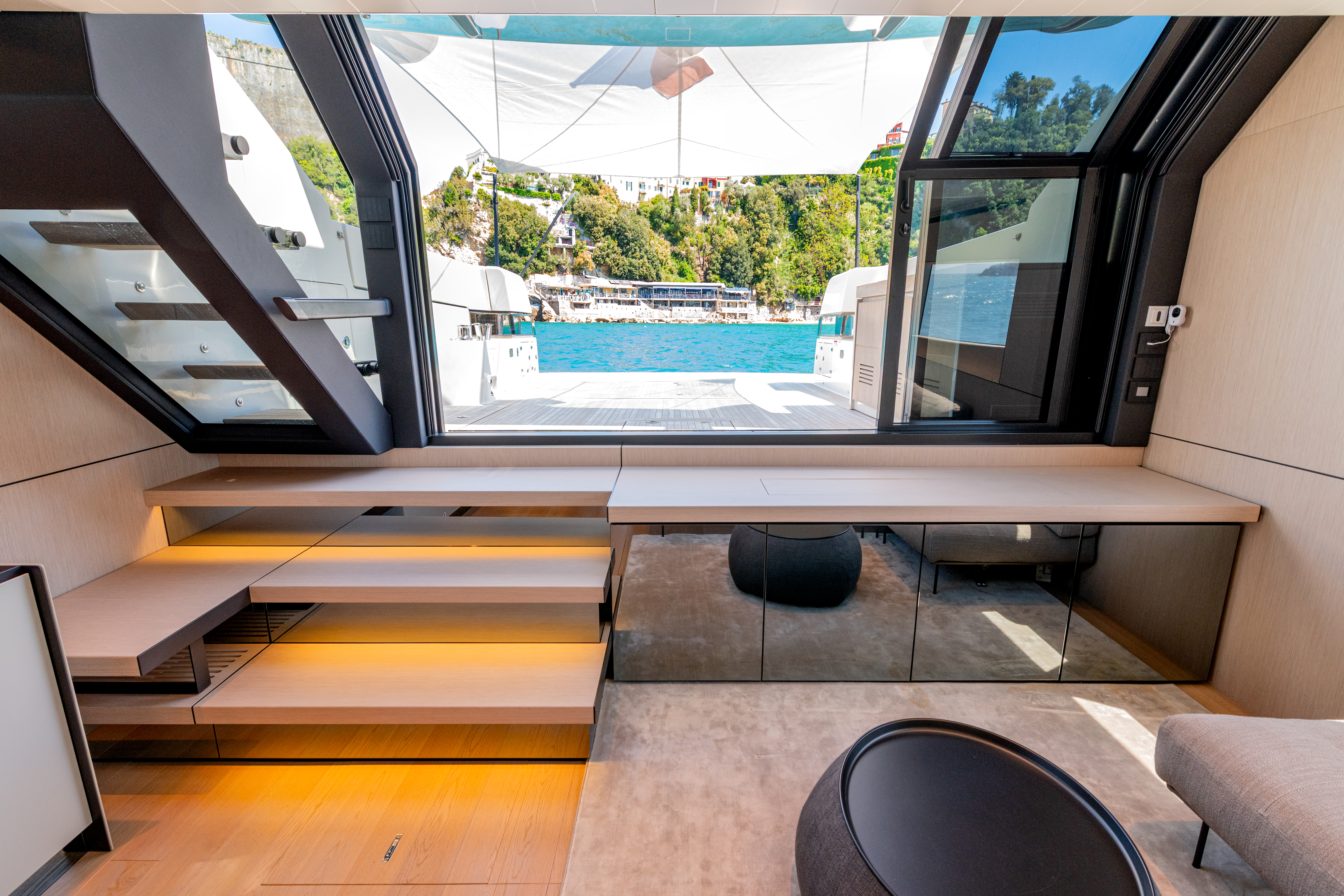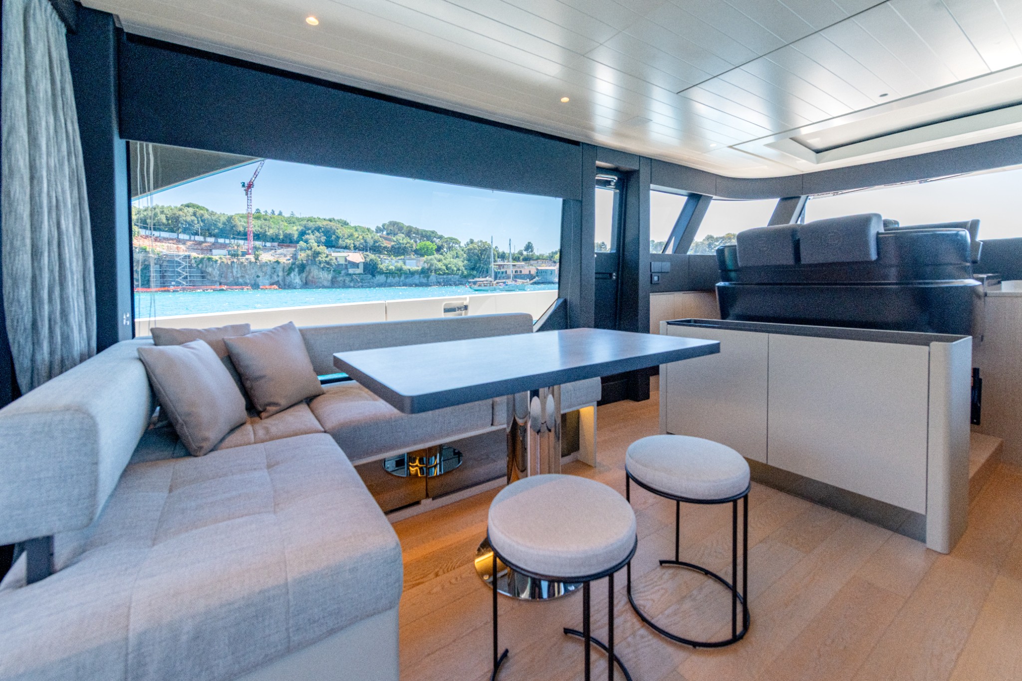 Large 3 stage sliding door to beach club area, electric blind, Living Divani L-shaped sofa, B&B FATFAT coffee table, Coren rug, Oluce Atollo lamp, wooden venetian blinds, 50” Samsung Smart TV on electric hi/low, storage cabinet to starboard with fridge, storage hatch and access to technical space, stairs to deckhouse and owners cabin entrance