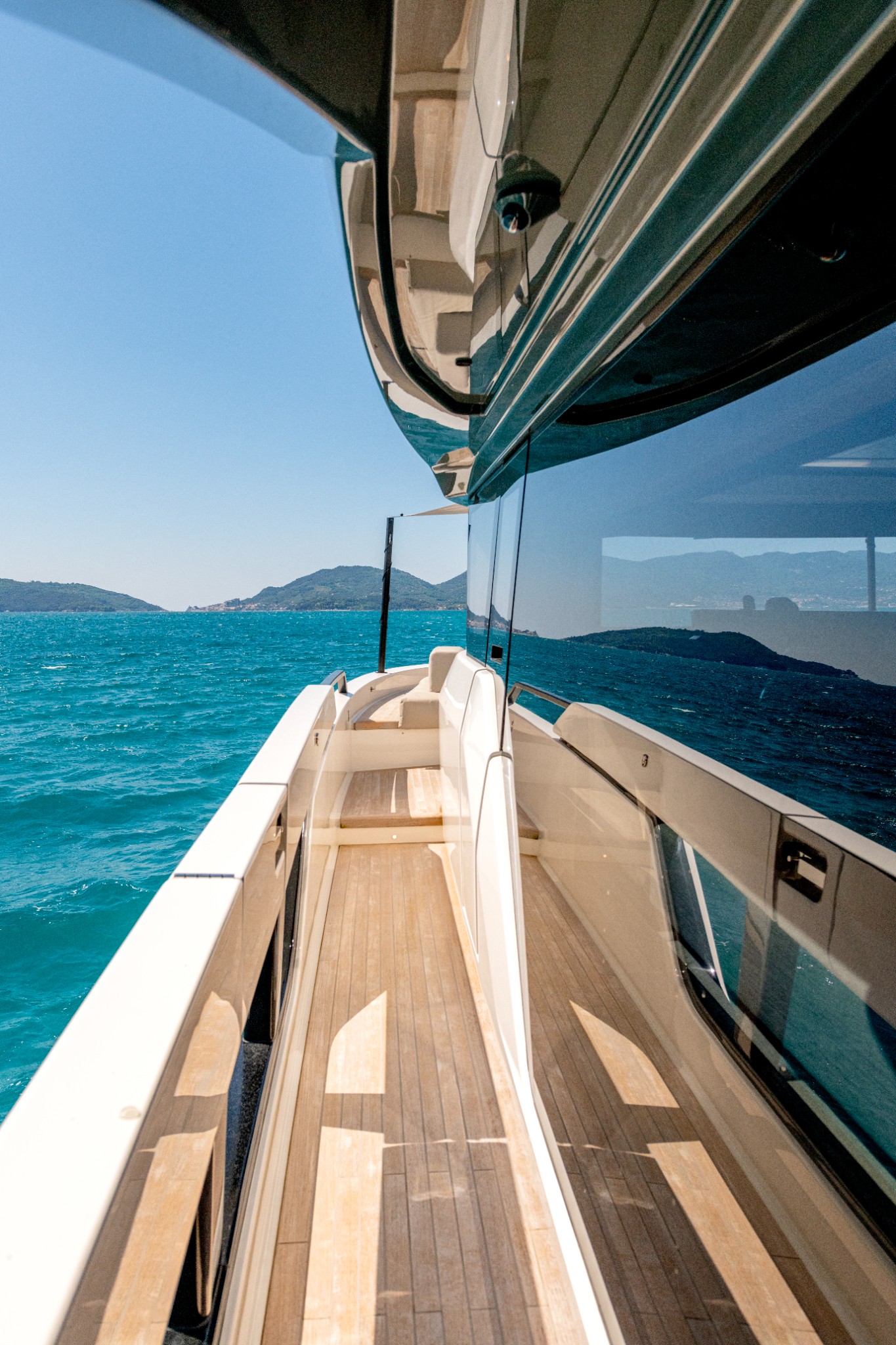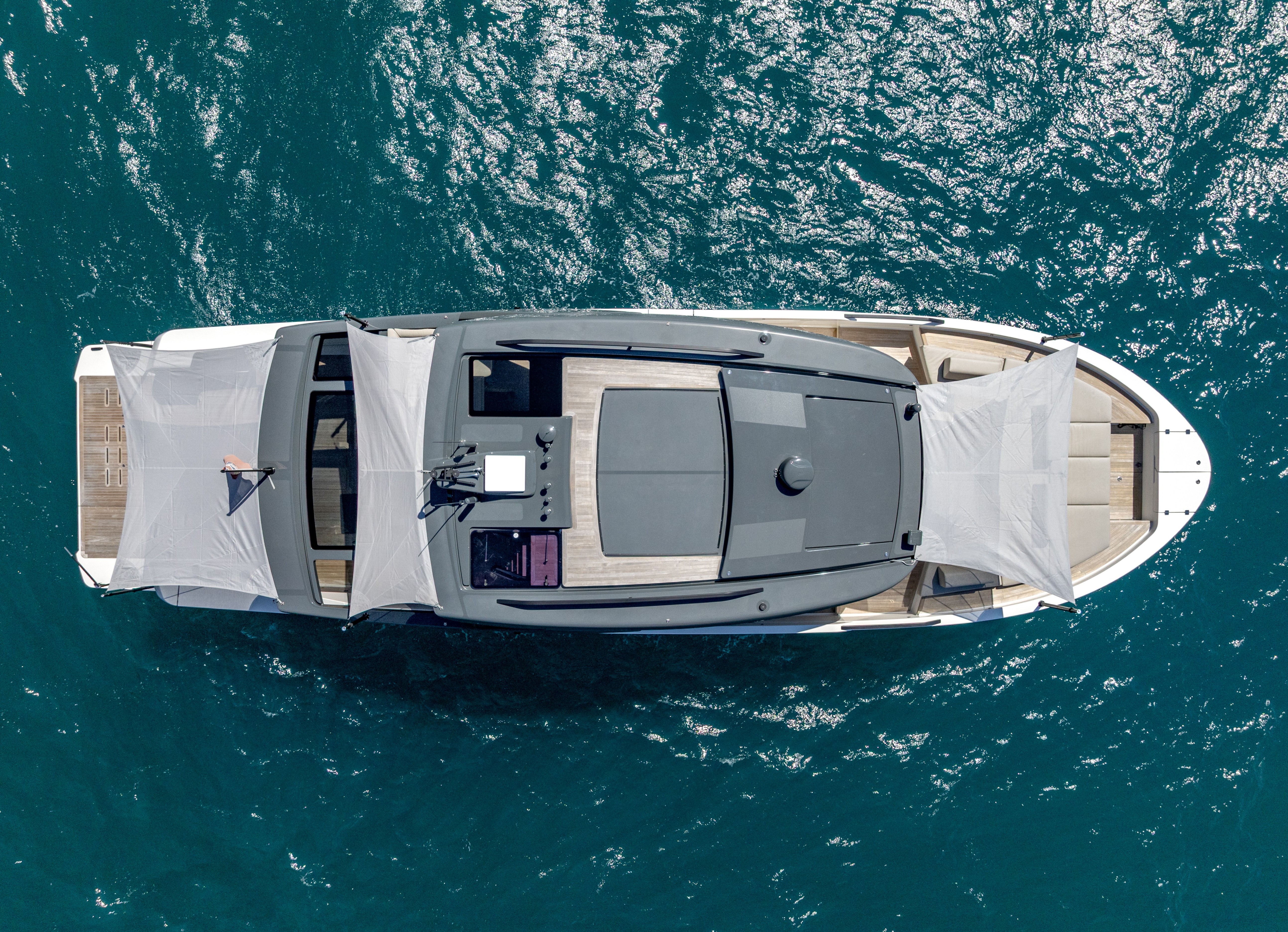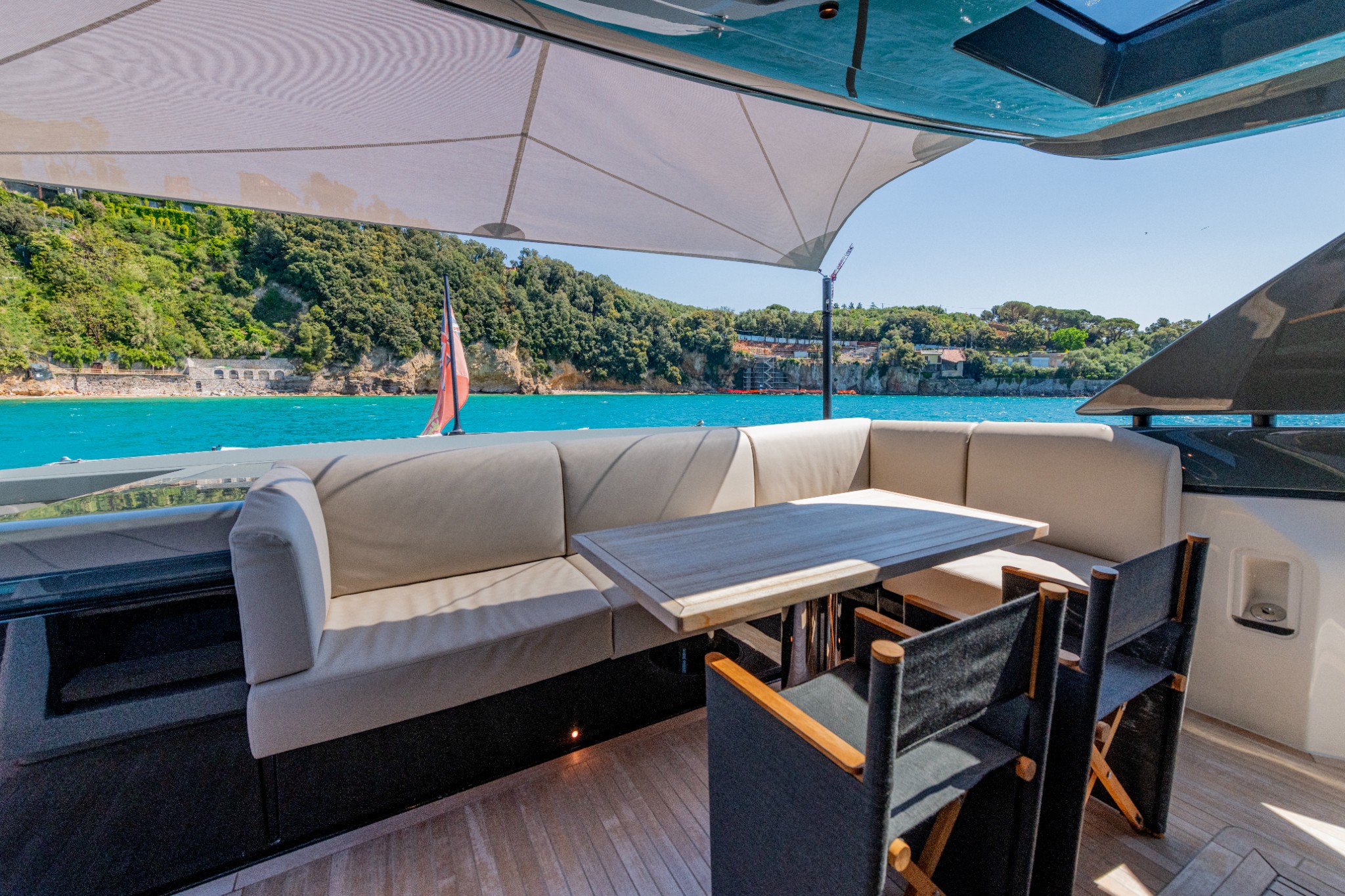 Sofa with teak table, glass skylight, ladder with manual hatch leading to teak sundeck with sunpad, sun awning with carbon poles and two Roda director chairs